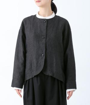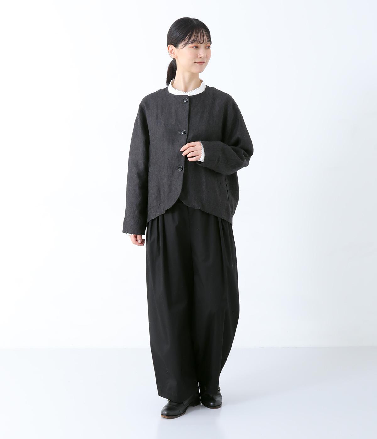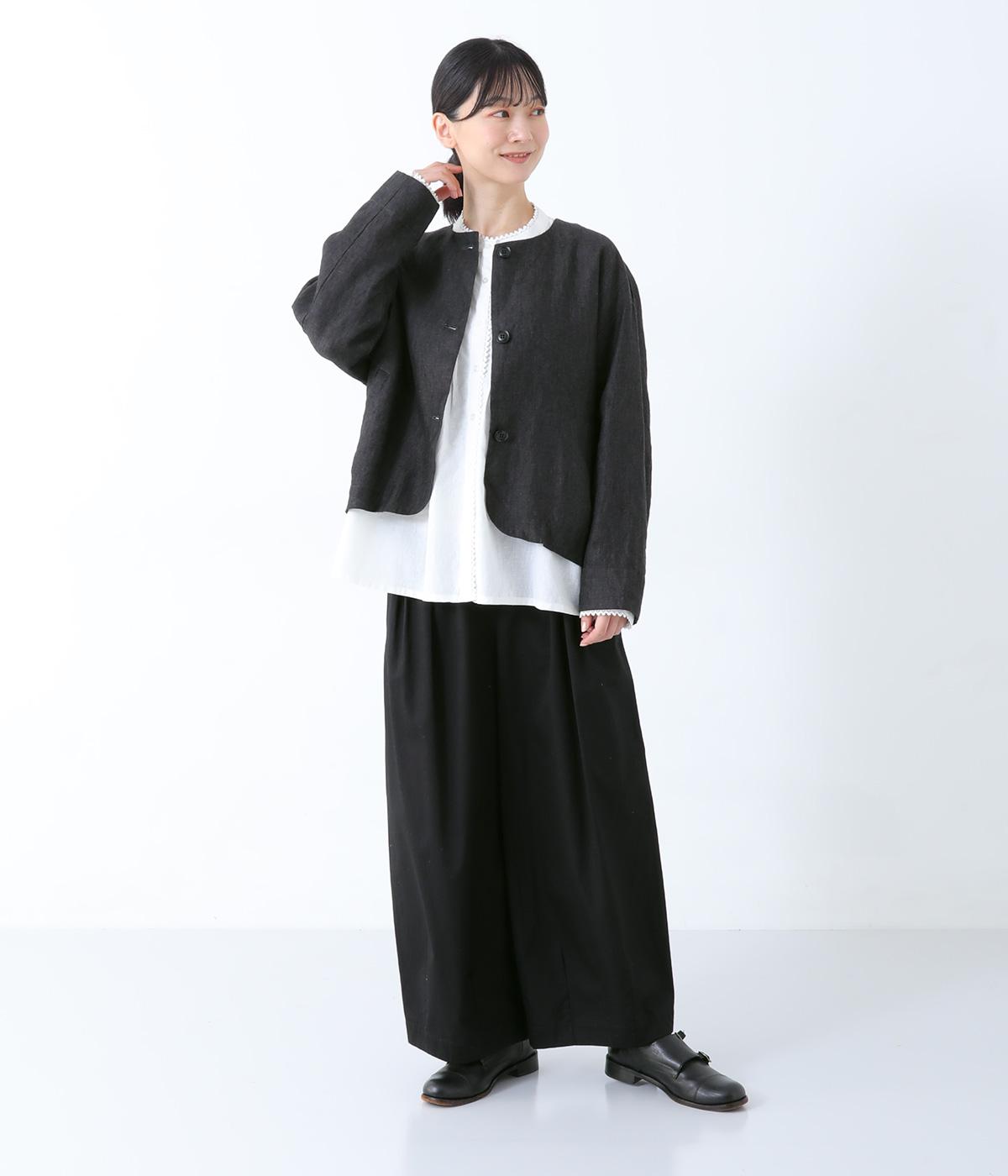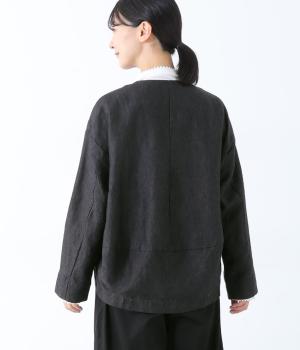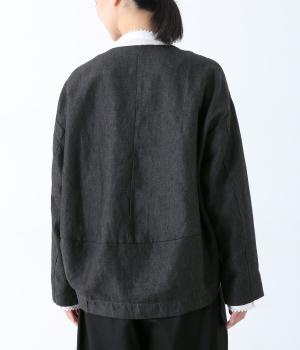 後ろ身頃に切り替えを入れ、丸みのあるコクーンシルエットに仕上げたジャケット。フロント裾もラウンドさせ、女性らしいやわらかな印象です。アームホールは広めに設定しているので、さまざまなインナーに羽織りやすいのが◎。前の着丈を短くし、ボトムスとのバランスを整えています。