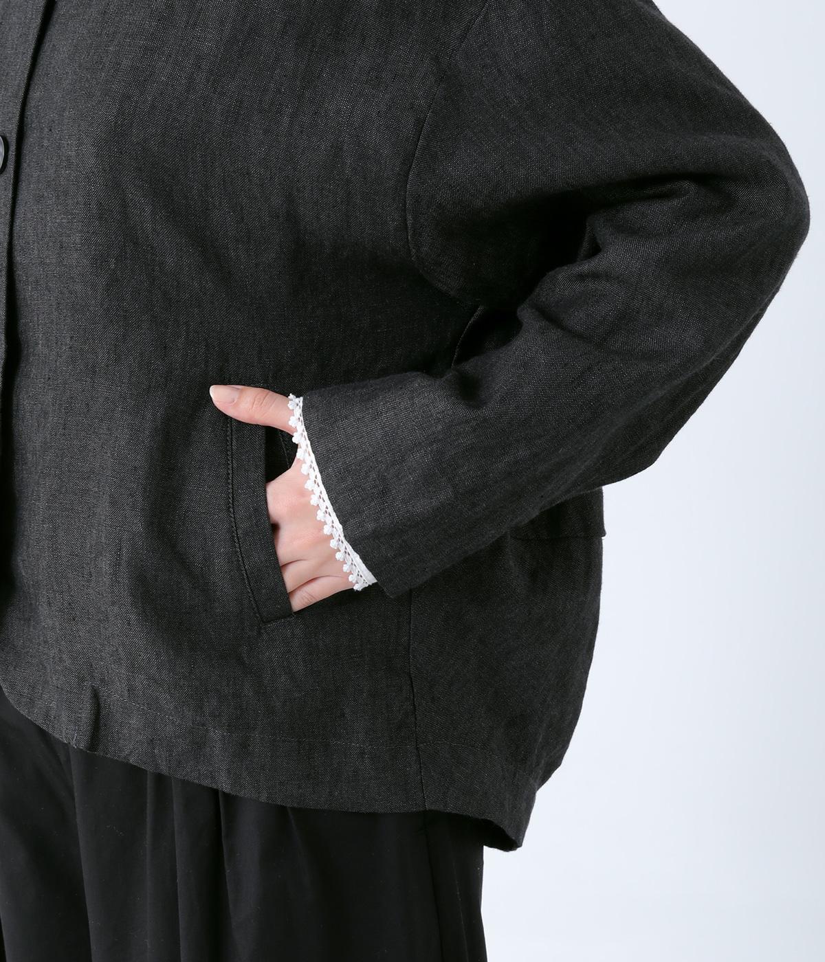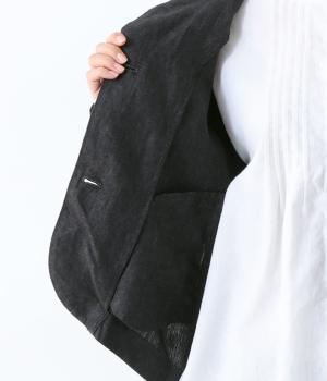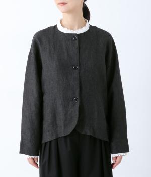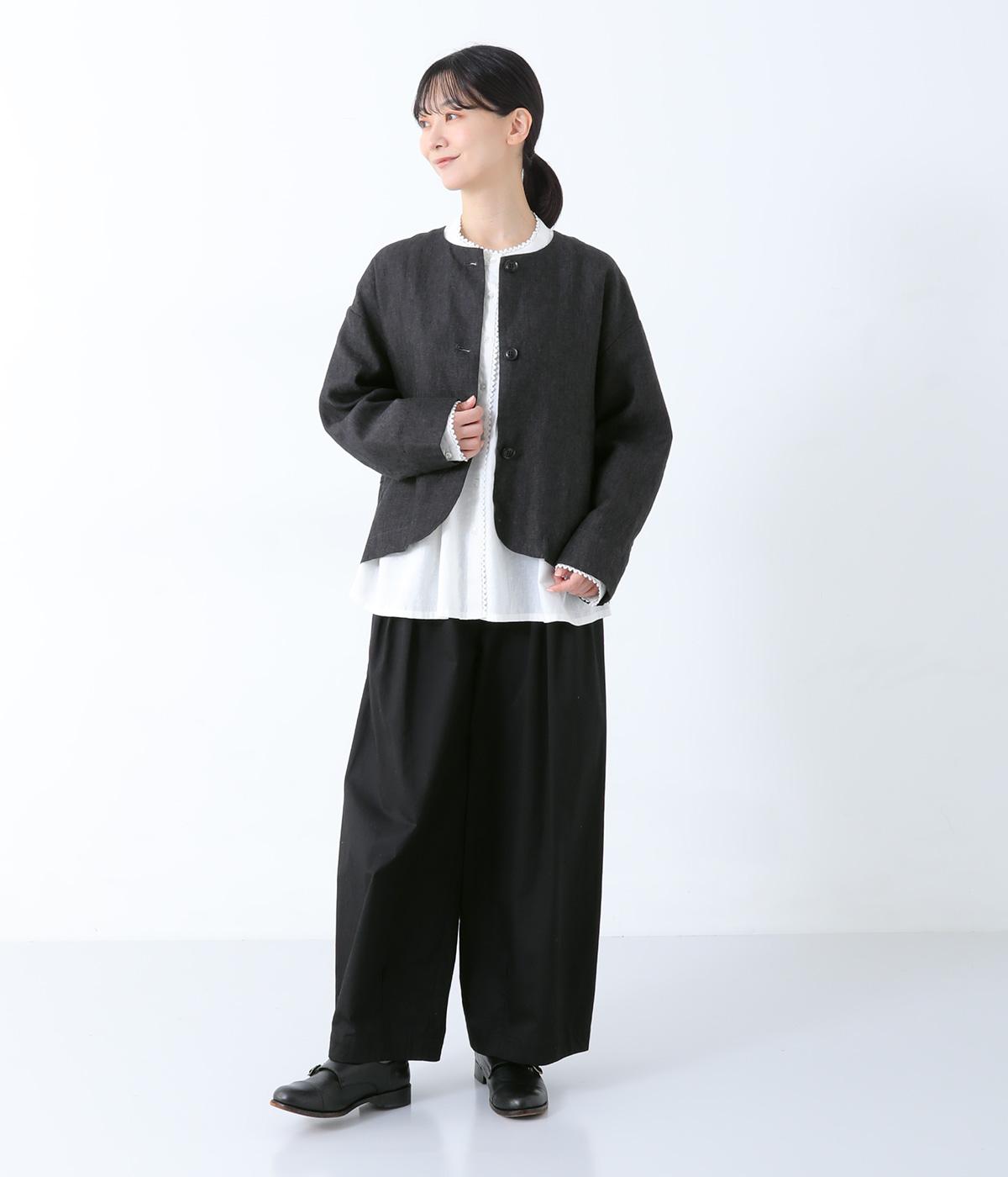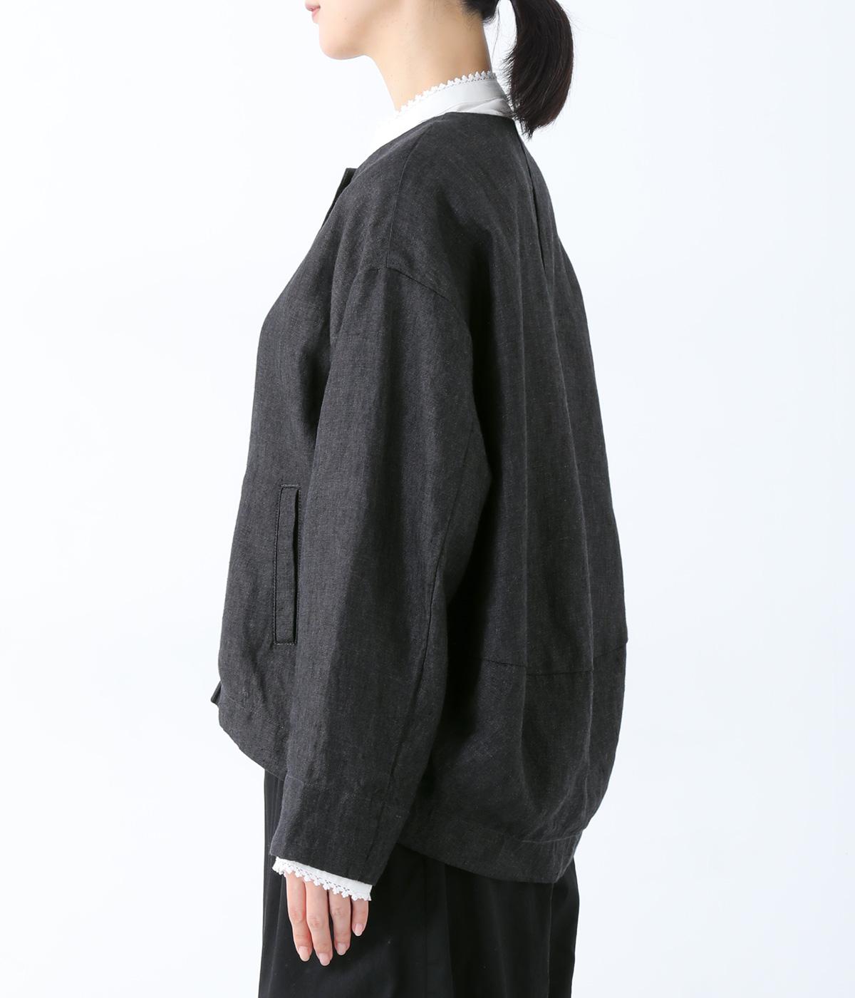 後ろ身頃に切り替えを入れ、丸みのあるコクーンシルエットに仕上げたジャケット。フロント裾もラウンドさせ、女性らしいやわらかな印象です。アームホールは広めに設定しているので、さまざまなインナーに羽織りやすいのが◎。前の着丈を短くし、ボトムスとのバランスを整えています。