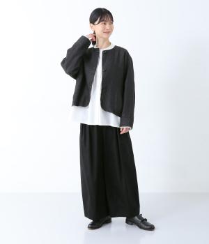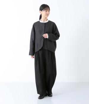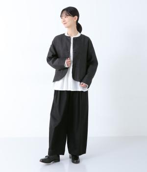 太番手のリネン糸を使用して密度高く織り上げられた、ハリコシのある普段使いにぴったりの生地。色ムラやネップの見えるナチュラルな風合いが魅力で、カジュアルにもきれいめにも合わせられます。