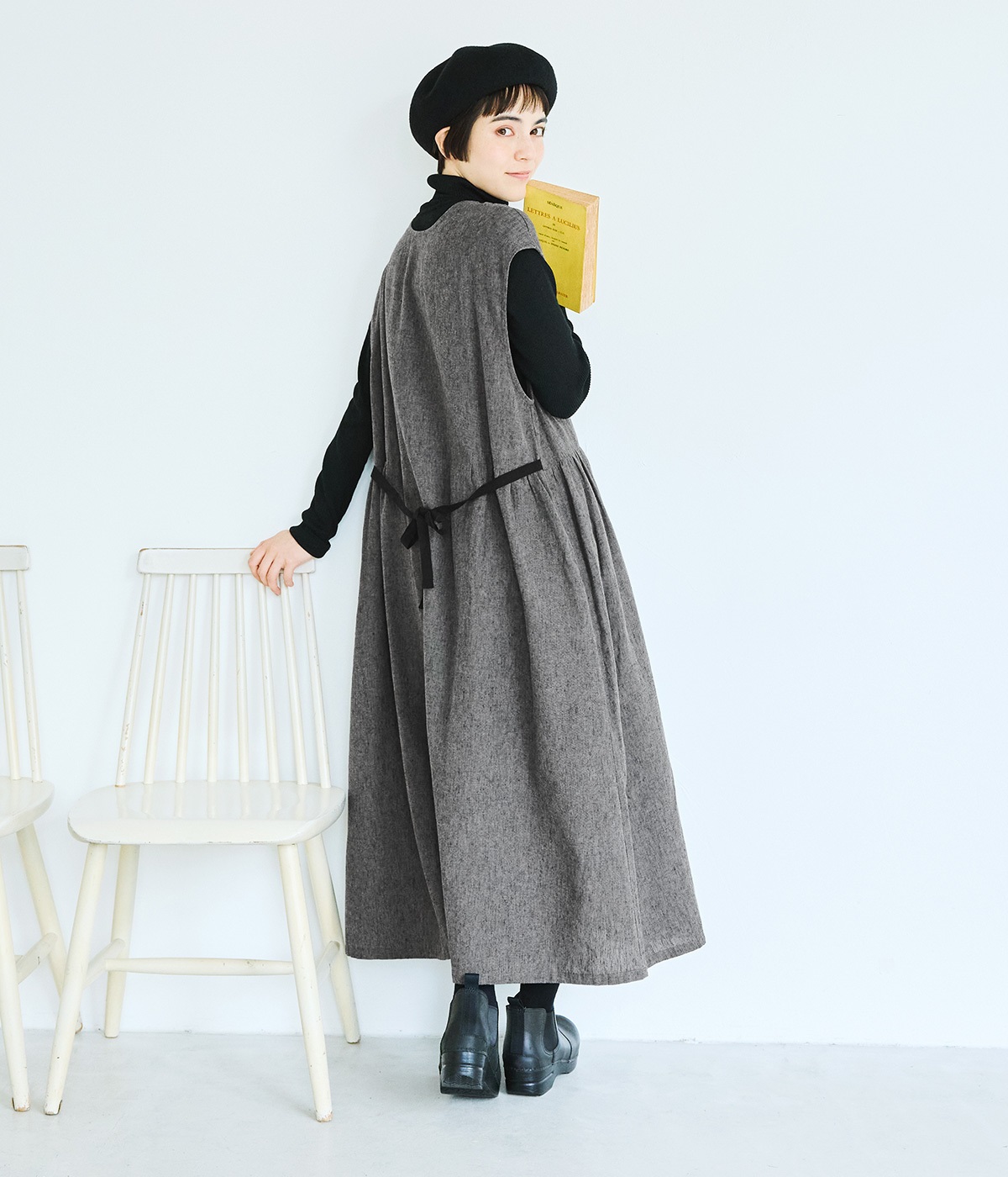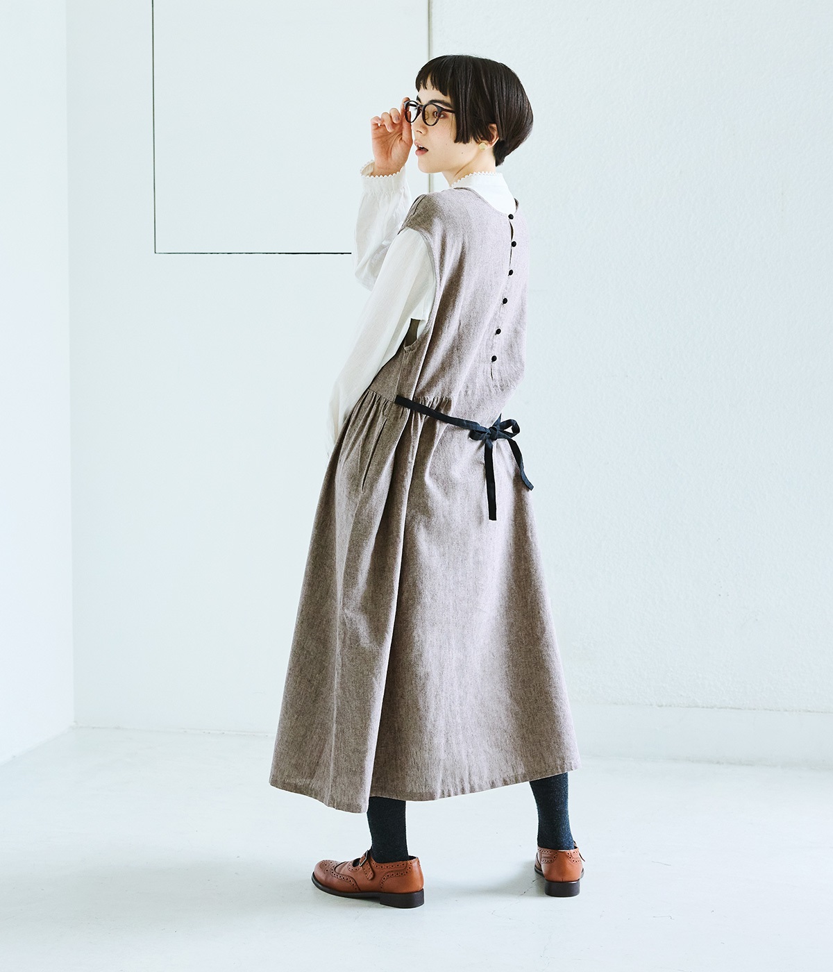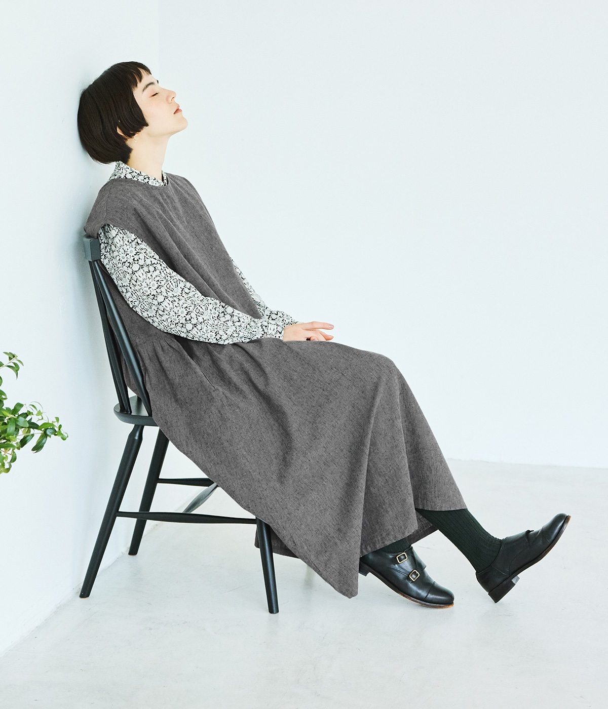 デイリーにも特別な日にも自然に馴染む、落ち着いた色合いとシンプルなデザインのジャンパースカート。その日の気分やコーディネートに合わせて、自分なりのアレンジをお楽しみください。