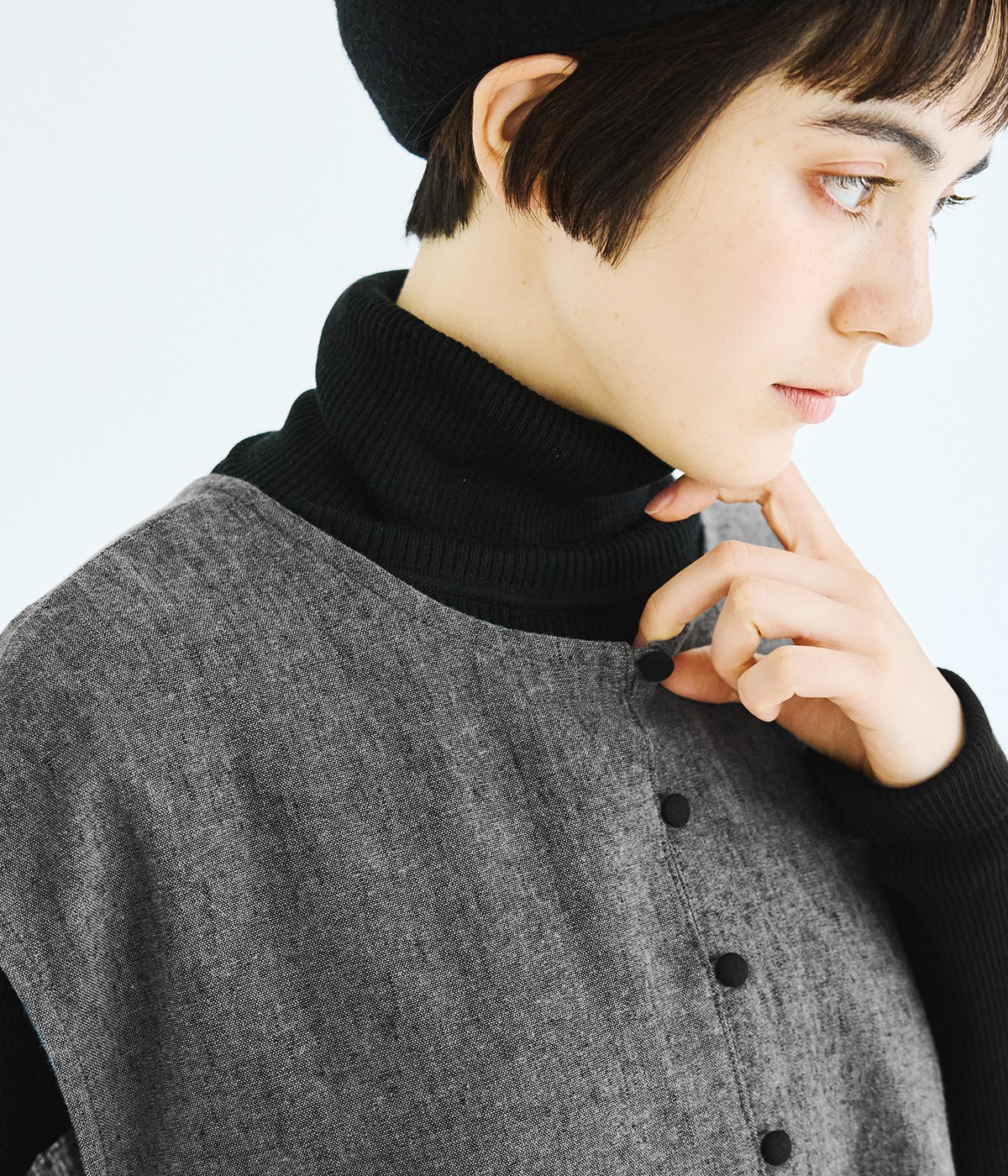 肩まわりをさりげなく包み込む、安心感のあるデザイン。首元が広く浅めに開いているので、タートルネックや襟に装飾のあるインナーとの相性も抜群です。