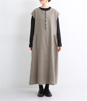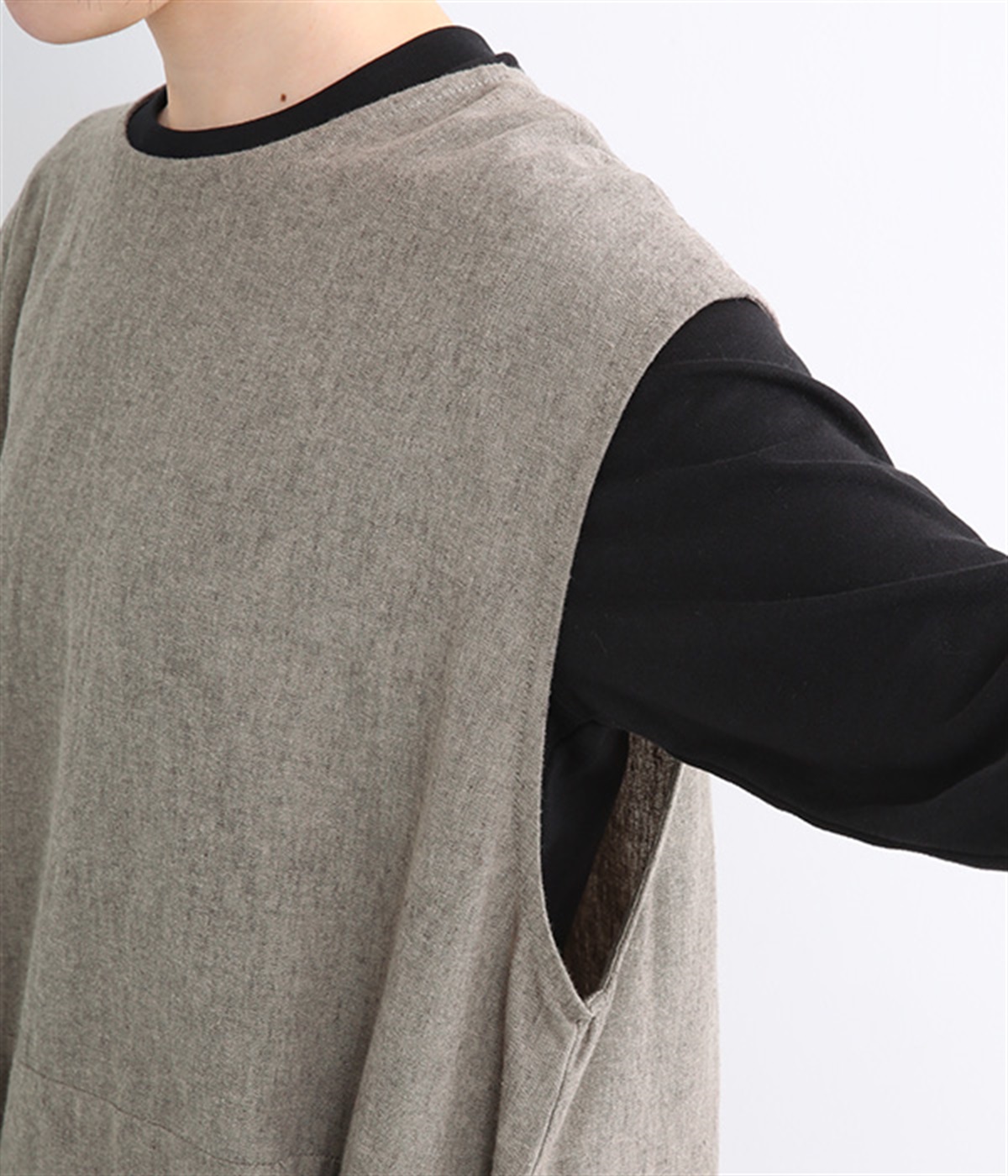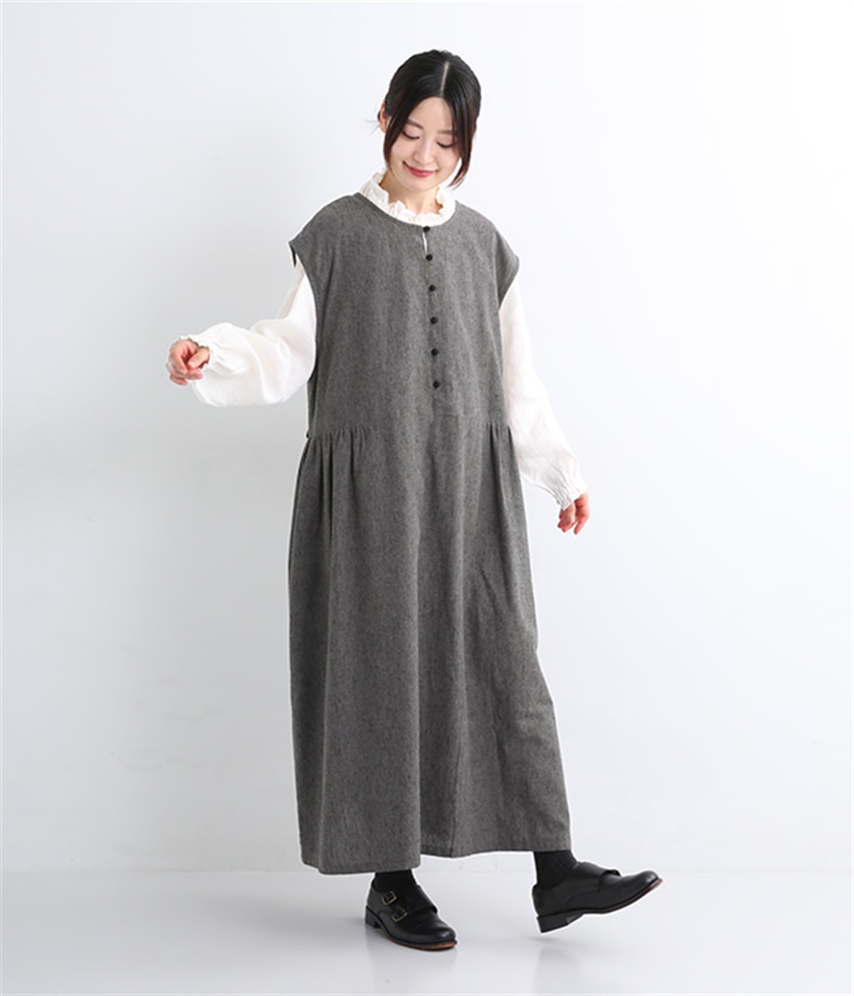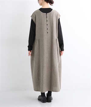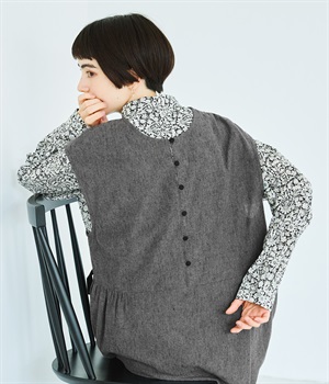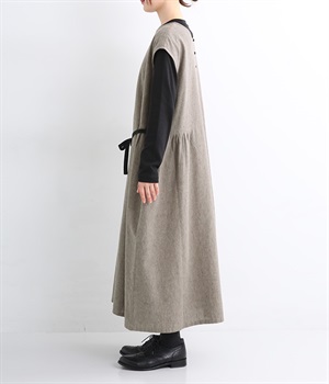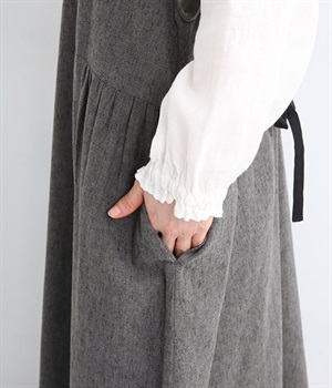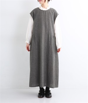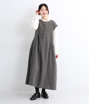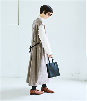 アームホールが広く、厚手のトップスを重ねればロングシーズン重宝します。中に着るアイテム次第で温度調整できるのも、ジャンパースカートならではの魅力。