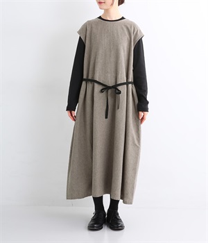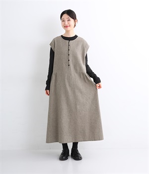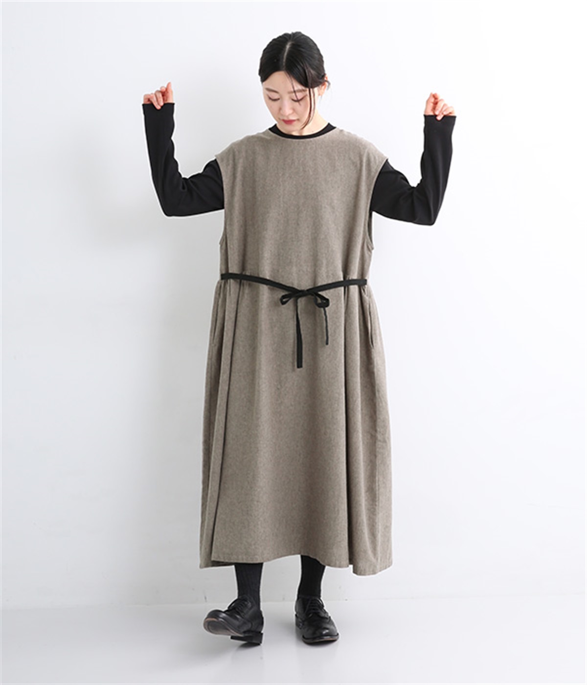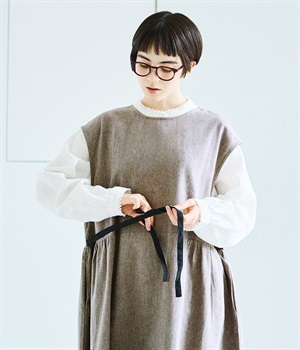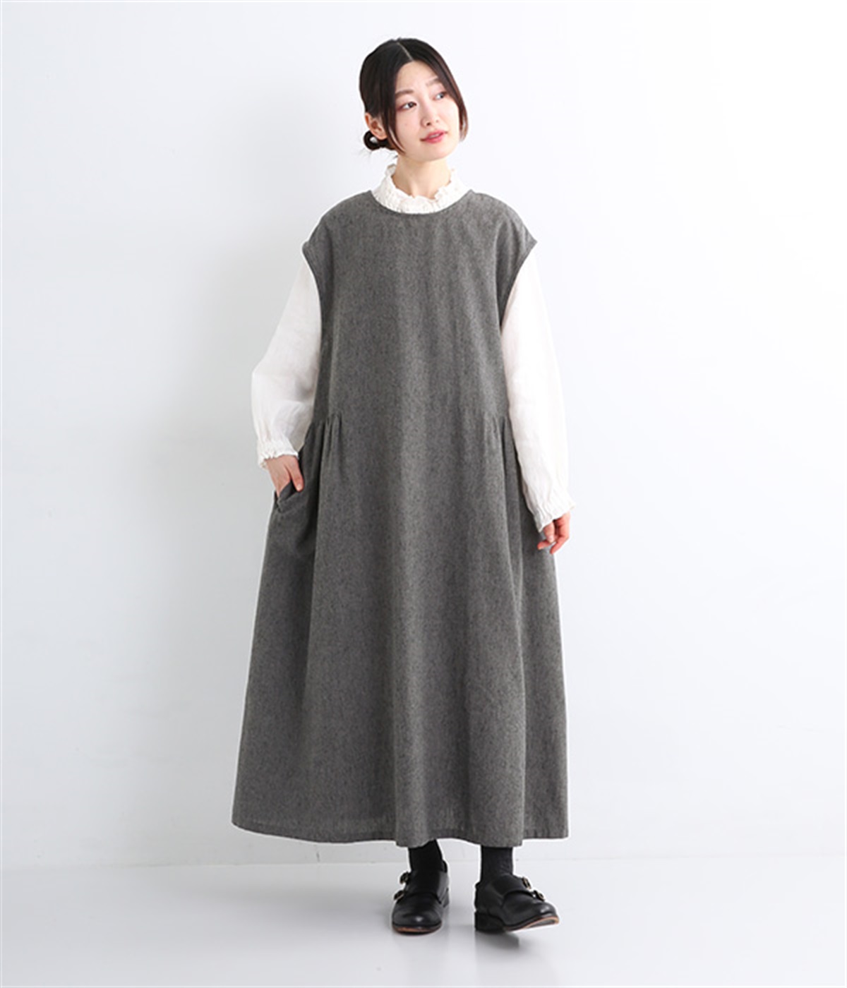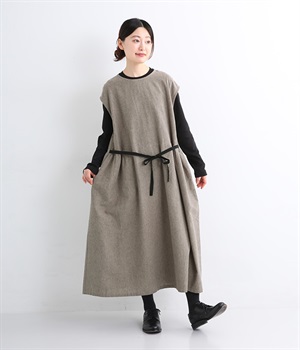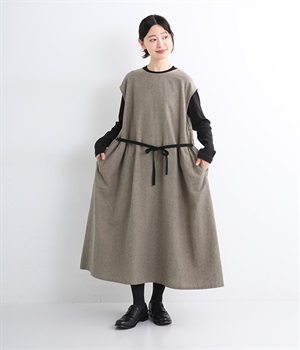 風合い豊かなベージュは、フリルのブラウスで甘さを添えたクラシカルなコーディネートに。ゆったりとしたシルエットながらも上品に着こなせて、さまざまなシーンで活躍するジャンパースカートです。