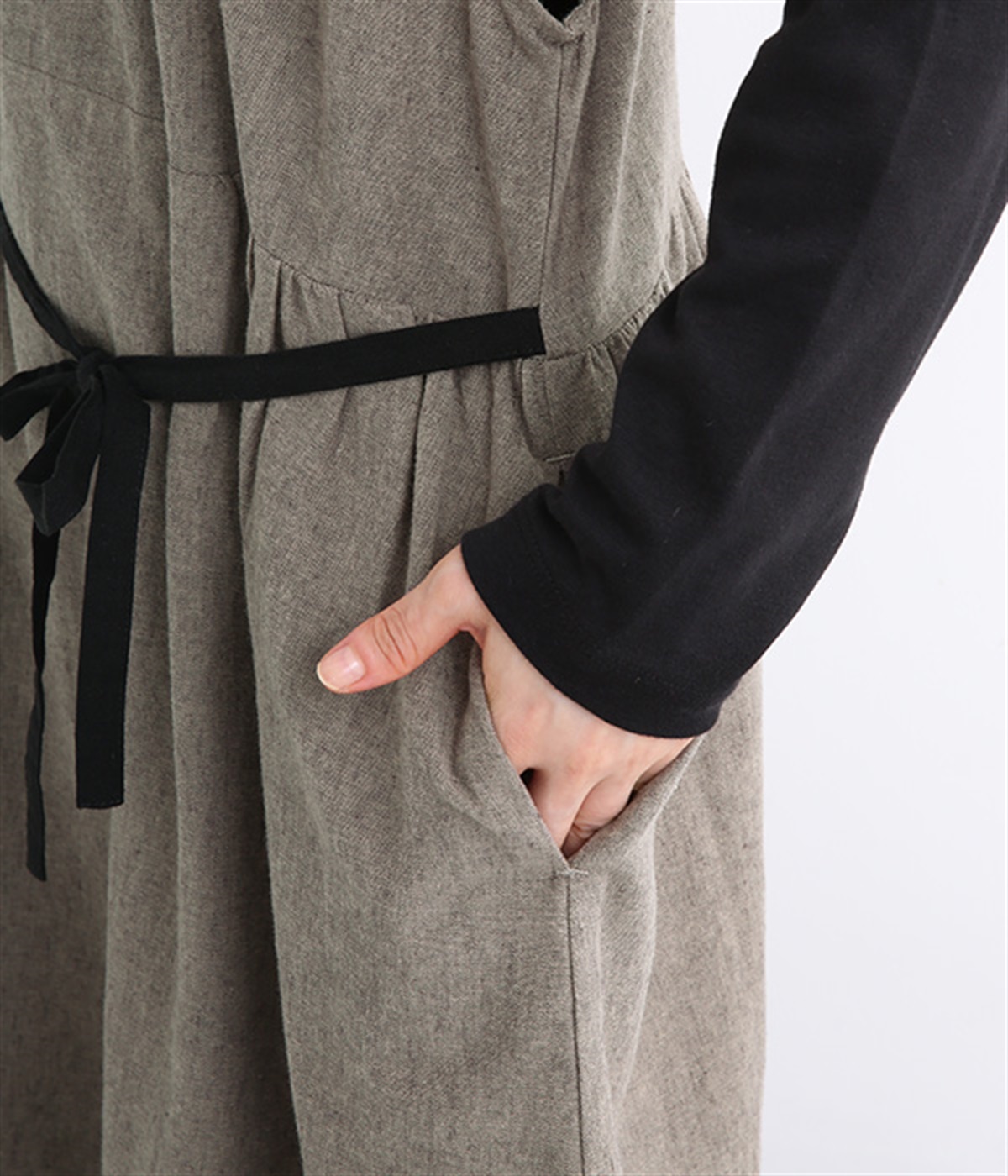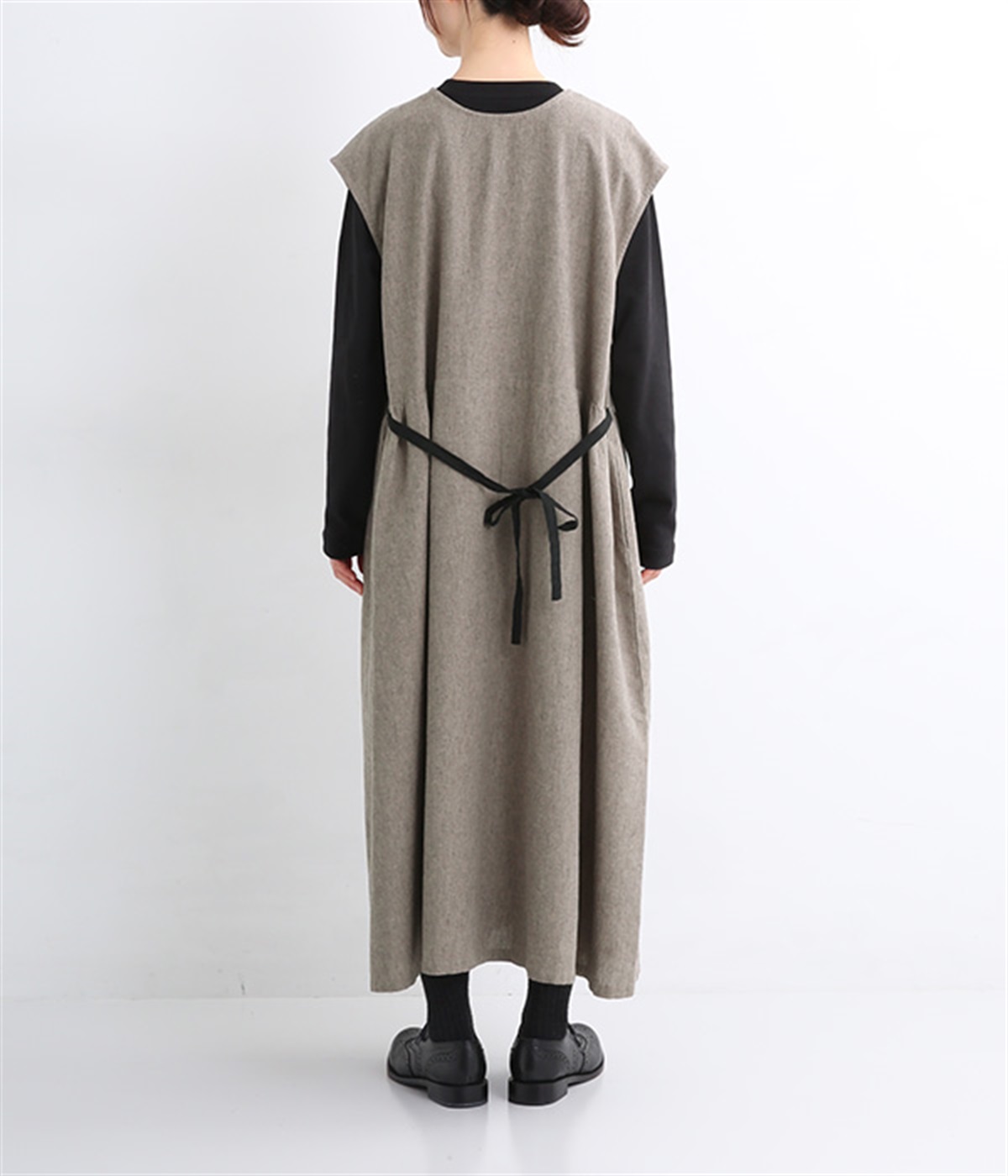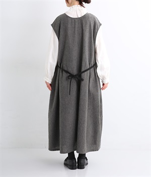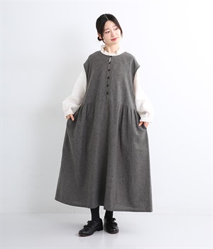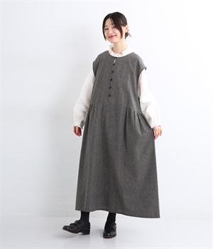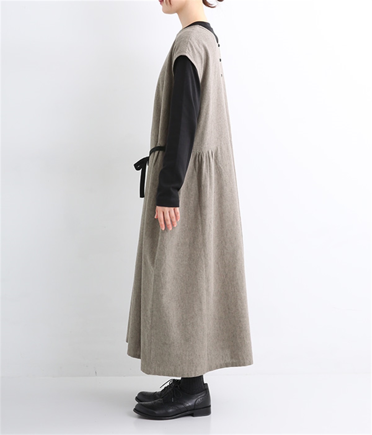 風合い豊かなベージュは、フリルのブラウスで甘さを添えたクラシカルなコーディネートに。ゆったりとしたシルエットながらも上品に着こなせて、さまざまなシーンで活躍するジャンパースカートです。