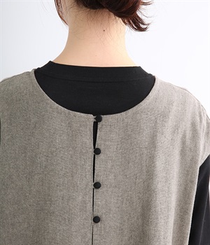ボタン部分を前後どちらにしても着られる2way仕様。配色のボタンとリボンが装いのアクセントに。ウエストのリボンはお好みで、前でも後ろでも結ぶことができます。