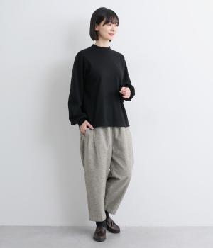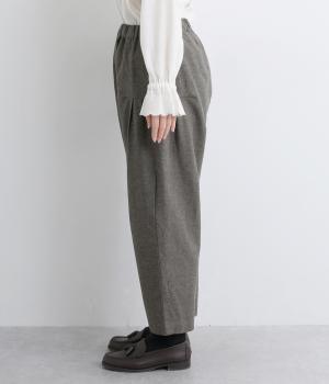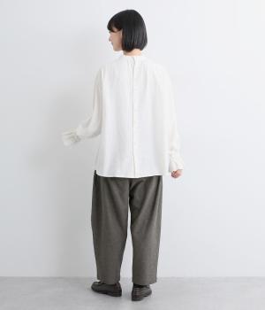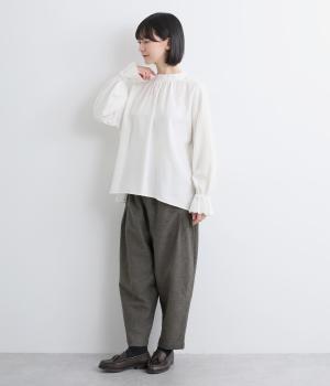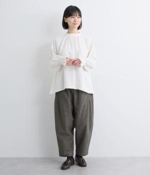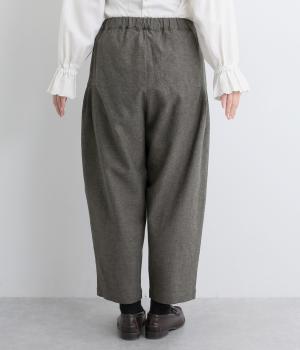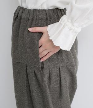 ナチュラル素材でデイリー使いしやすくもトラッドな雰囲気に仕立てました。タックを入れたコクーンシルエットがスタイリングのワンポイントに。裾まわりはすっきりまとめているので、レースアップシューズなどとも好相性です。