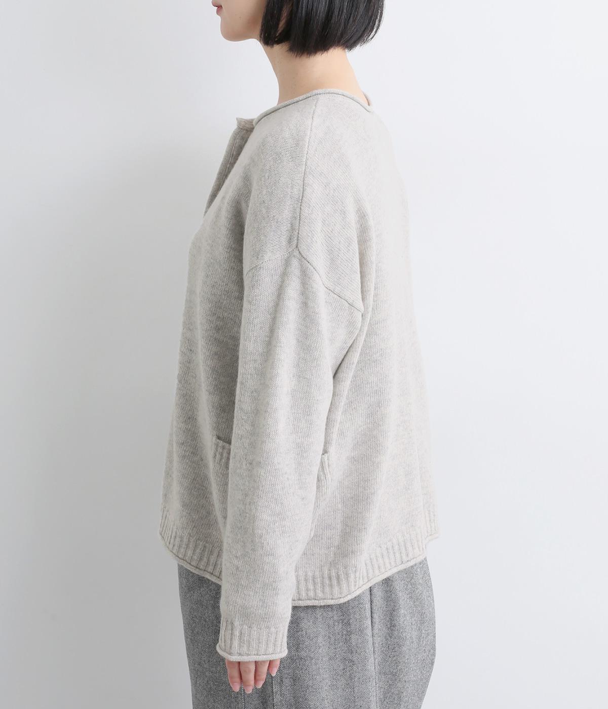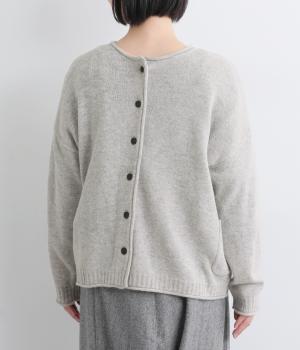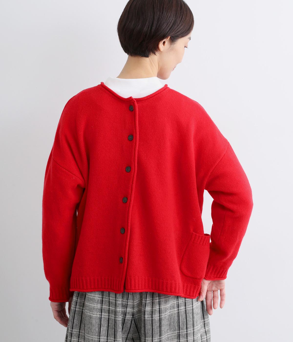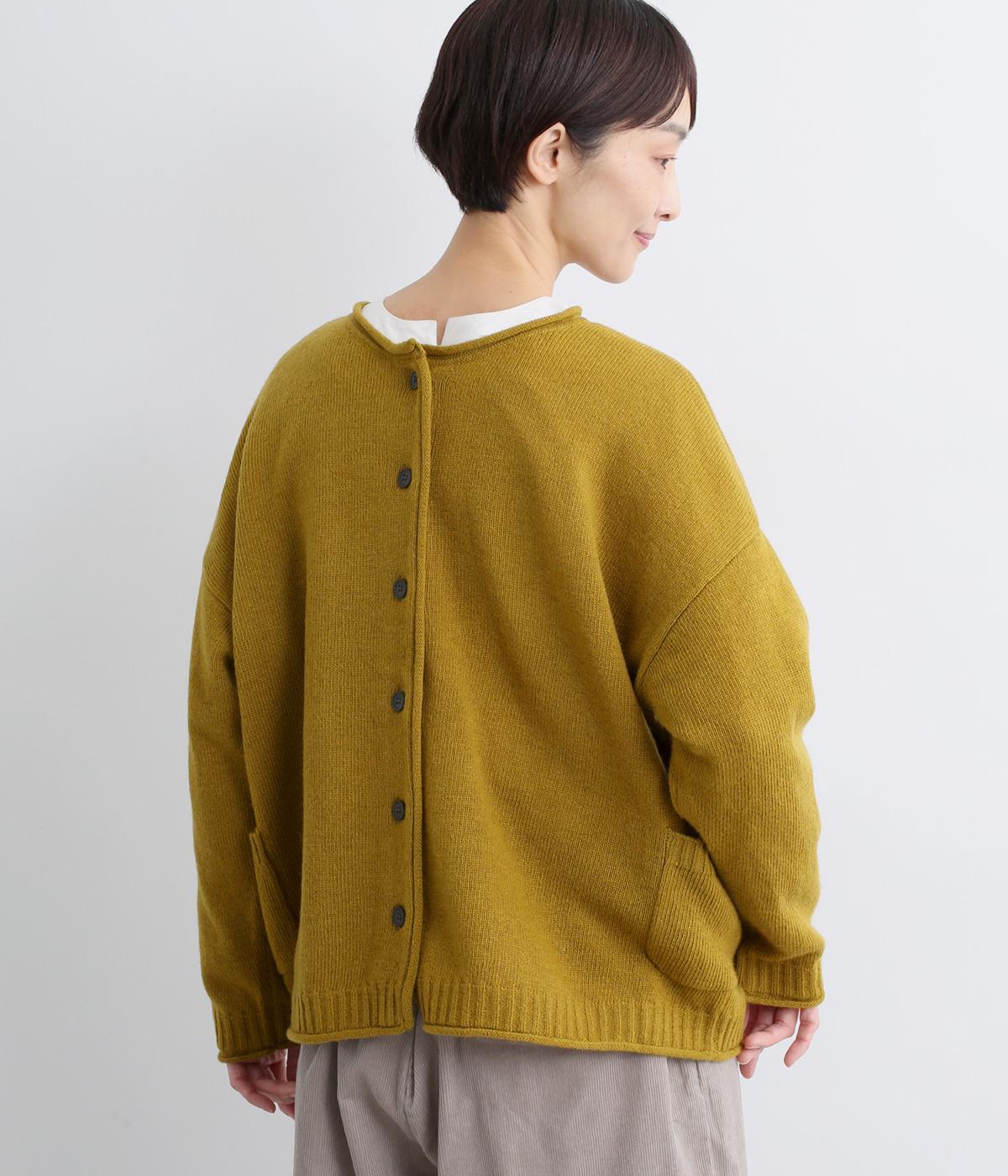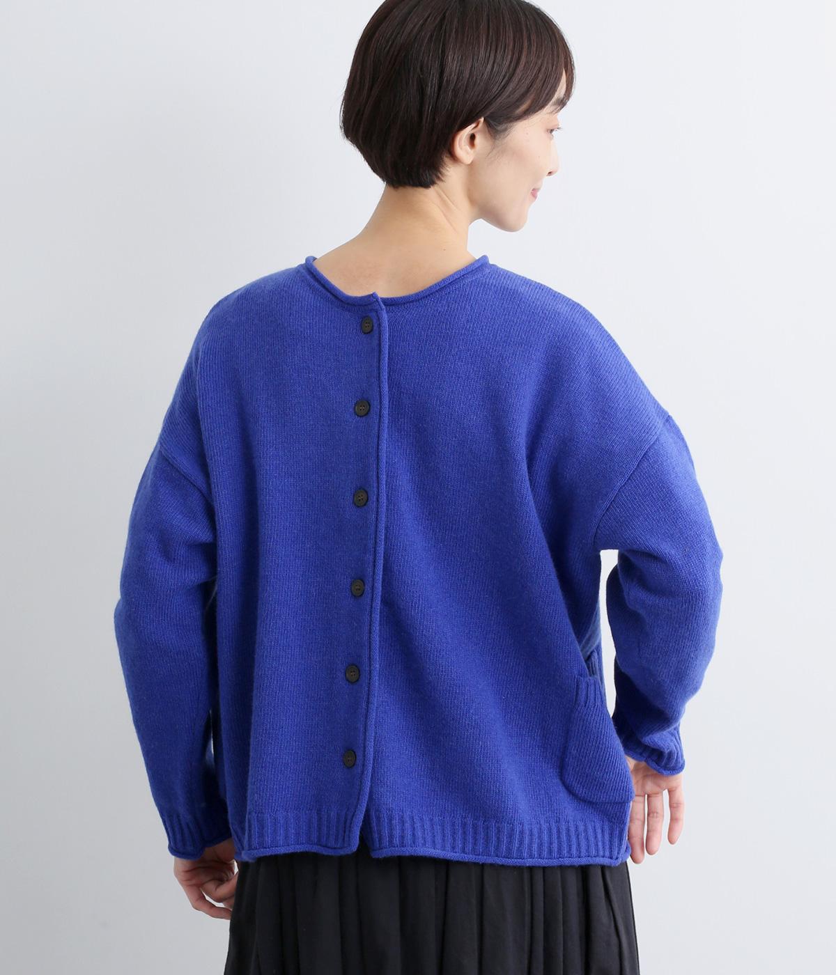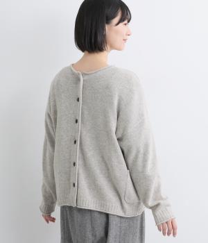 前後をまたぐようについたサイドポケットが特徴的な一枚。カーディガンにも、後ろあきのプルオーバーにもなる前後2wayで着こなしの幅が広がります。くるんと丸まったトリミングが可愛らしいニュアンスに。