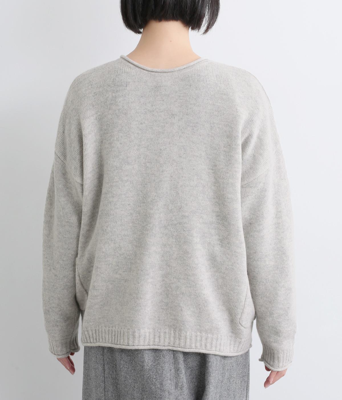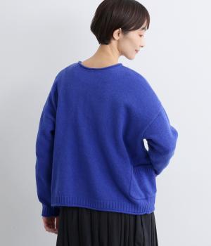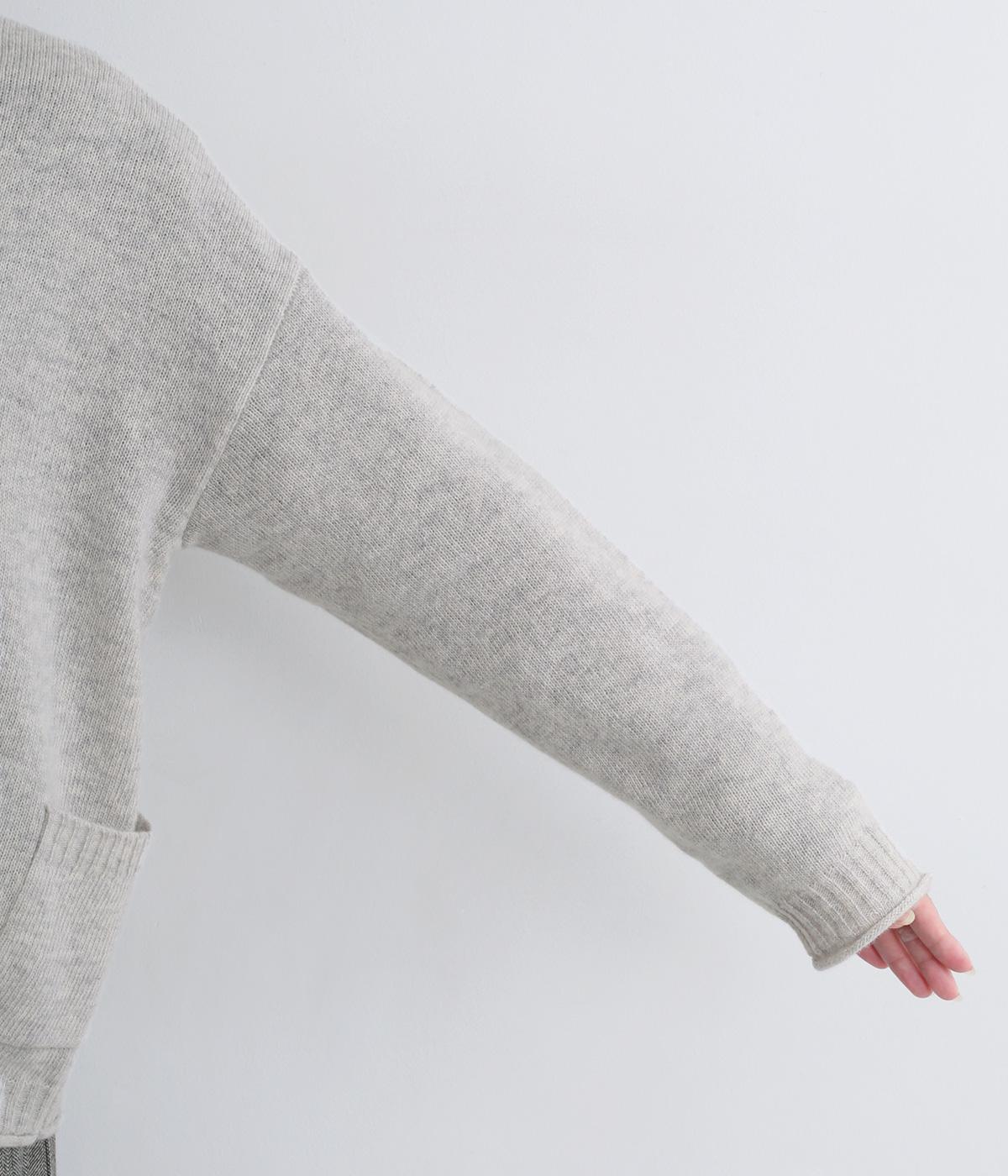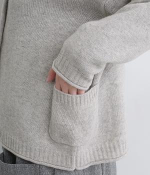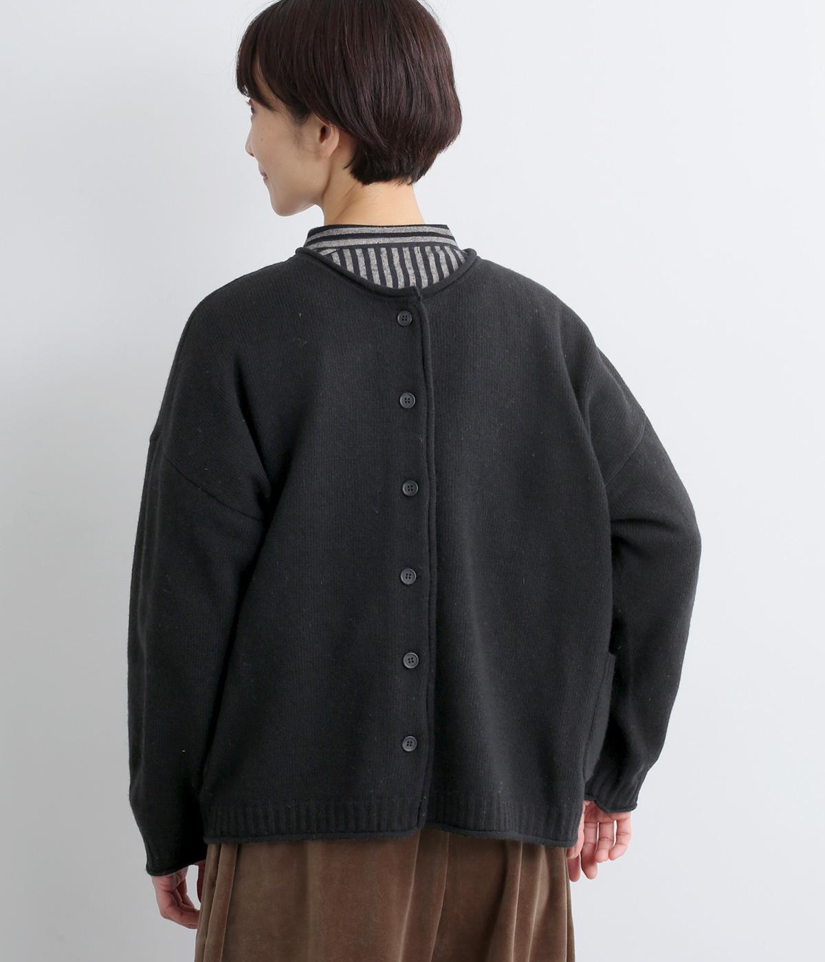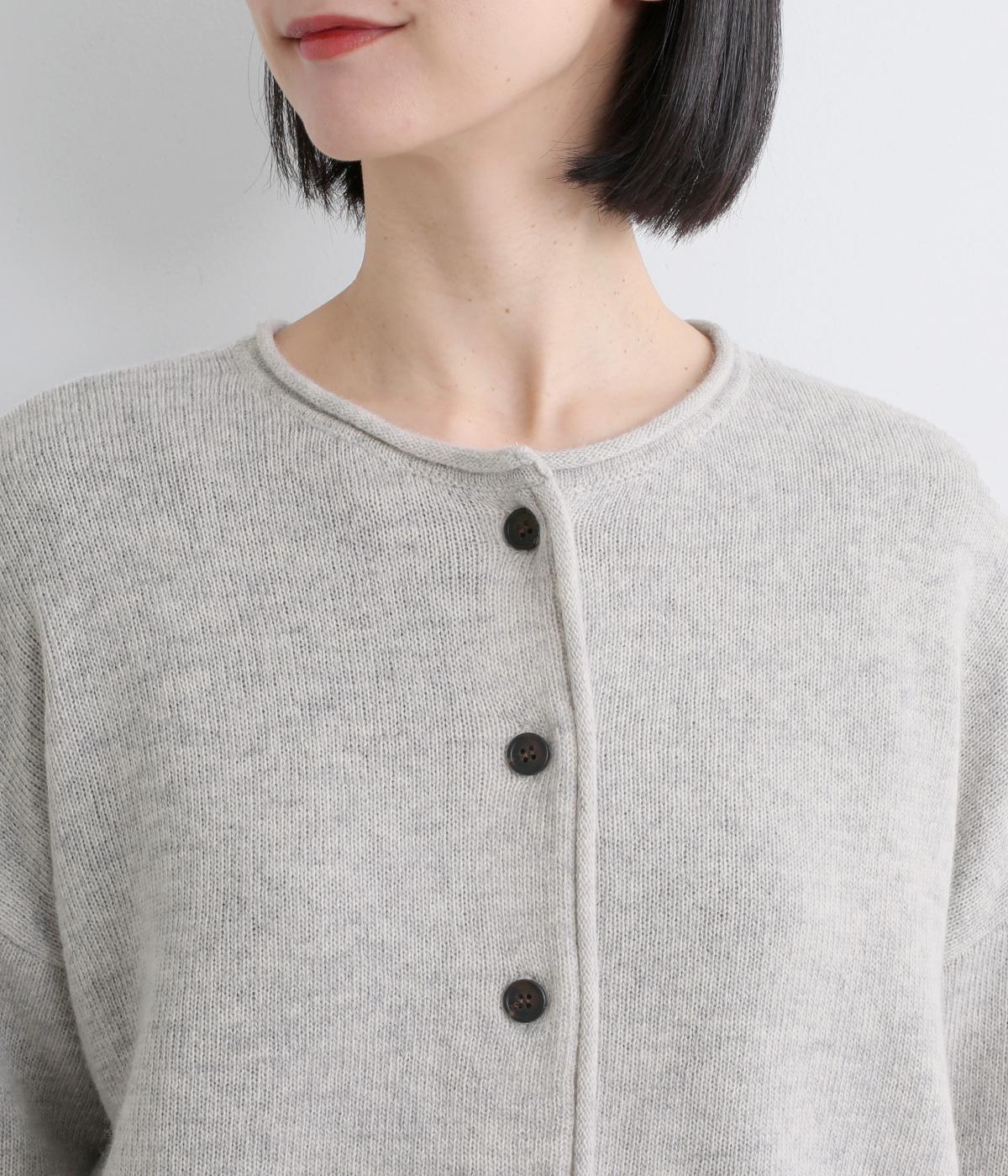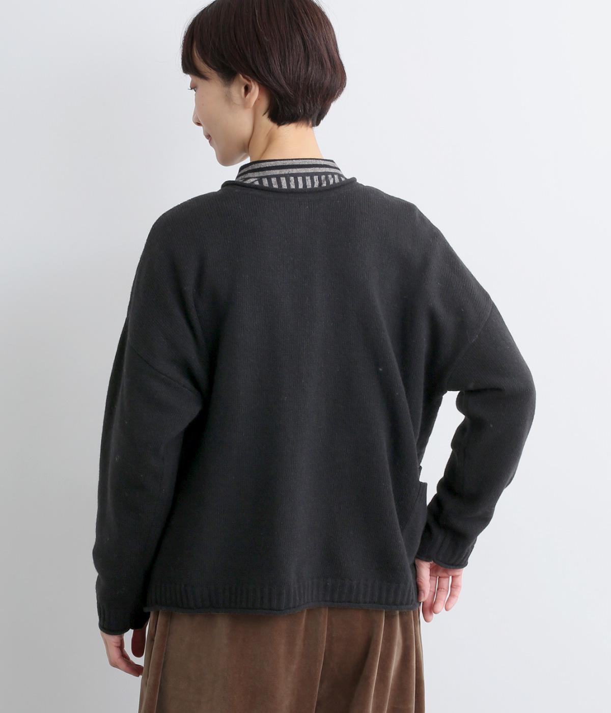 前後をまたぐようについたサイドポケットが特徴的な一枚。カーディガンにも、後ろあきのプルオーバーにもなる前後2wayで着こなしの幅が広がります。くるんと丸まったトリミングが可愛らしいニュアンスに。