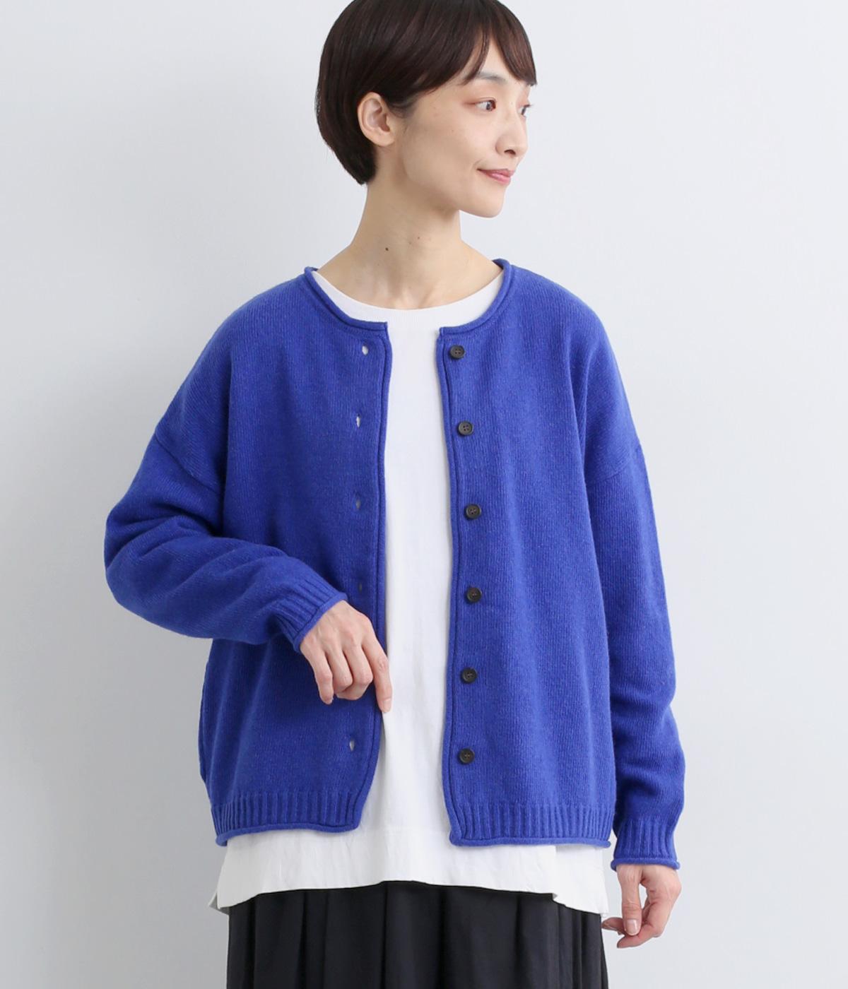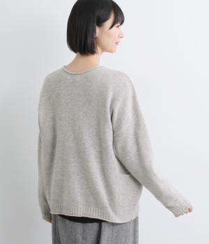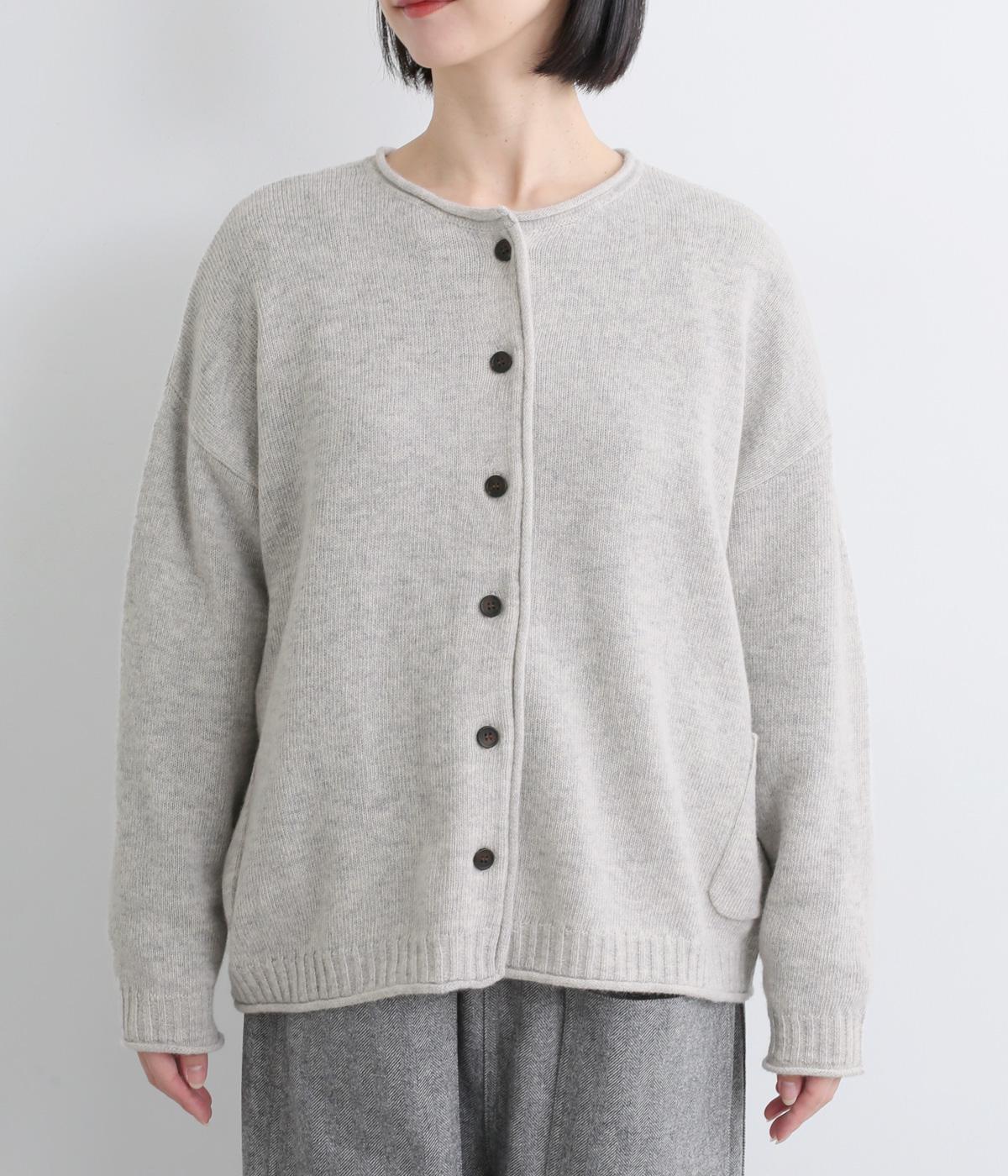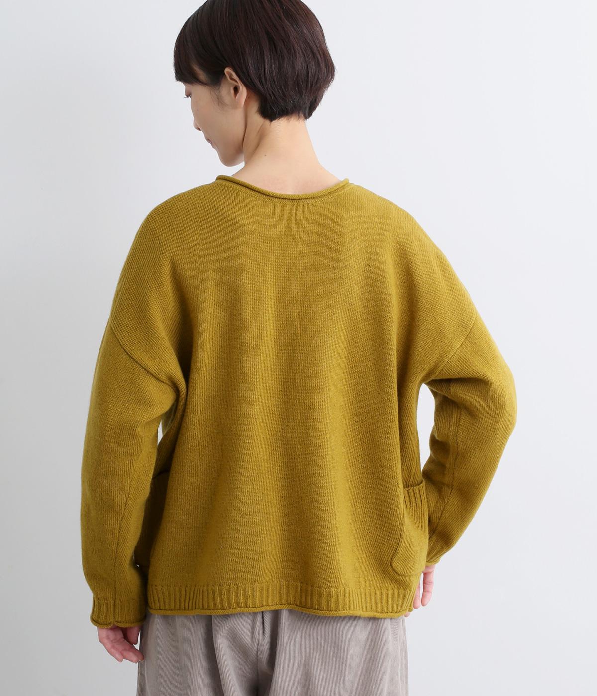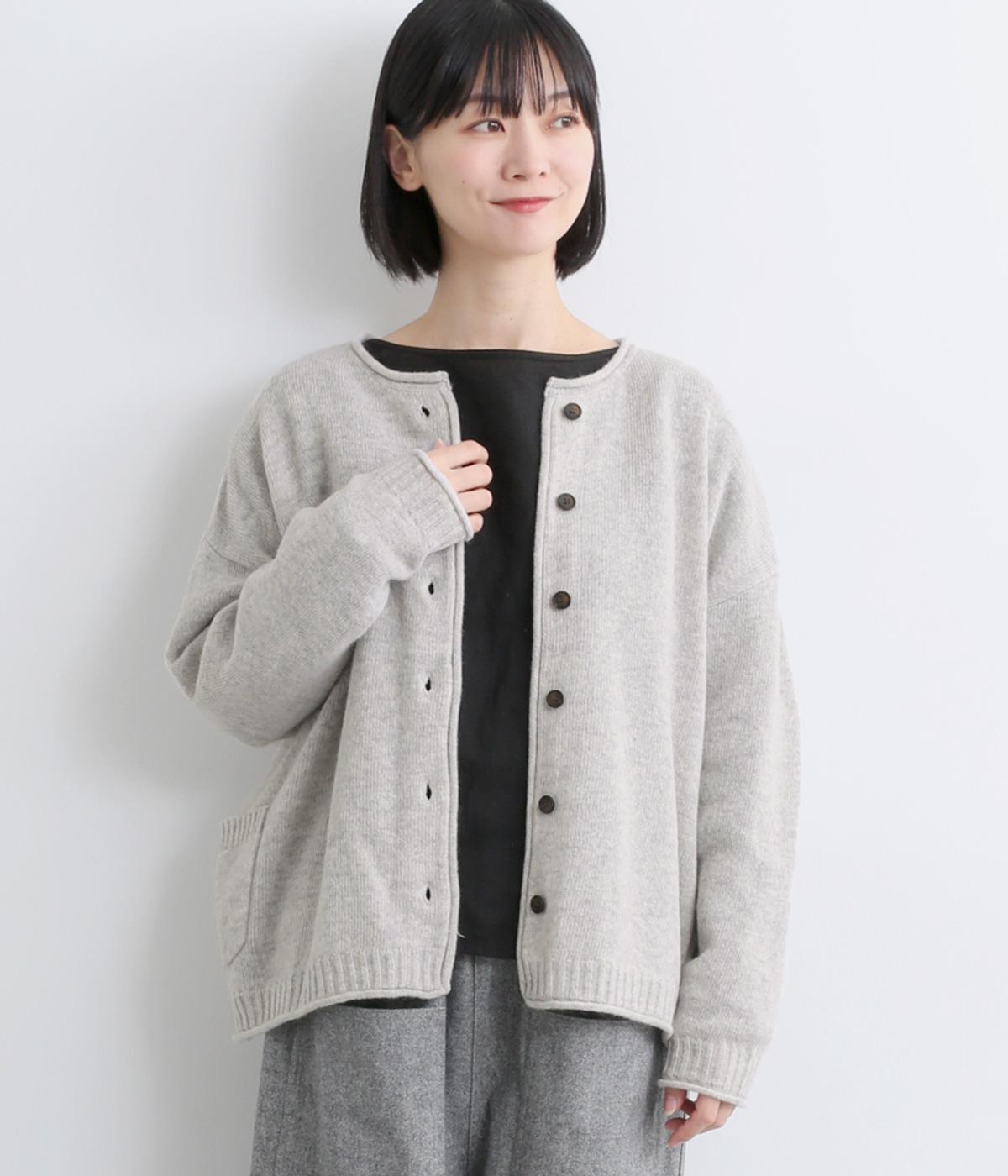 前後をまたぐようについたサイドポケットが特徴的な一枚。カーディガンにも、後ろあきのプルオーバーにもなる前後2wayで着こなしの幅が広がります。くるんと丸まったトリミングが可愛らしいニュアンスに。