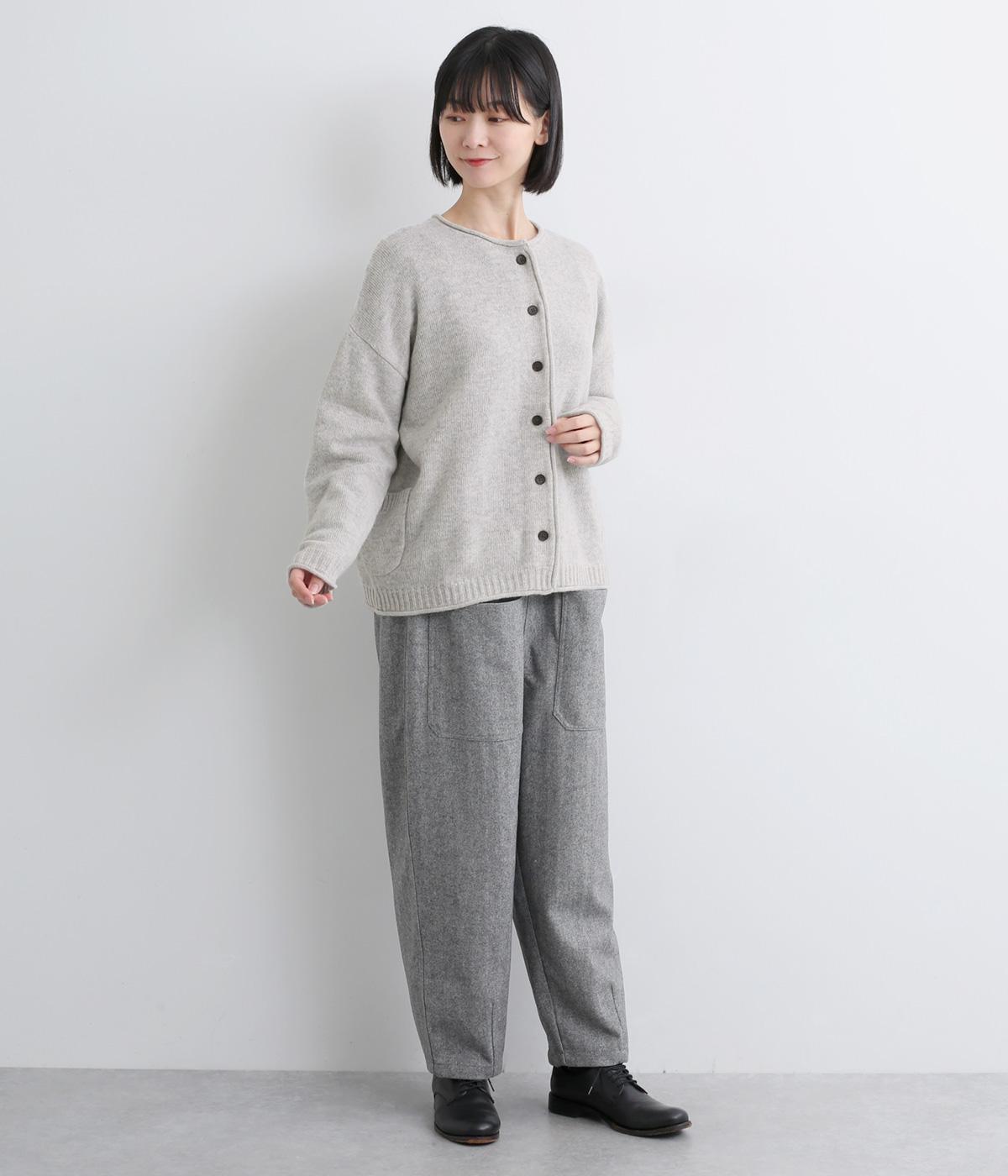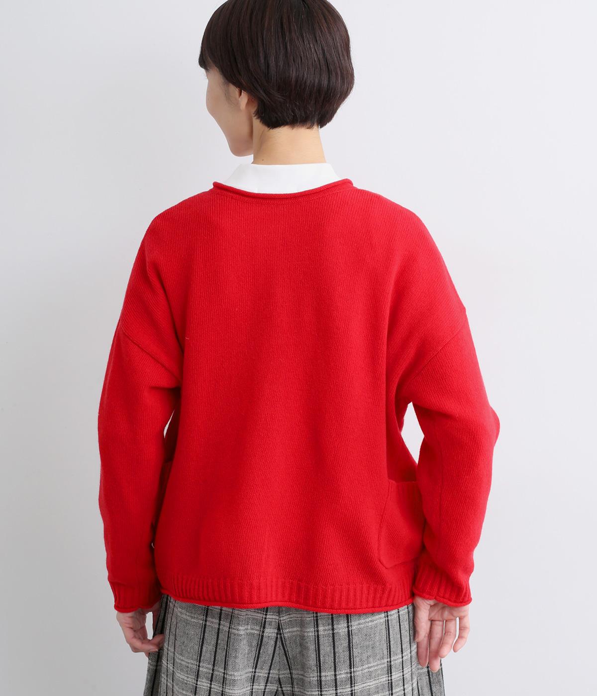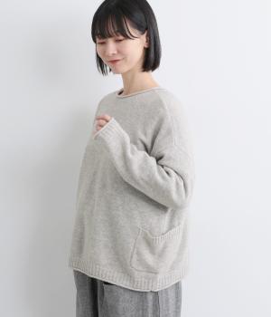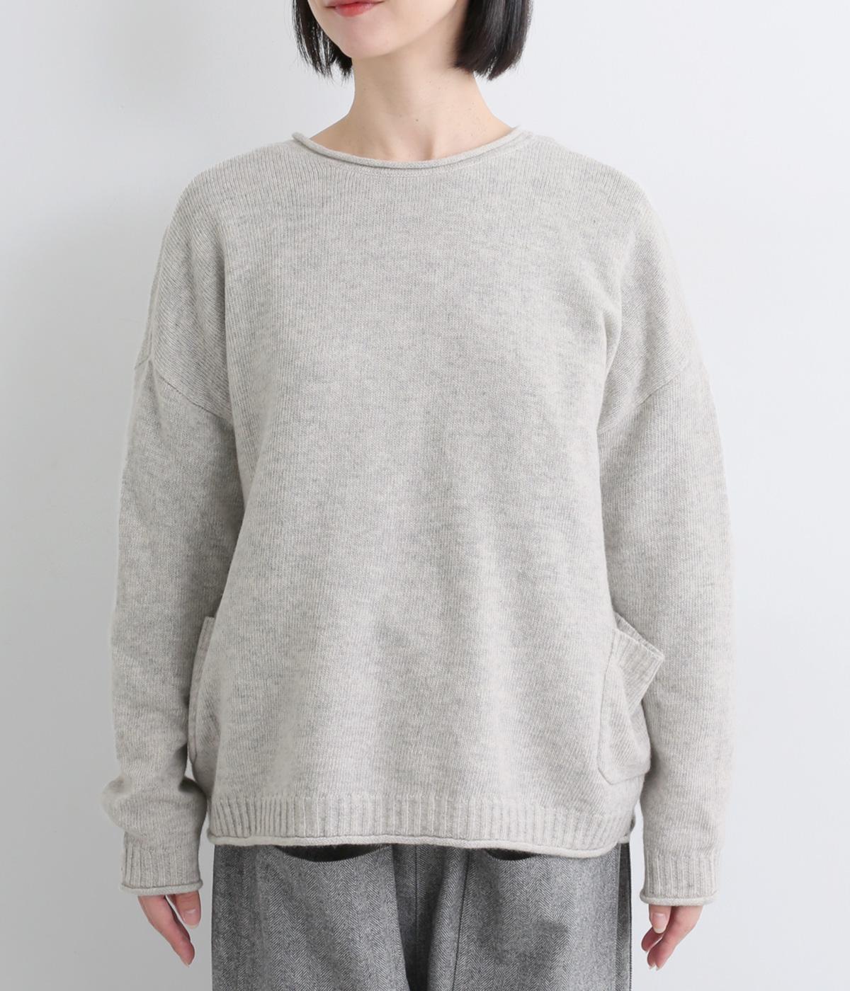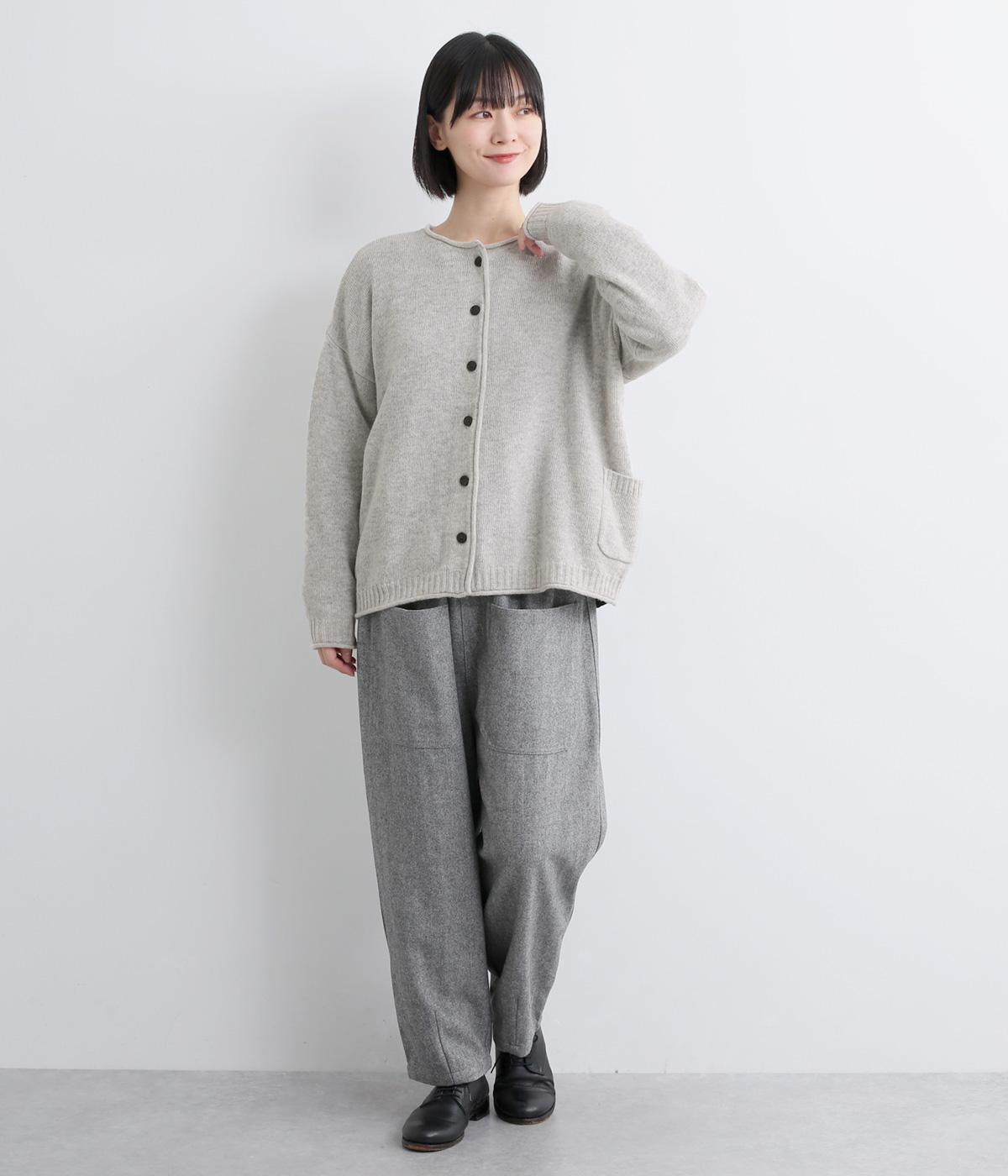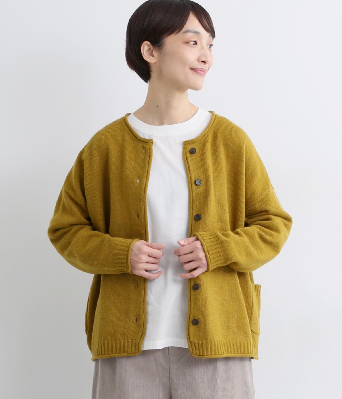 前後をまたぐようについたサイドポケットが特徴的な一枚。カーディガンにも、後ろあきのプルオーバーにもなる前後2wayで着こなしの幅が広がります。くるんと丸まったトリミングが可愛らしいニュアンスに。