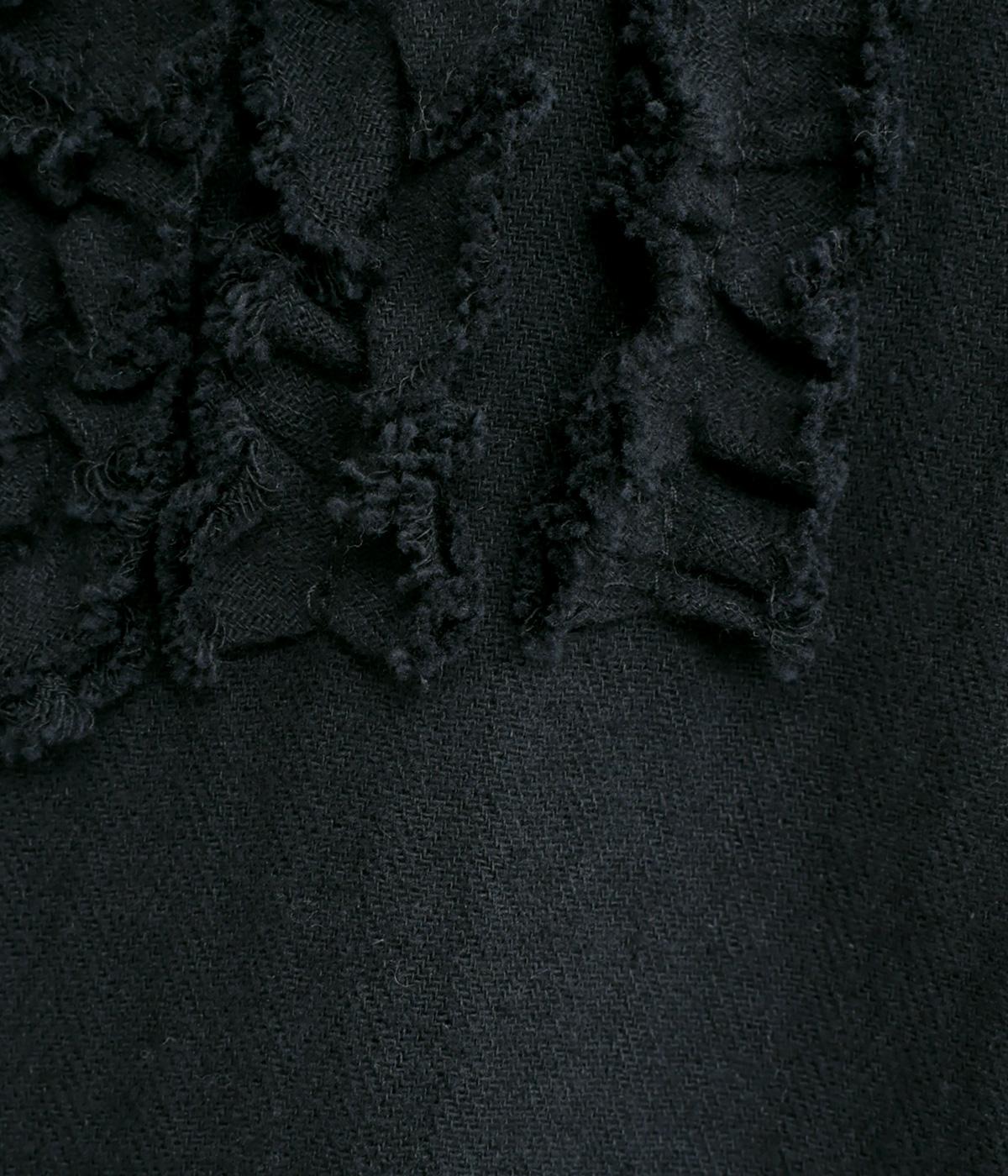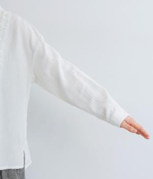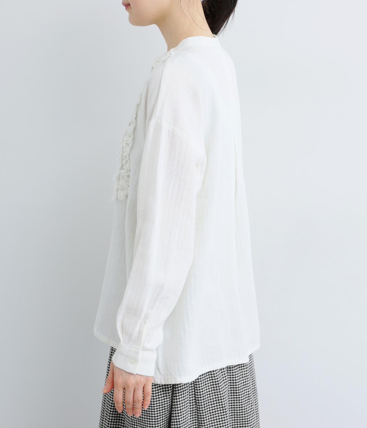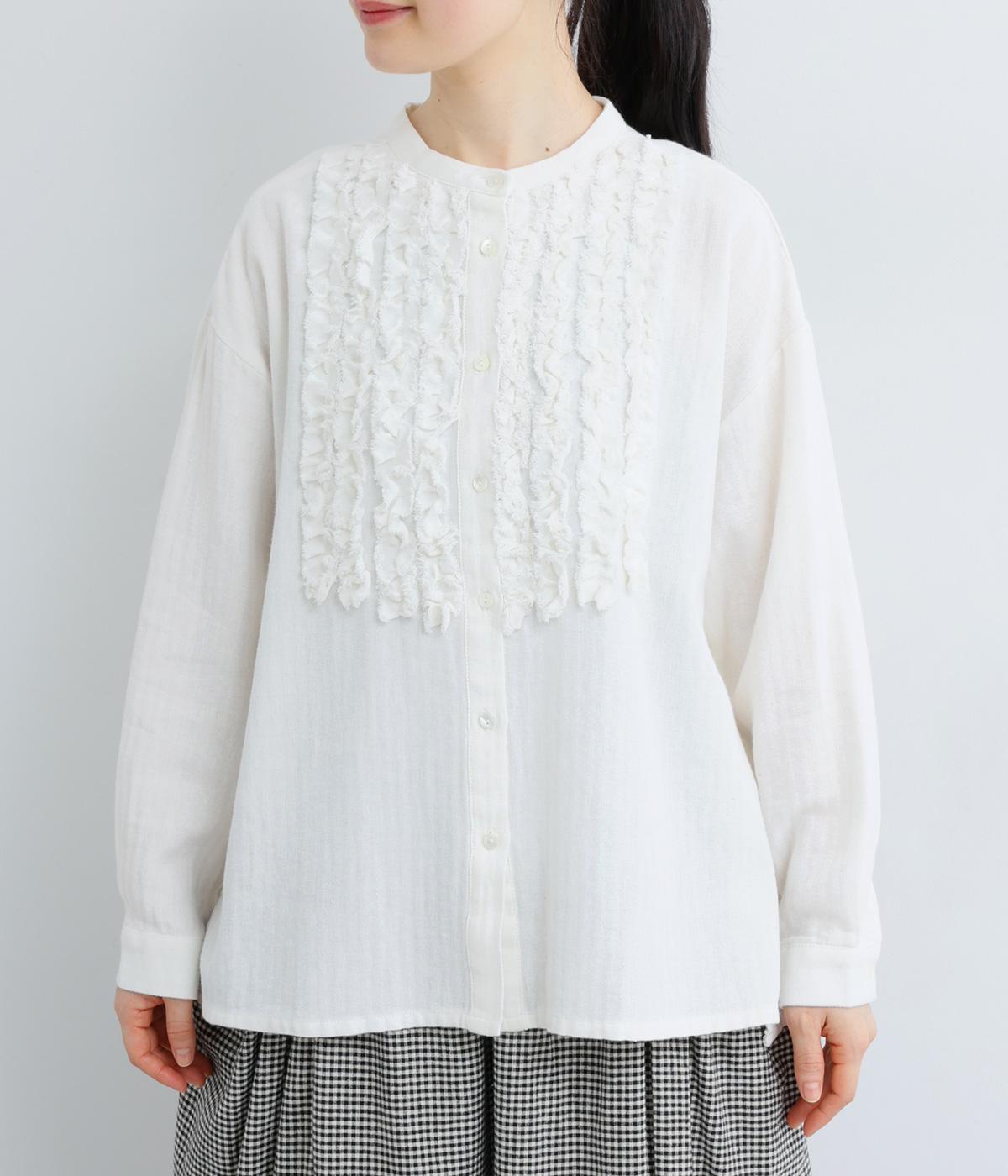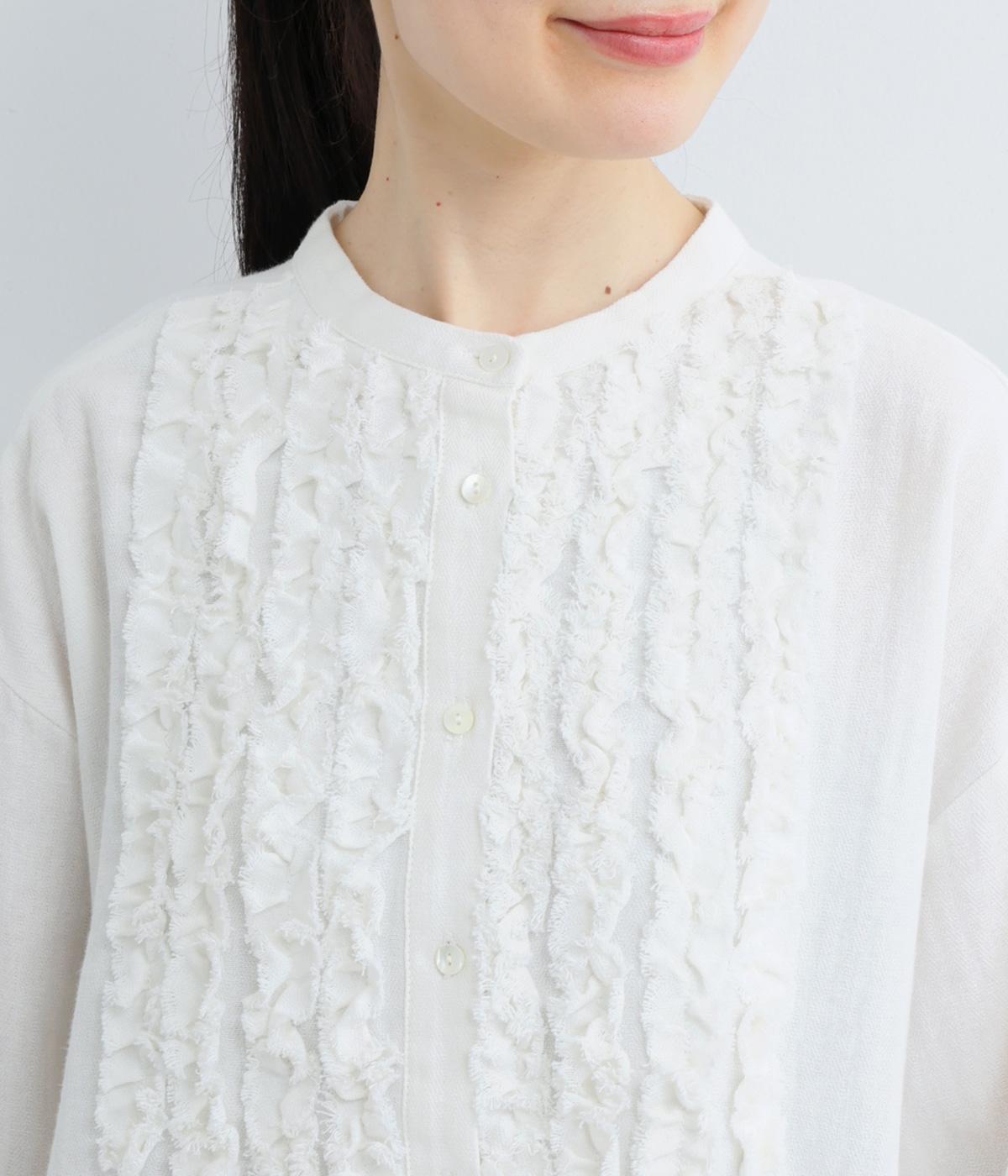 胸元にたっぷりフリルをほどこしたロマンティックなブラウス。ナチュラルな生地感や裁ち切り仕様で甘すぎないちょうどいいバランスに仕上がっています。裾まわりはすっきりさせているのでカジュアルなボトムとも好相性。