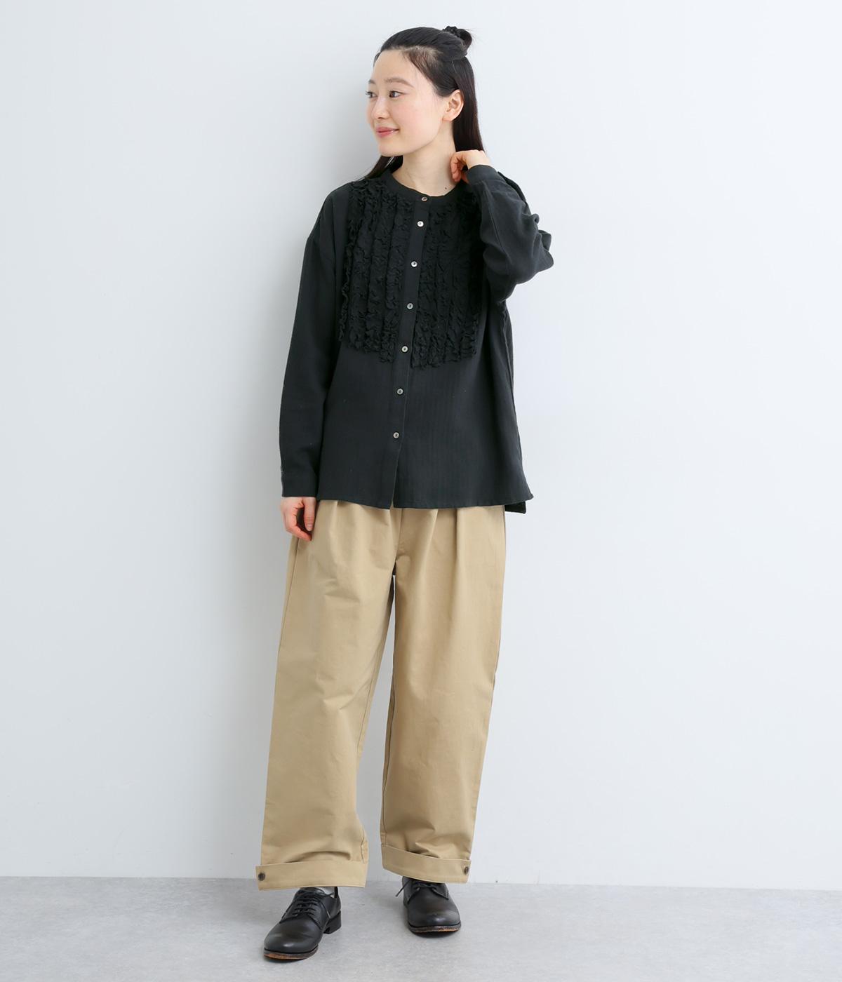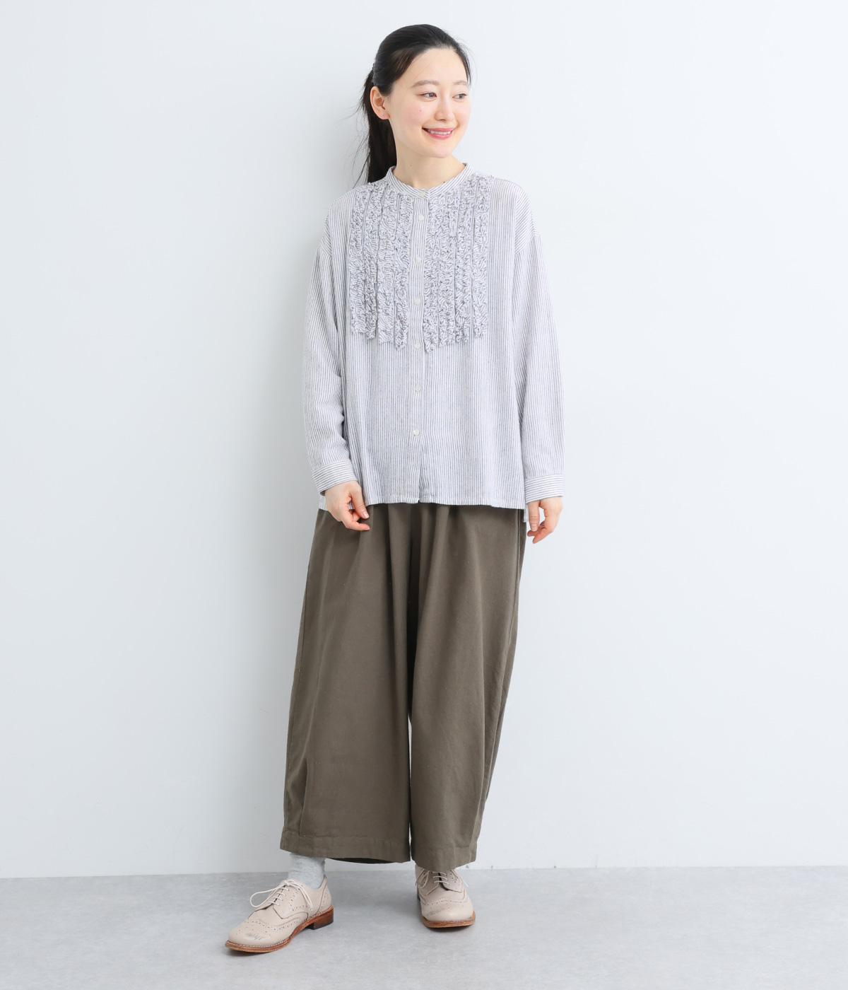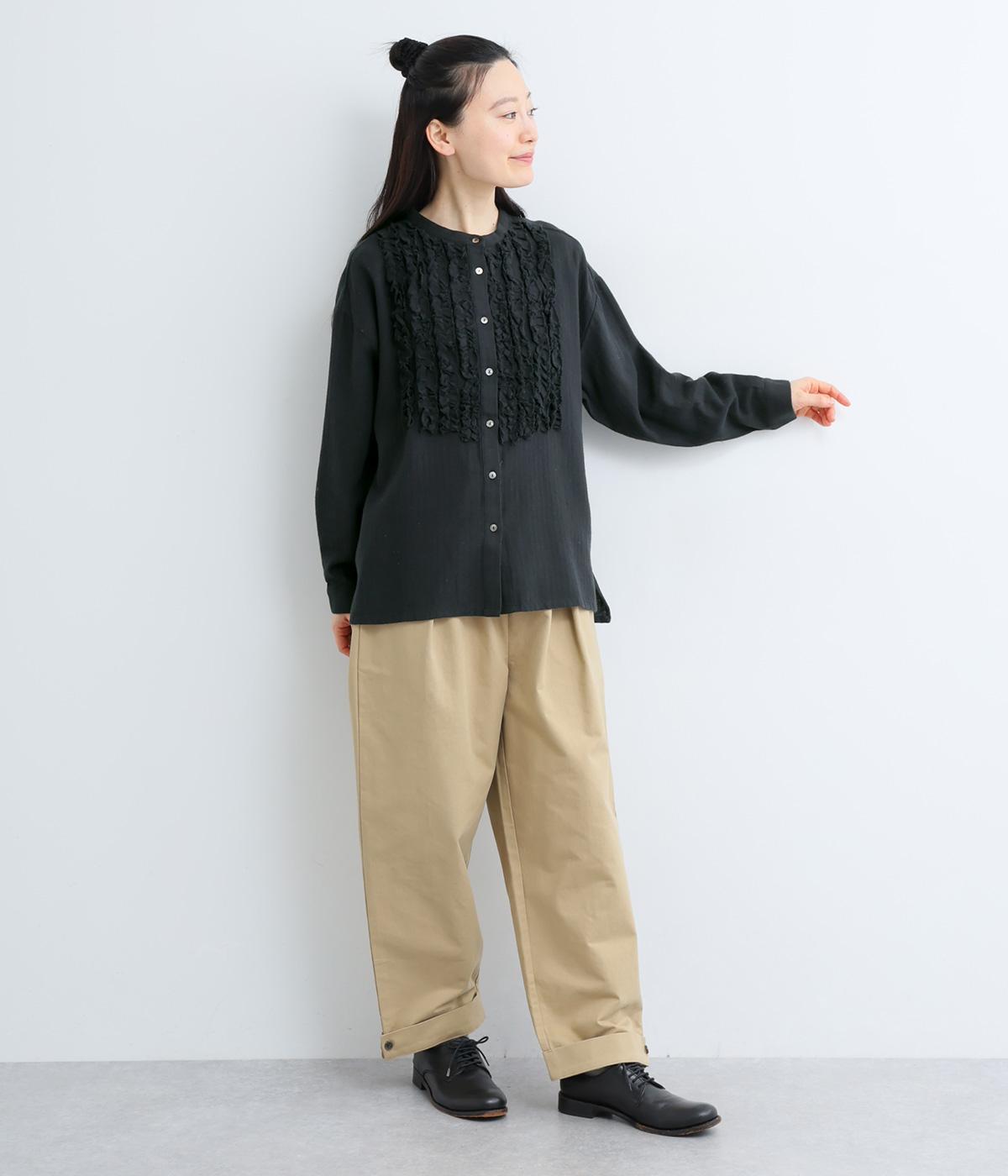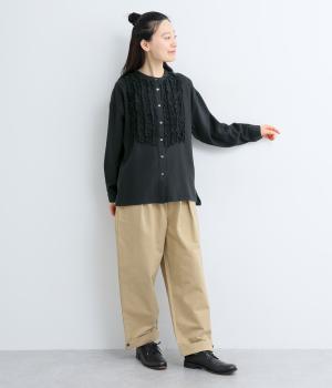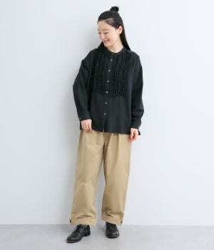 胸元にたっぷりフリルをほどこしたロマンティックなブラウス。ナチュラルな生地感や裁ち切り仕様で甘すぎないちょうどいいバランスに仕上がっています。裾まわりはすっきりさせているのでカジュアルなボトムとも好相性。