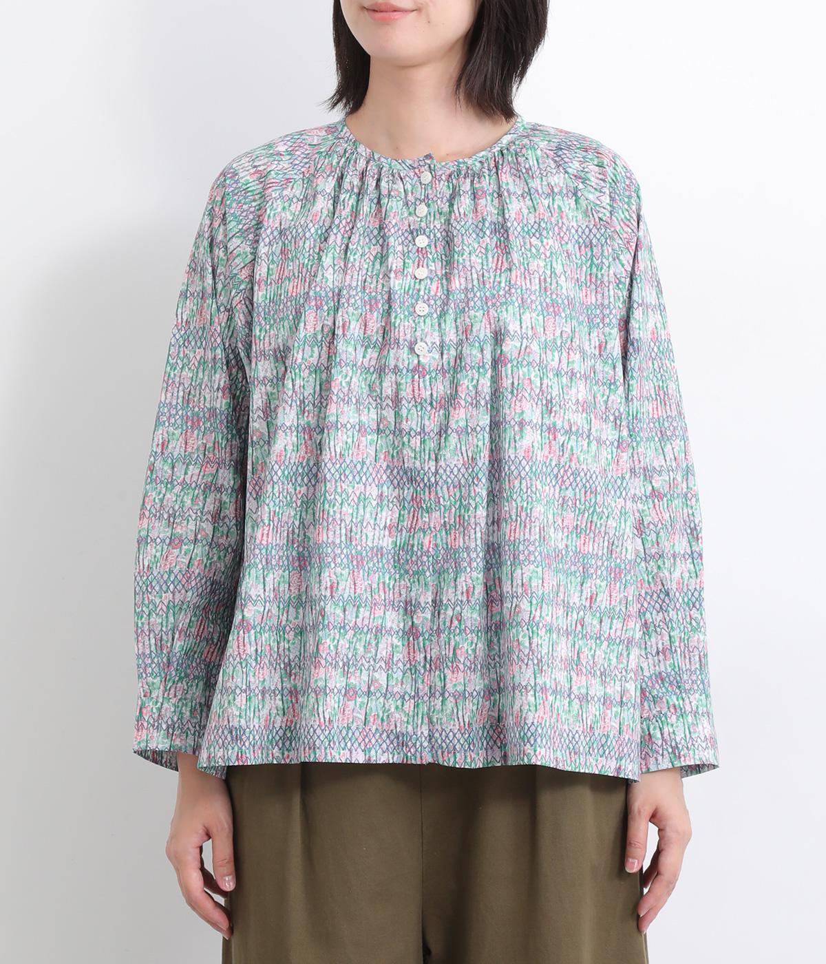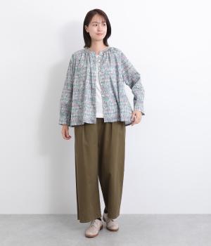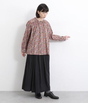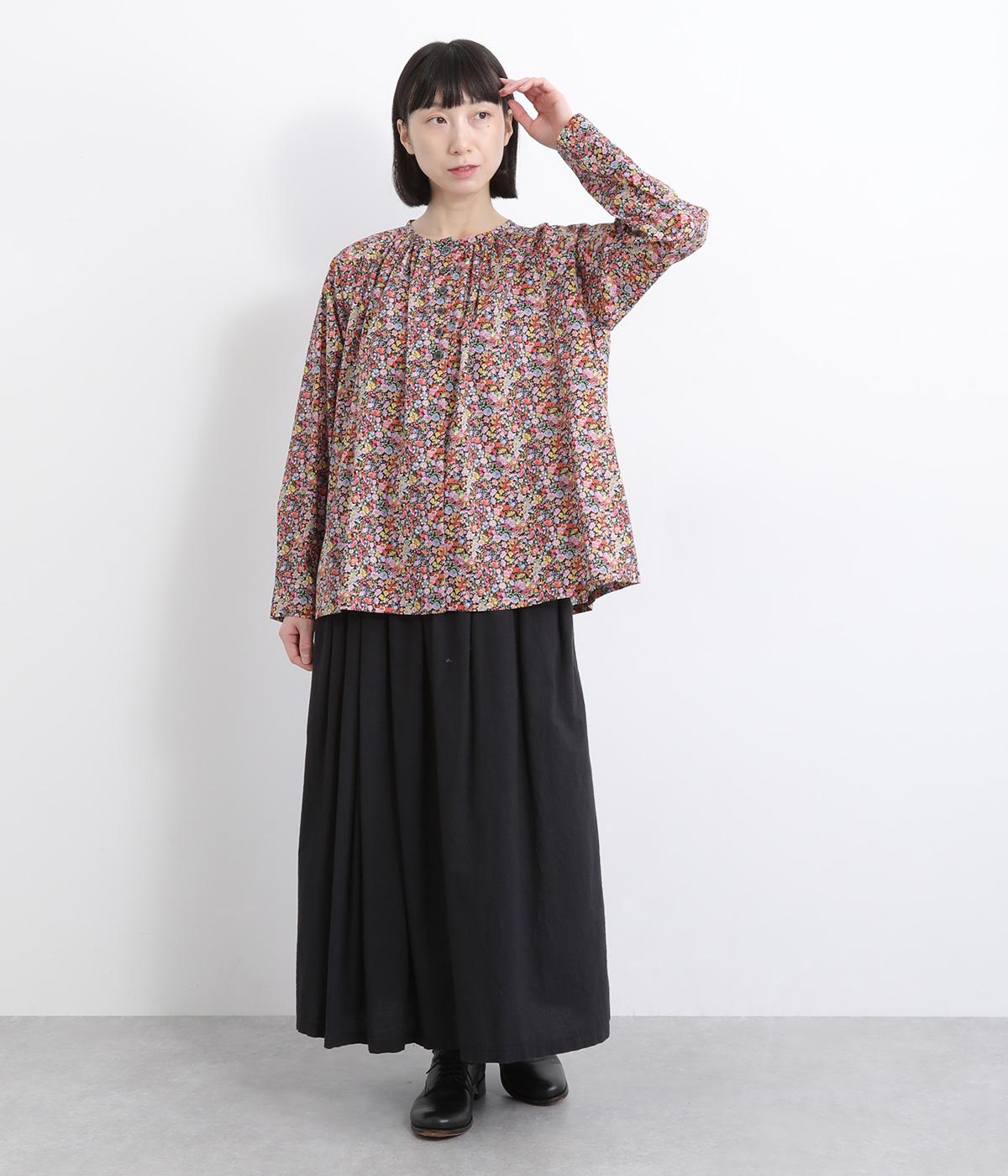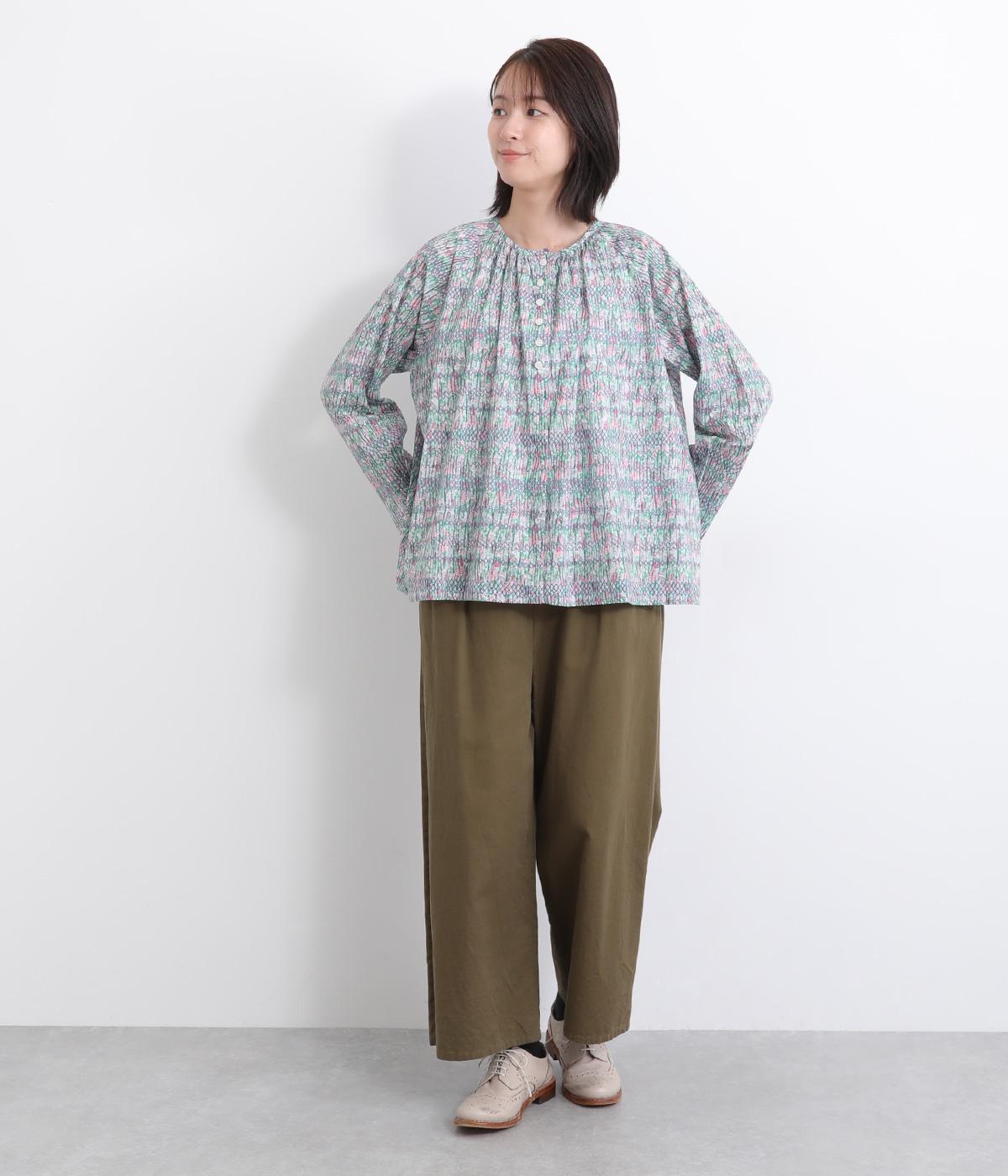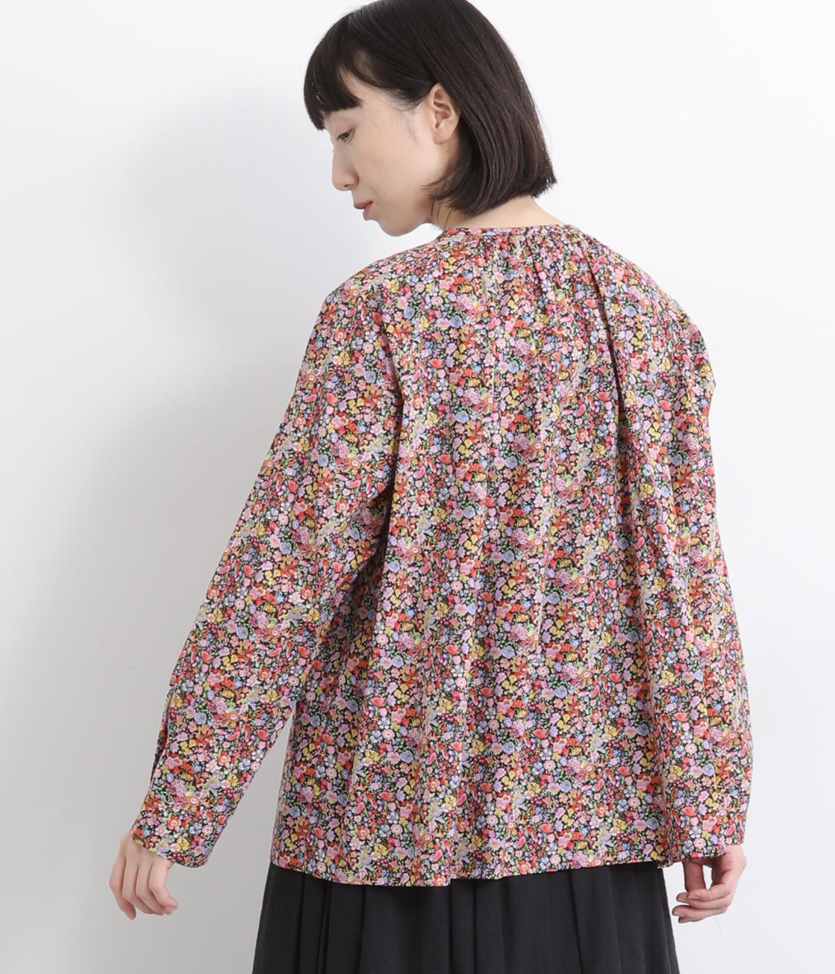スタイリングのポイントになる鮮やかなリバティプリントのブラウスは、ラグラン袖で着心地の良さも兼ね備えました。上部分は多ボタンでアイキャッチに、下部分は比翼にした前あき仕様もこだわりポイントです。襟ぐりにギャザーを入れてふんわり仕立てました。