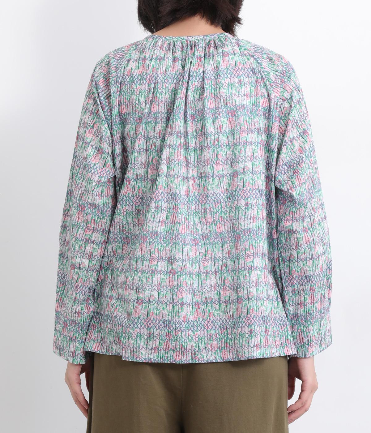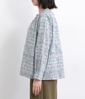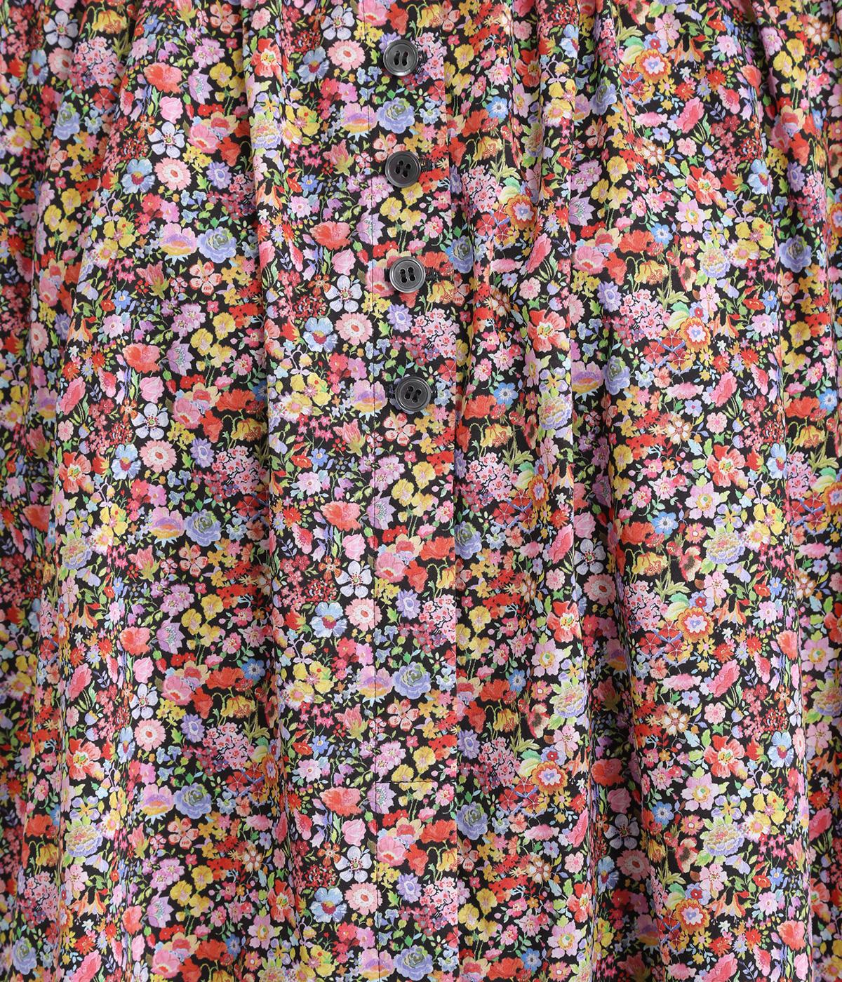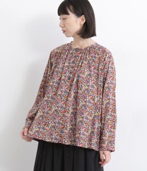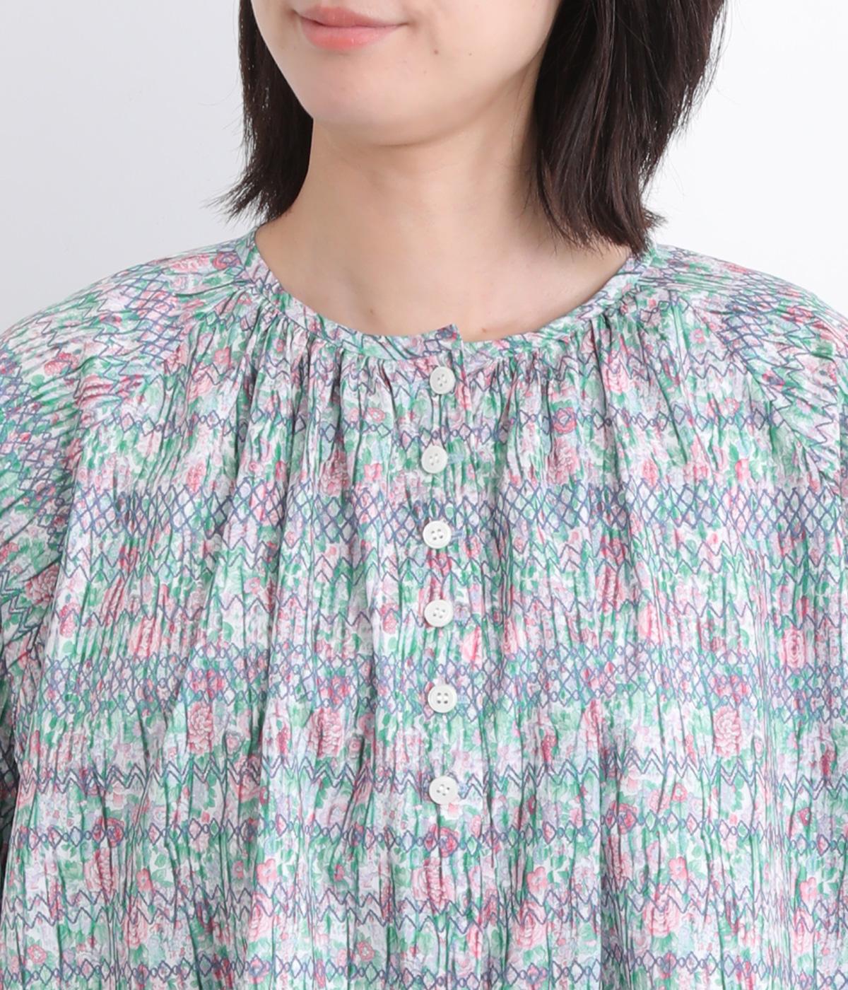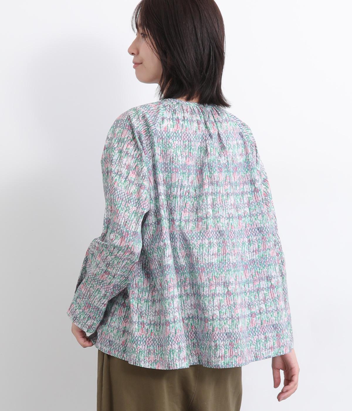 スタイリングのポイントになる鮮やかなリバティプリントのブラウスは、ラグラン袖で着心地の良さも兼ね備えました。上部分は多ボタンでアイキャッチに、下部分は比翼にした前あき仕様もこだわりポイントです。襟ぐりにギャザーを入れてふんわり仕立てました。