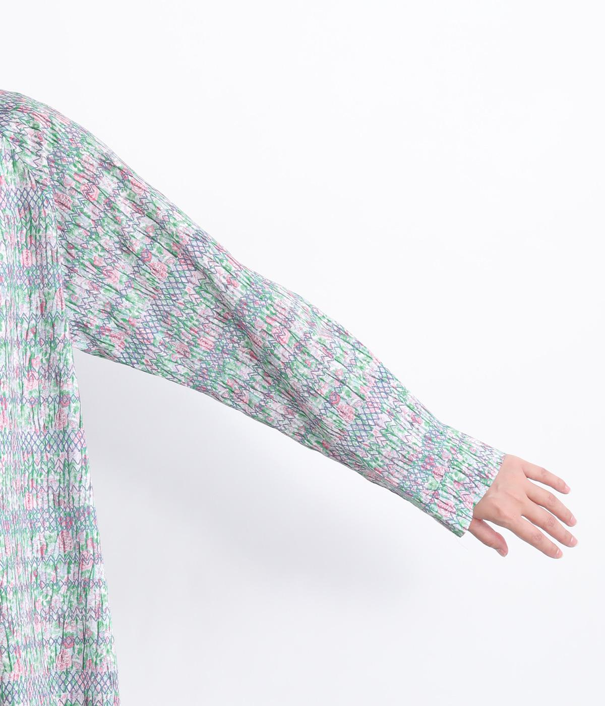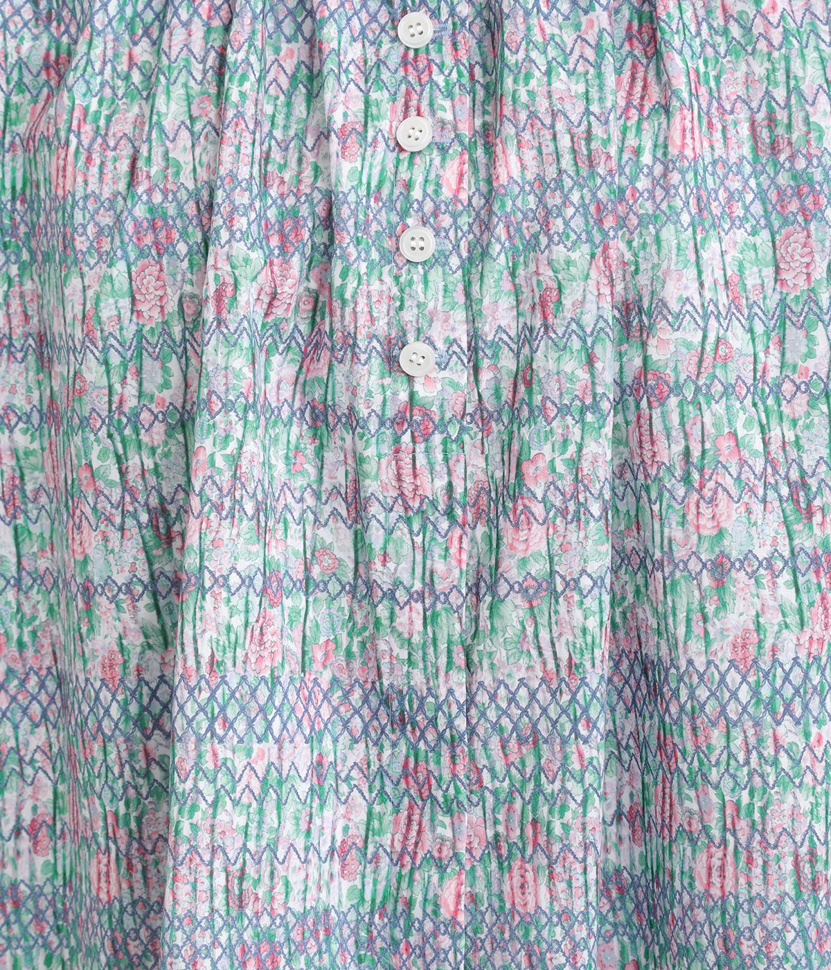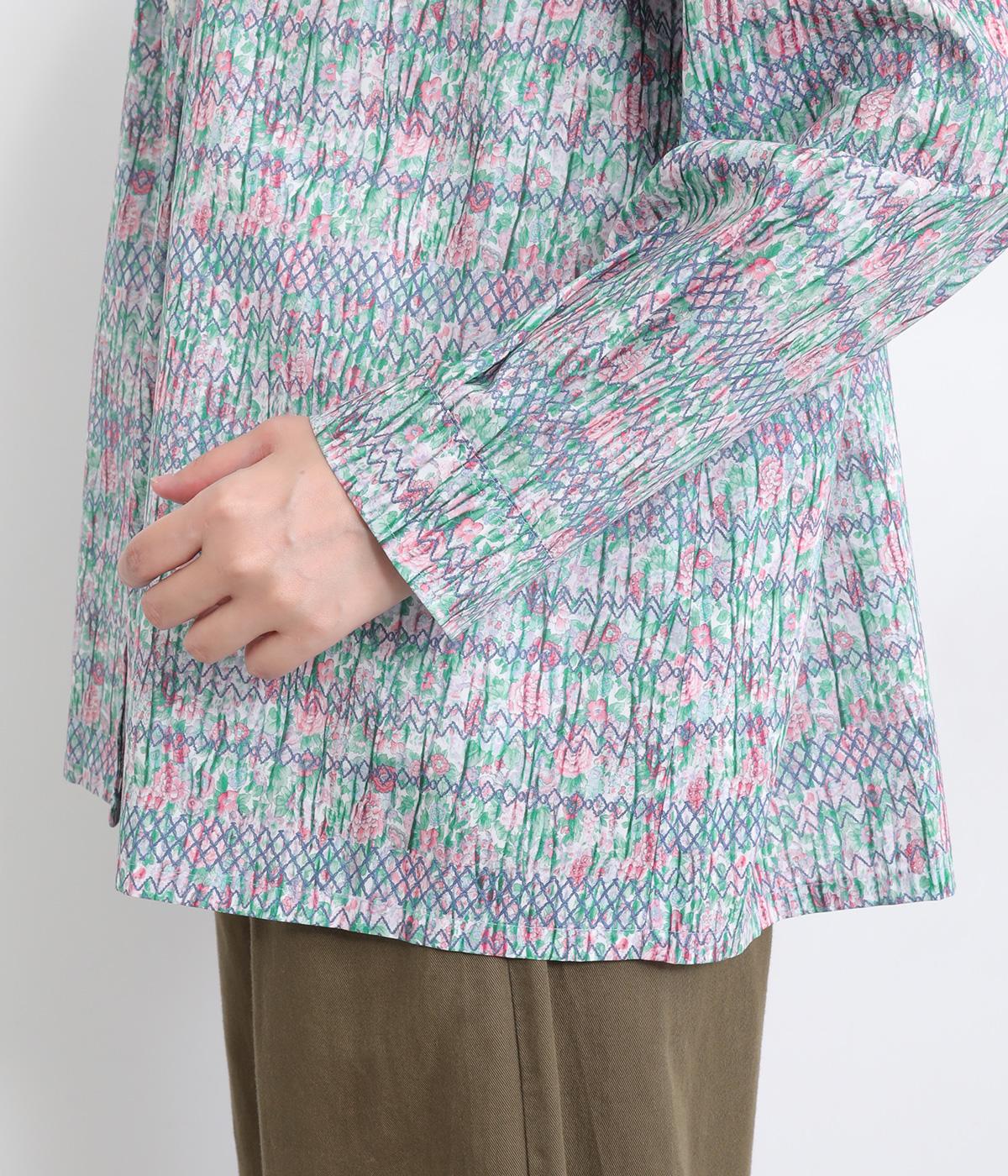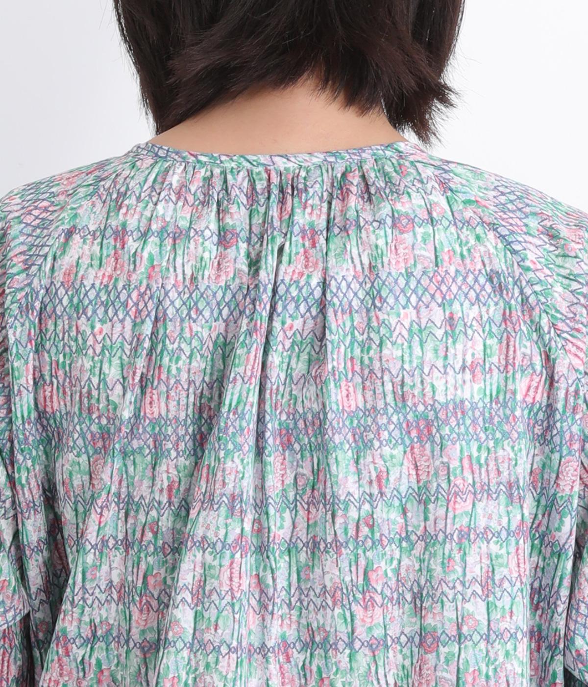 スタイリングのポイントになる鮮やかなリバティプリントのブラウスは、ラグラン袖で着心地の良さも兼ね備えました。上部分は多ボタンでアイキャッチに、下部分は比翼にした前あき仕様もこだわりポイントです。襟ぐりにギャザーを入れてふんわり仕立てました。