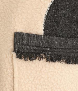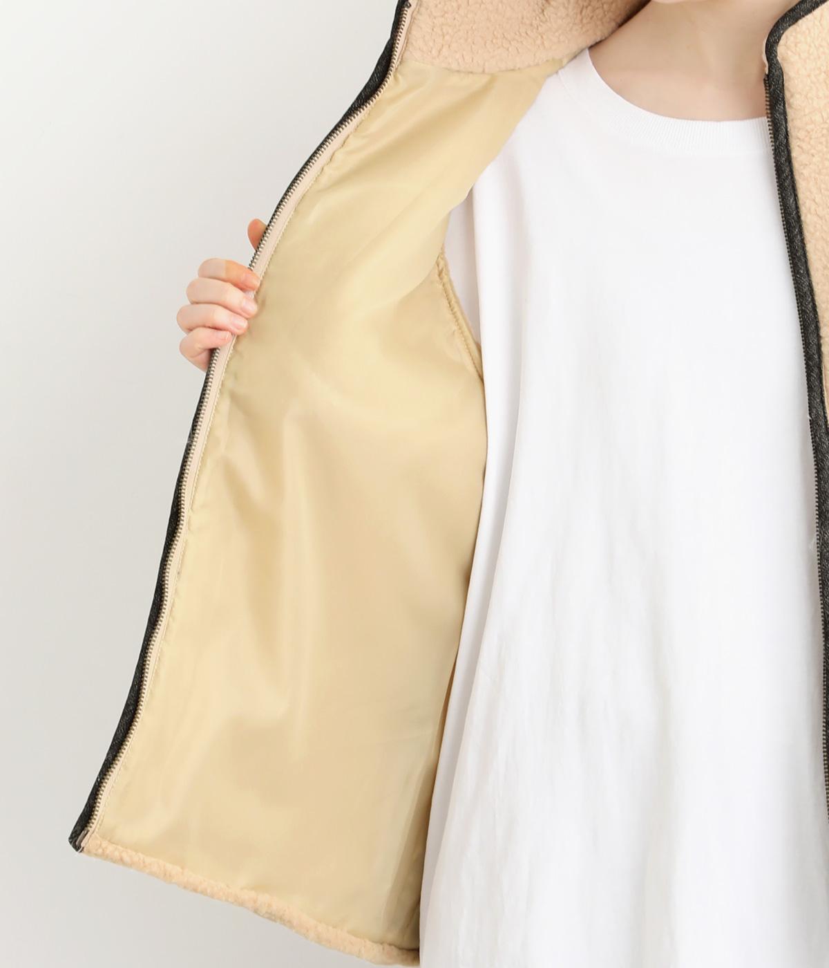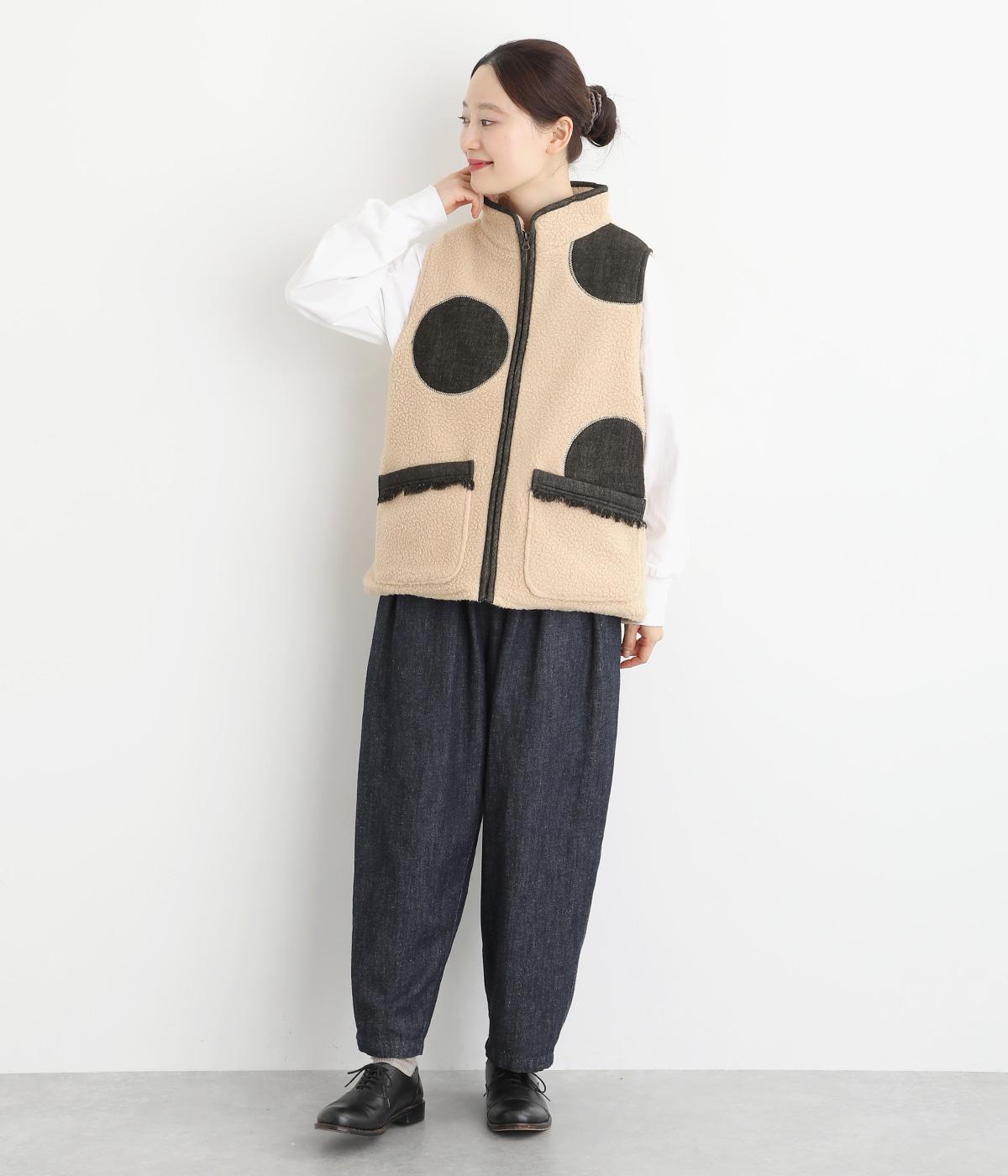 あたたかみのあるボアベストにデニム生地で大きなドット刺しゅうをほどこしました。軽やかでやわらかな手ざわりに保温性も兼ね備えた、機能性もばっちりな素材です。