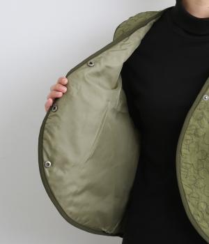 シャカシャカとしたナイロン生地を使用しました。中綿入りであたたかく、保温性と軽やかな着心地を叶えます。デイリーに取り入れやすい素材感です。