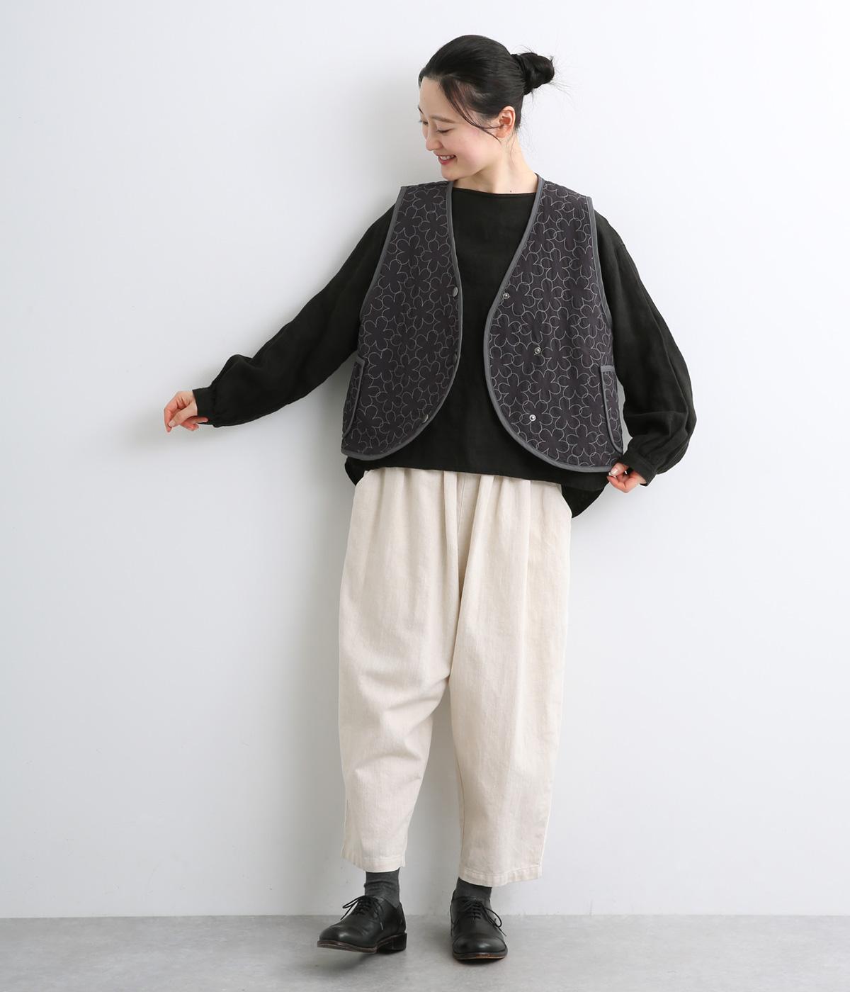 重なり合う花柄のステッチが特徴的なキルティングベストです。前立てのカーブラインがこなれ感を演出し、丸みのある裾がかわいらしさを添えます。サッと羽織るだけで秋冬のコーディネートが華やぐアイテムです。