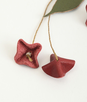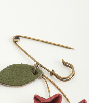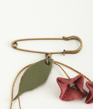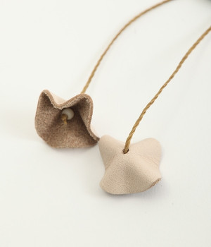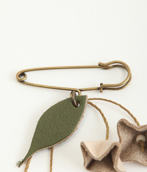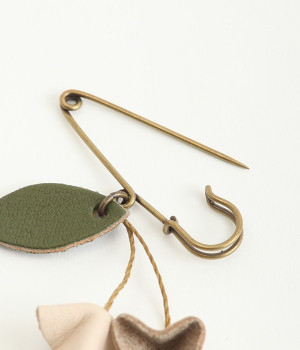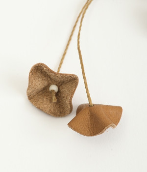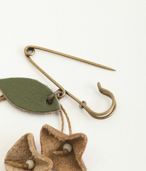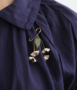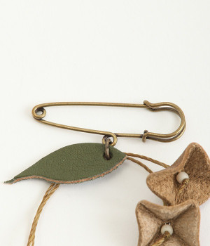 目を引くのに儚い、不思議な存在のすずらんをモチーフにしたブローチです。もともとは平たいレザーを、一つ一つ手作業でつまんで立体的になるように形作っています。素材の自然な色合いや華奢なデザインのおかげで派手すぎず、おとなしすぎず絶妙なアクセントに。セーターやシャツの胸元にはもちろん、帽子やストールにつけても動きを感じられるコーディネートが完成します。紐部分はブラジルLinhasita製のワックスコードで、色合いが美しく丈夫なのが特徴。時を経て味わいを増したような風合いを出せるように、素材選びにもこだわった一品です。