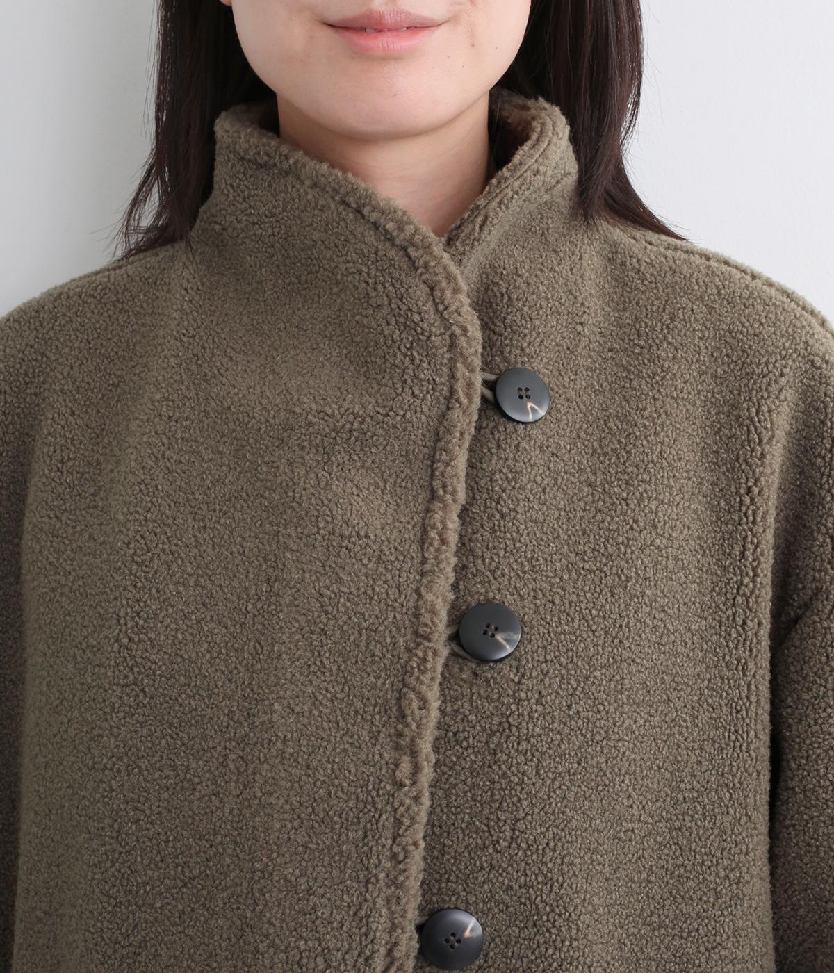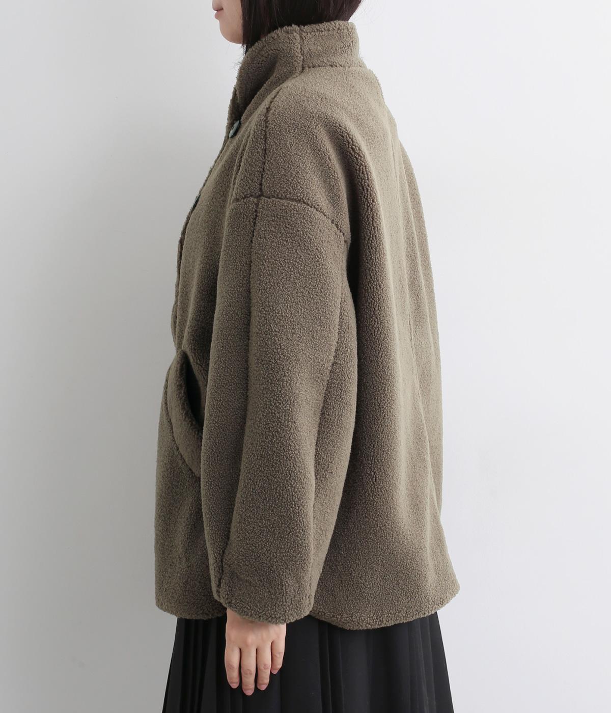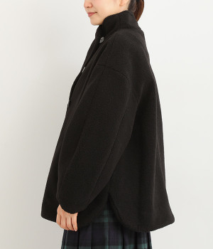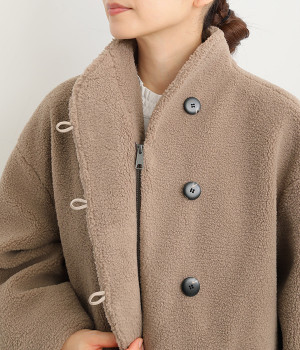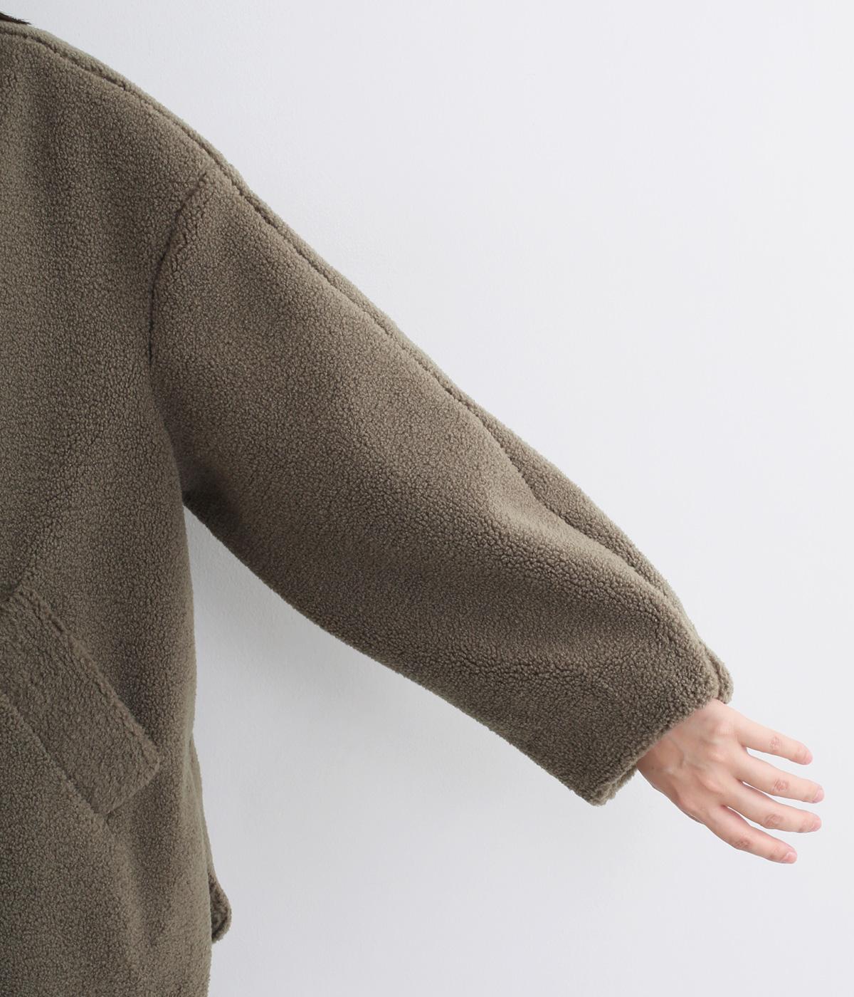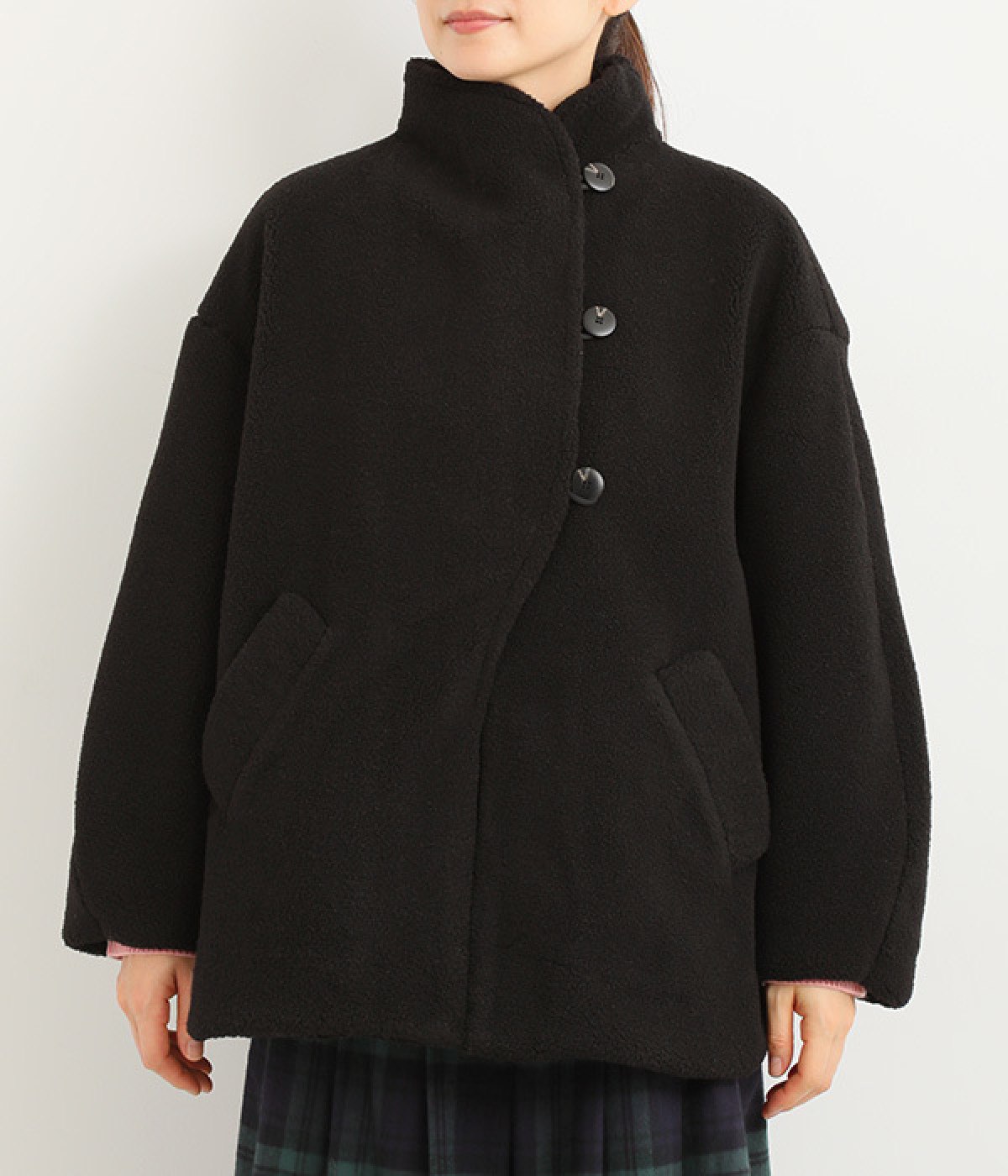 フロントのアシンメトリーなボタン使いやファンネルネックでシックに仕上げたボアコート。全体的に丸みのあるシルエットで、厚手のニットなども着込みやすいです。前立ての下のジップをじて着用するとよりしっかりと防寒できます。