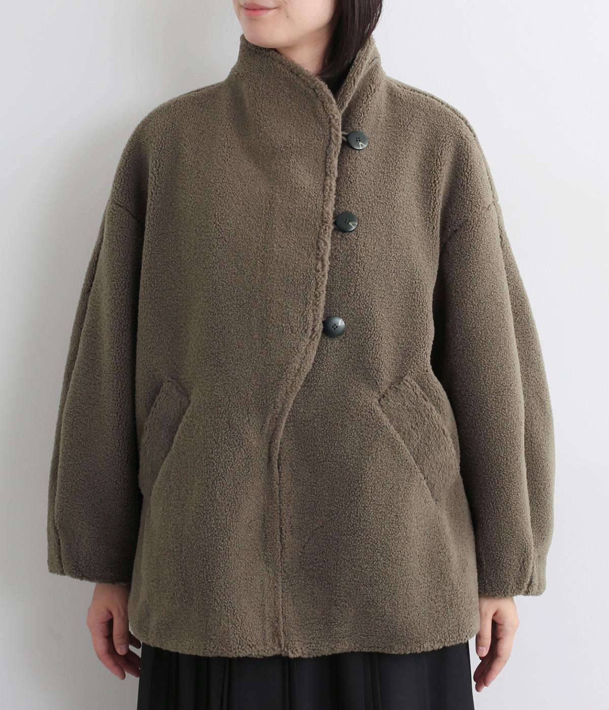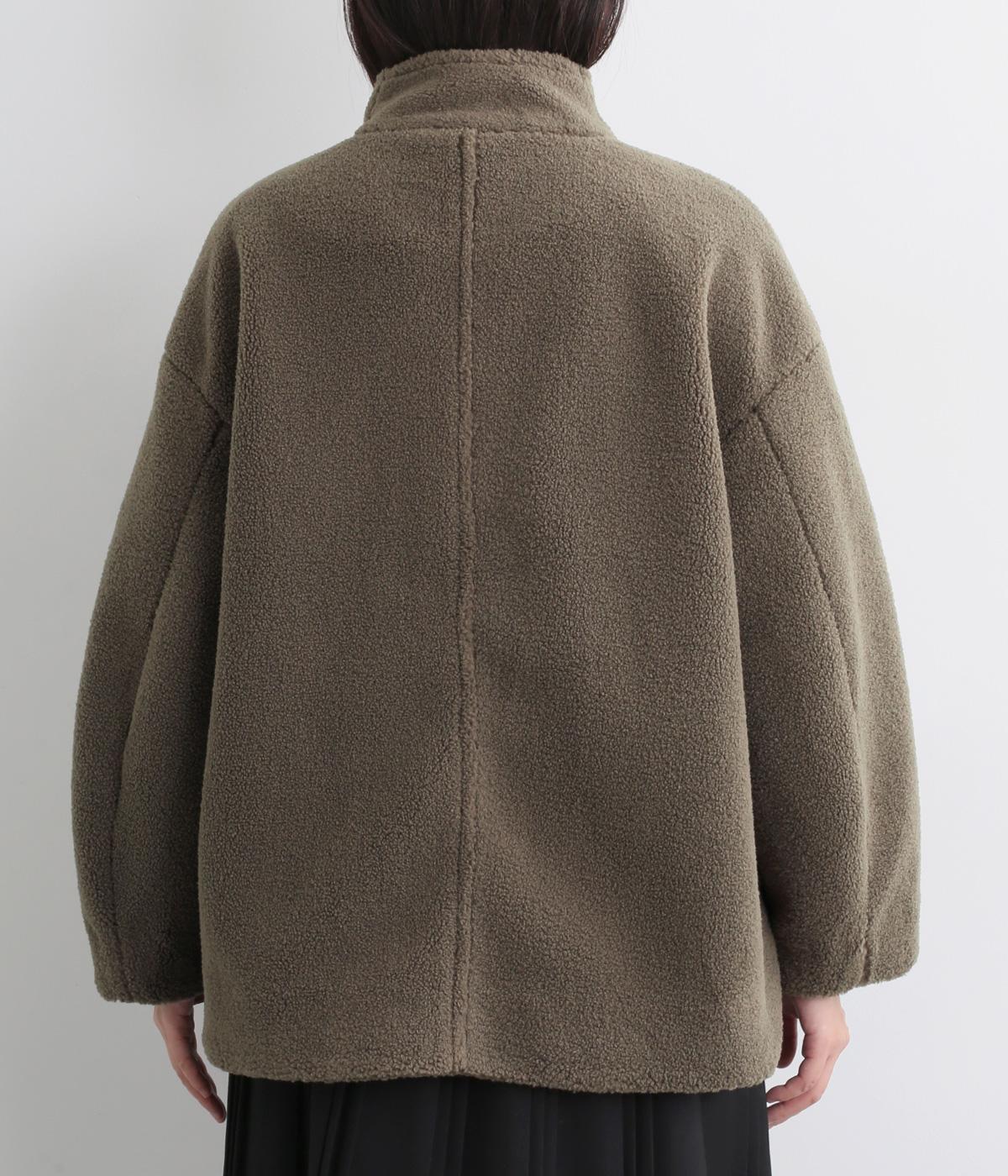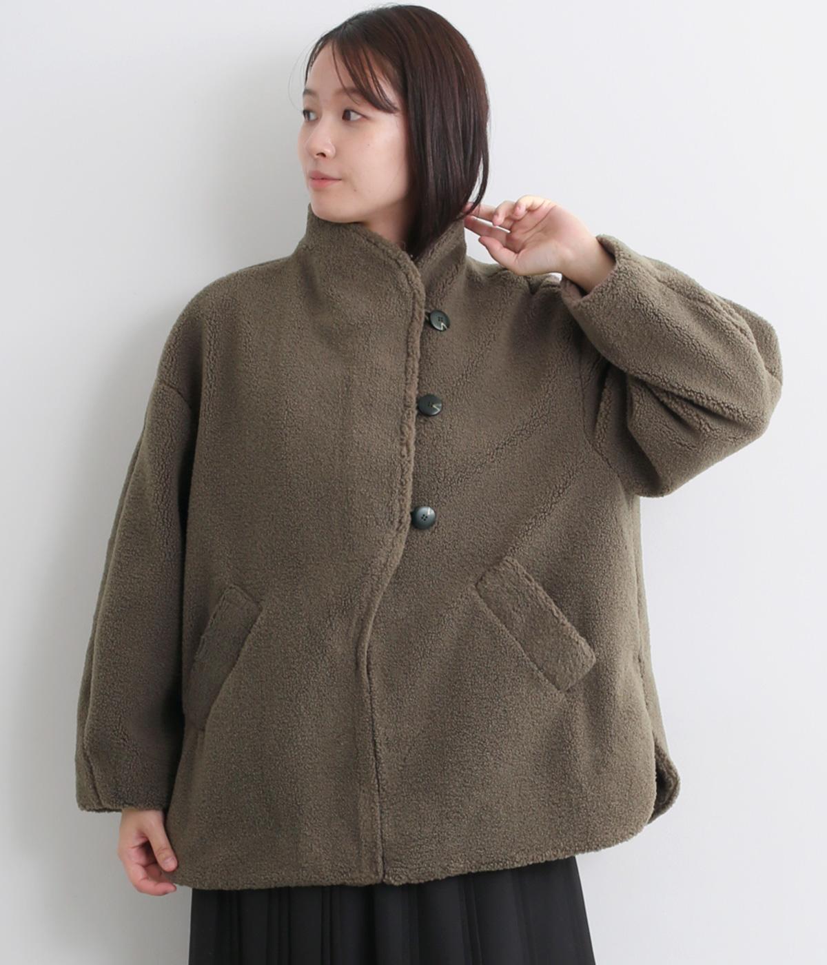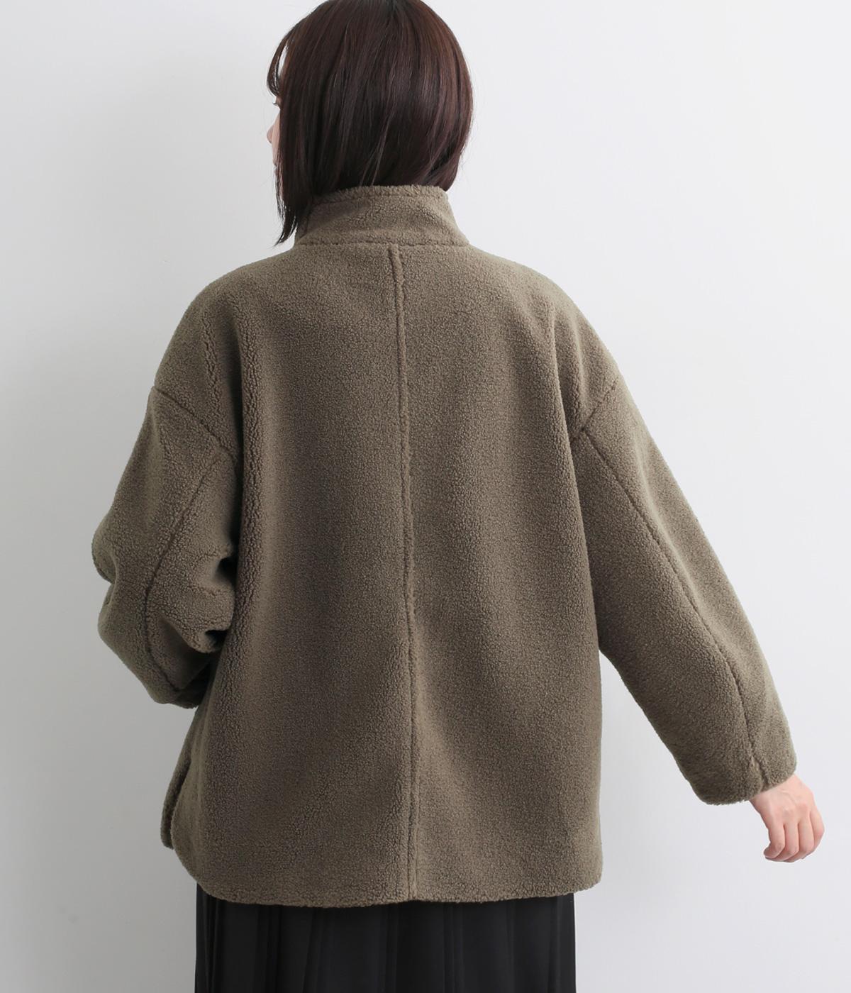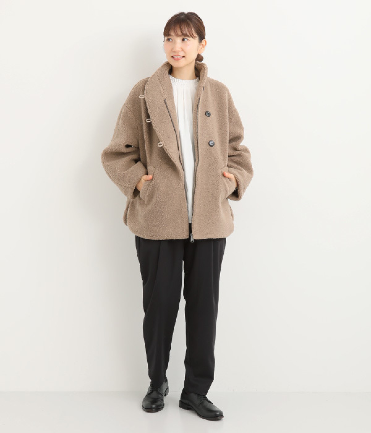 フロントのアシンメトリーなボタン使いやファンネルネックでシックに仕上げたボアコート。全体的に丸みのあるシルエットで、厚手のニットなども着込みやすいです。前立ての下のジップをじて着用するとよりしっかりと防寒できます。