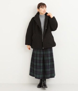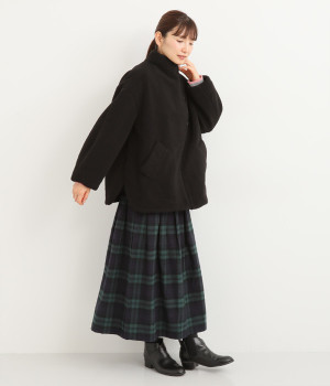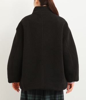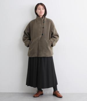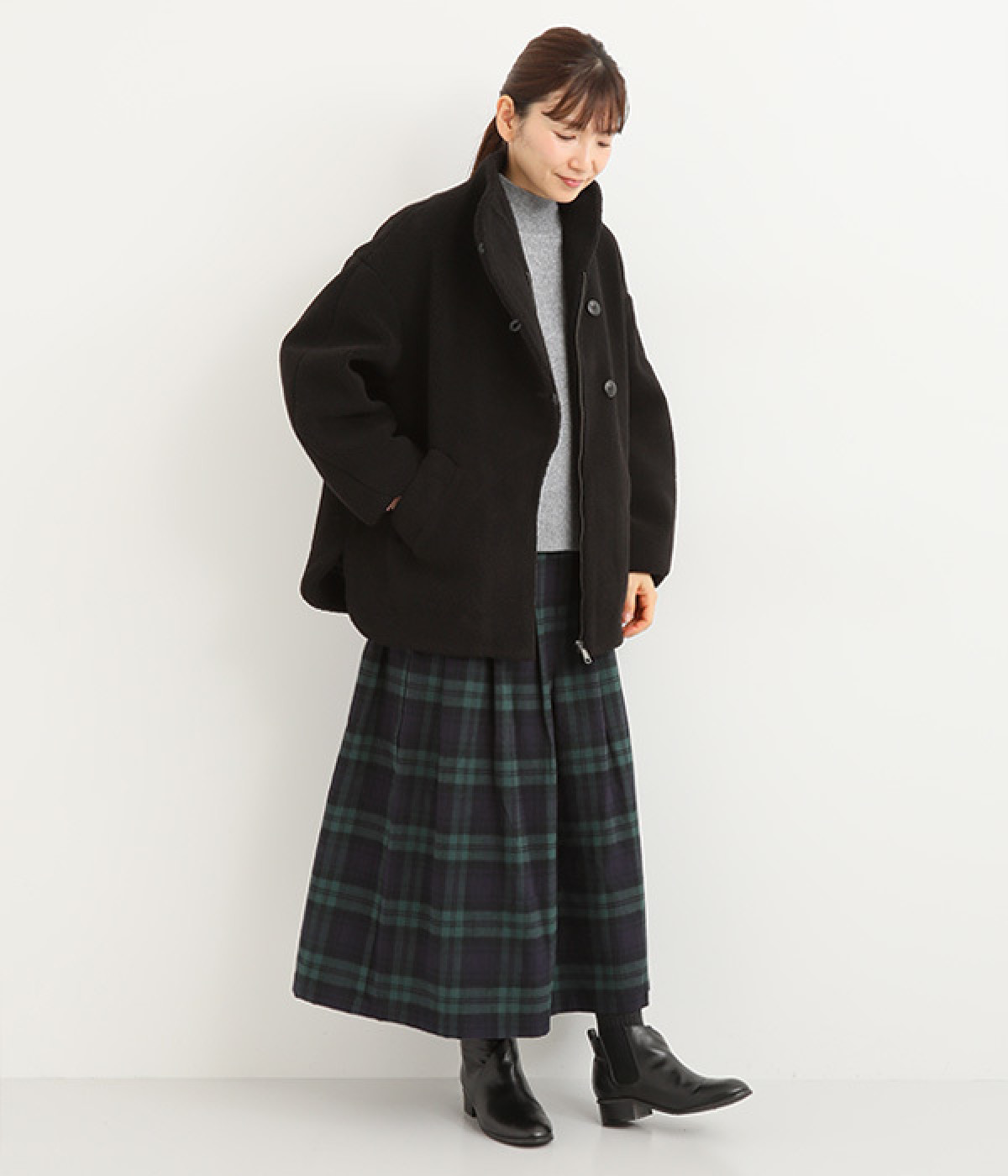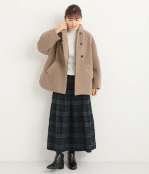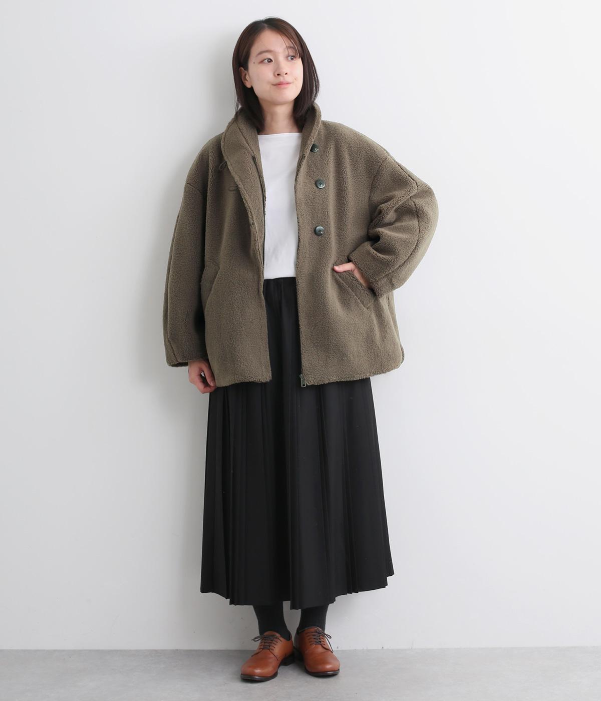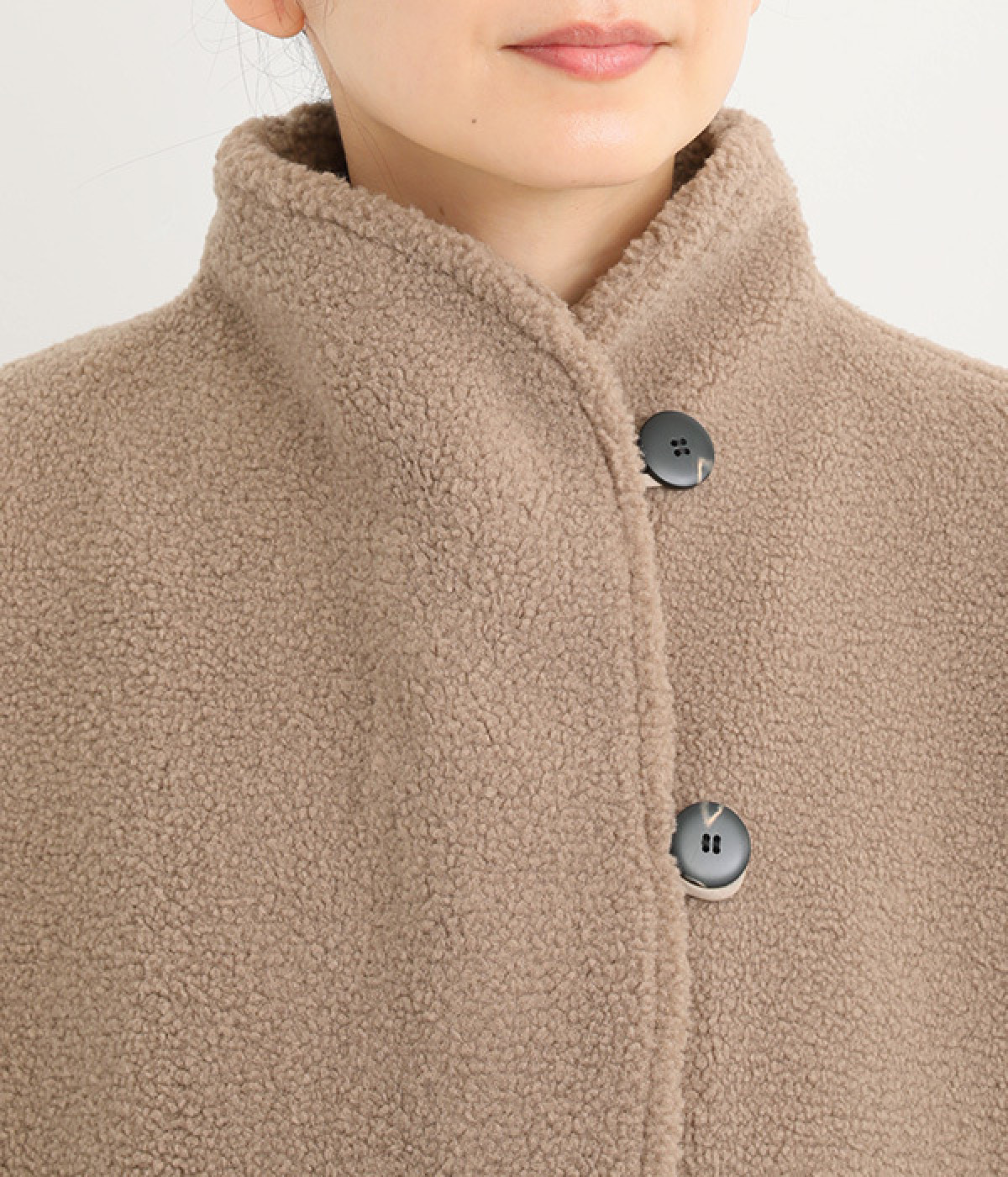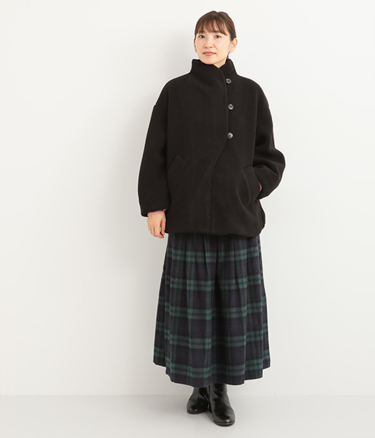 フロントのアシンメトリーなボタン使いやファンネルネックでシックに仕上げたボアコート。全体的に丸みのあるシルエットで、厚手のニットなども着込みやすいです。前立ての下のジップをじて着用するとよりしっかりと防寒できます。