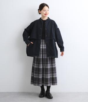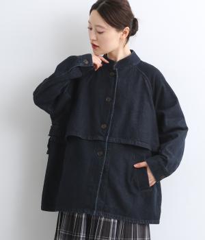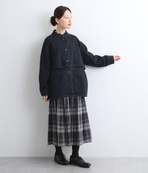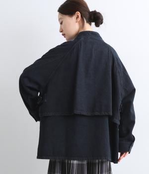 前後のフラップ仕様が特徴的なジャケットです。ルーズな印象になりすぎないよう、首元はマオカラーを採用しメリハリのあるデザインに仕上げました。たっぷりとした身幅とラグランスリーブデザインで、インナーにニットなどを重ねてももたつかずすっきり着用できます。
