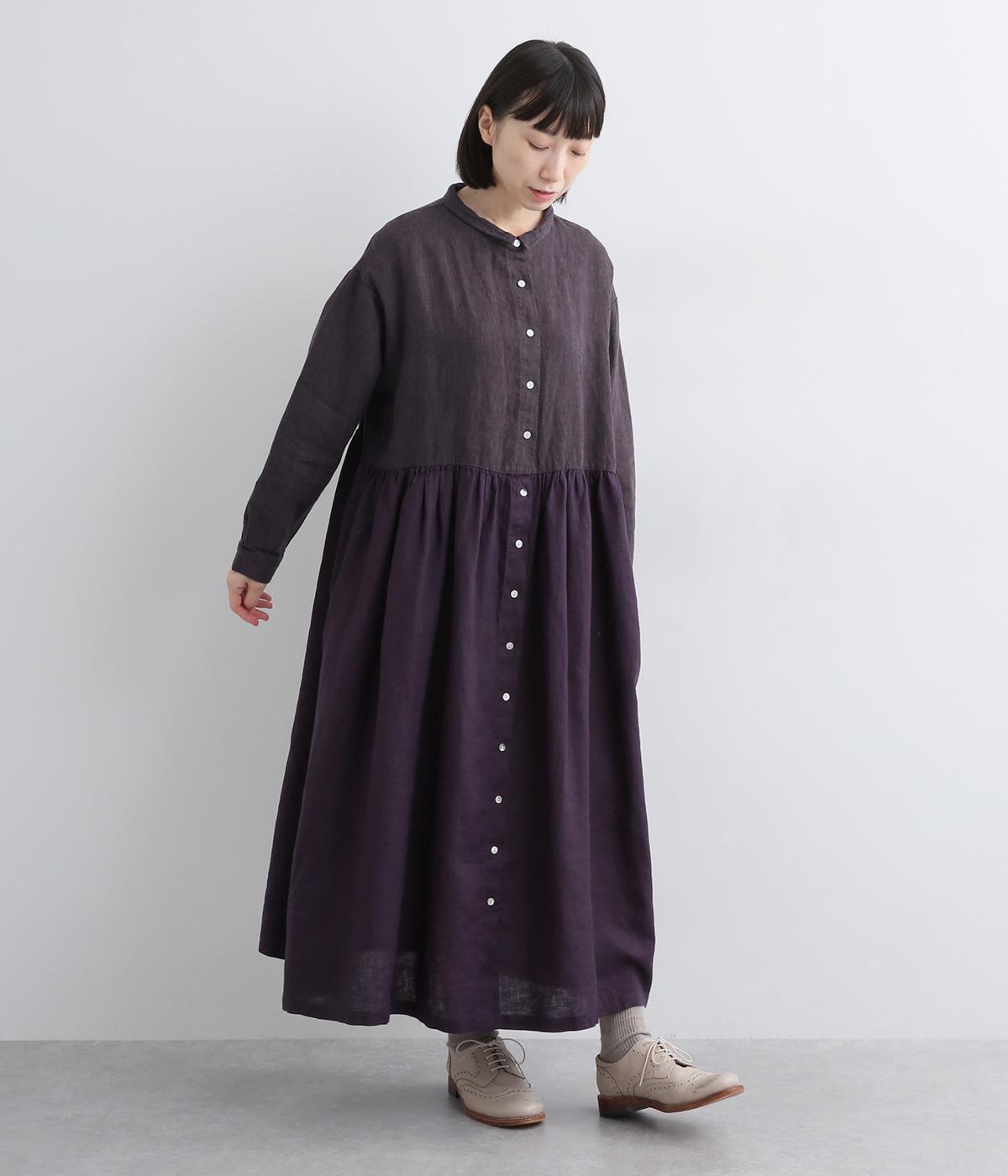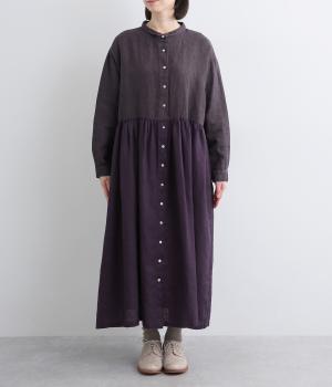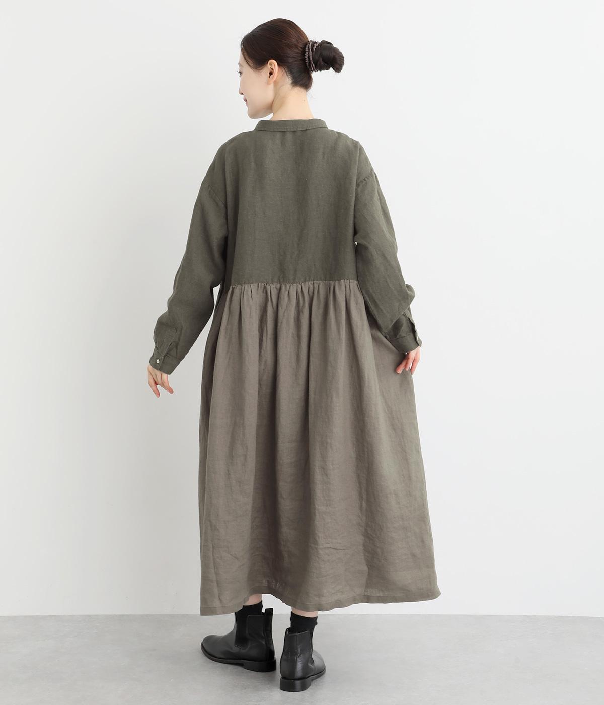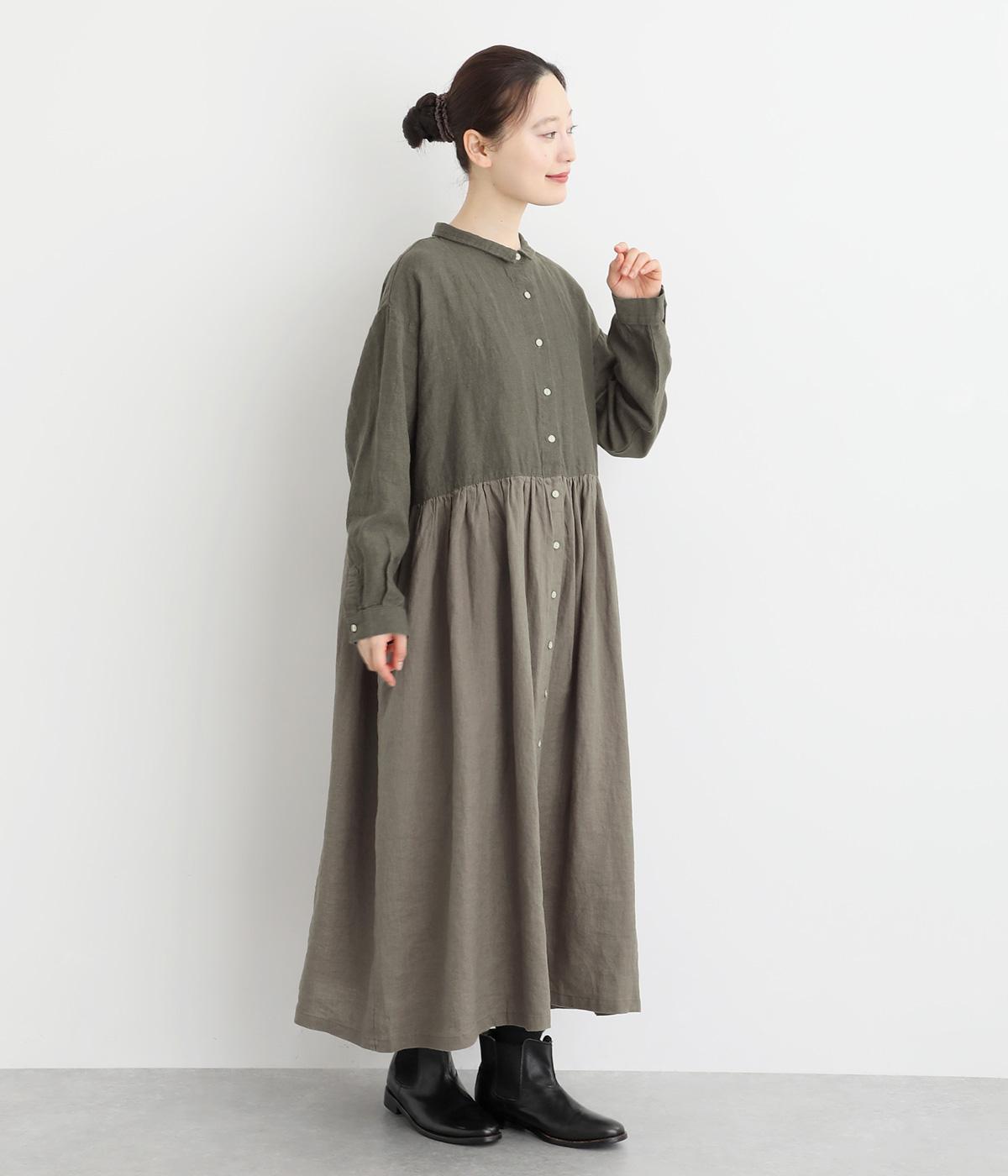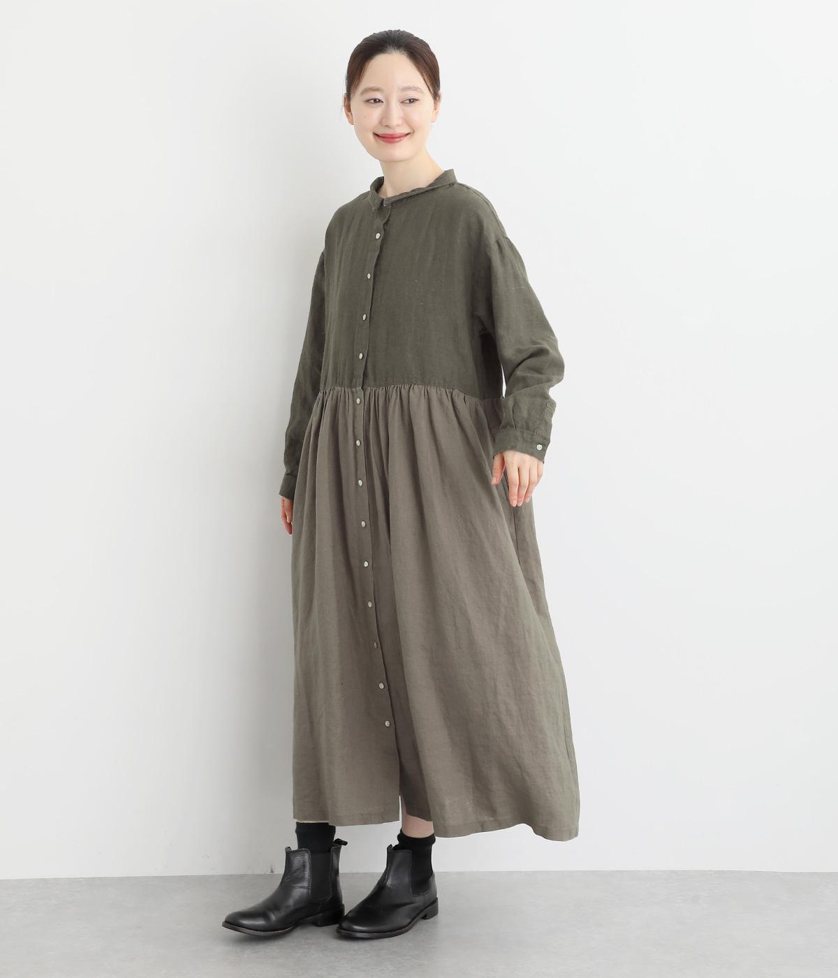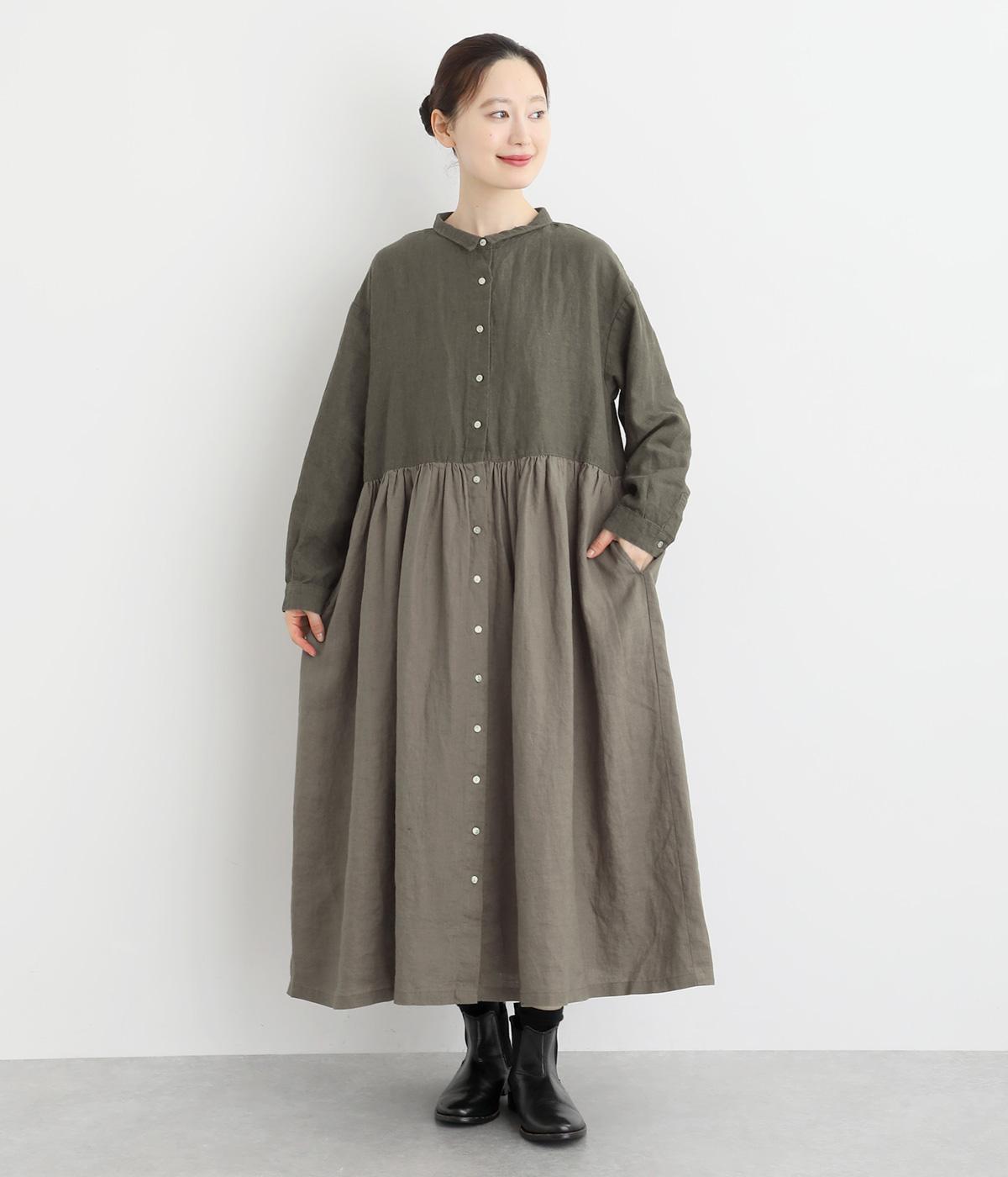糸の太さが異なるリネン生地を使って切り替えた、表情豊かなワンピースです。たっぷりギャザーで動きを出しながらも、素材特有の落ち感が出たリラクシーなシルエット。フロントのシェルボタンが品の良さを高めるアクセントに。