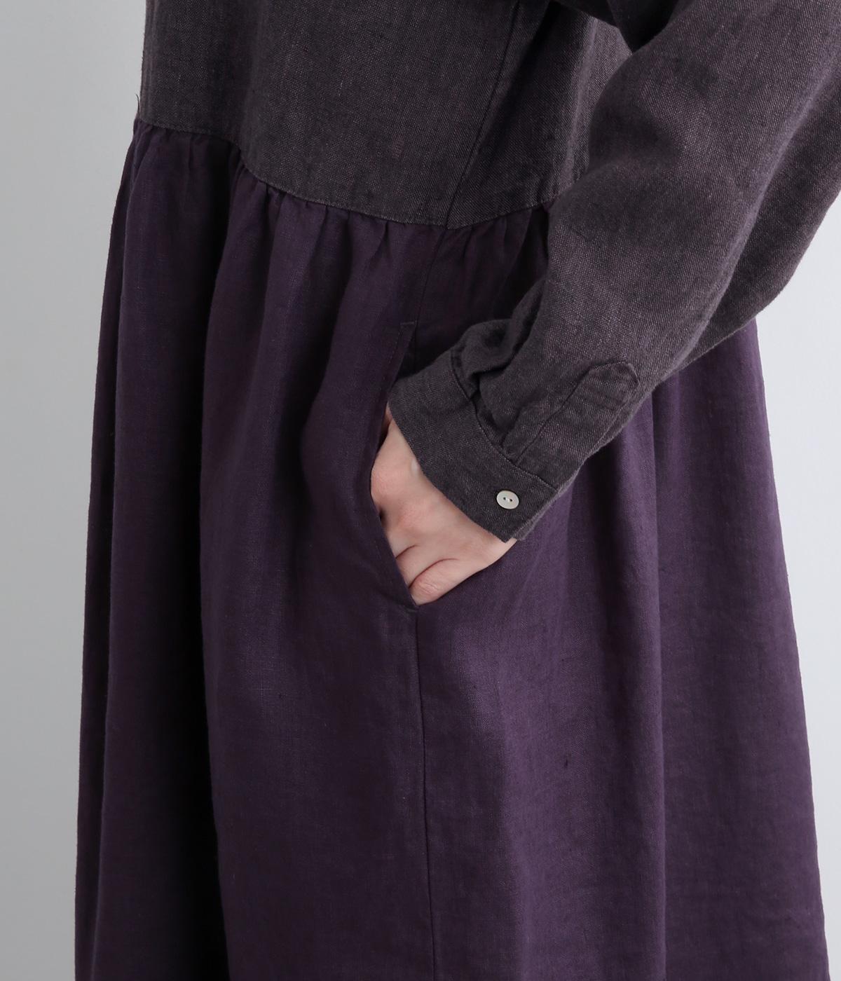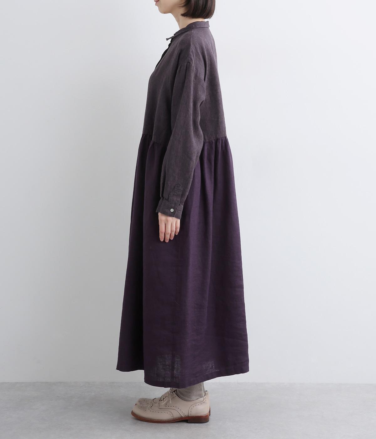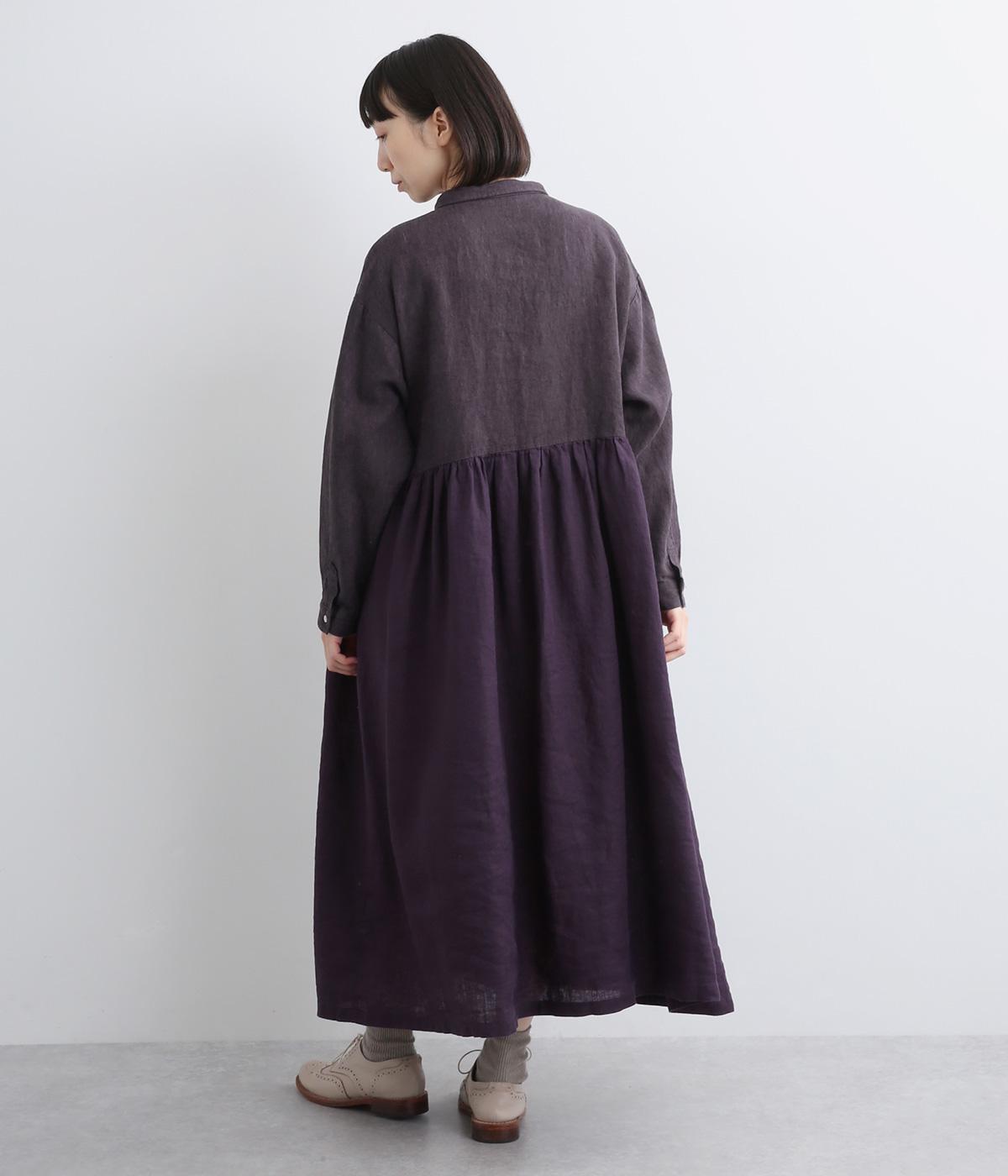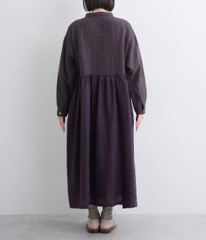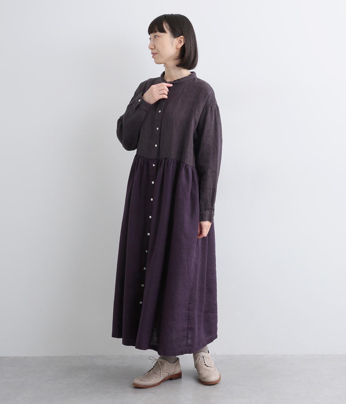 糸の太さが異なるリネン生地を使って切り替えた、表情豊かなワンピースです。たっぷりギャザーで動きを出しながらも、素材特有の落ち感が出たリラクシーなシルエット。フロントのシェルボタンが品の良さを高めるアクセントに。
