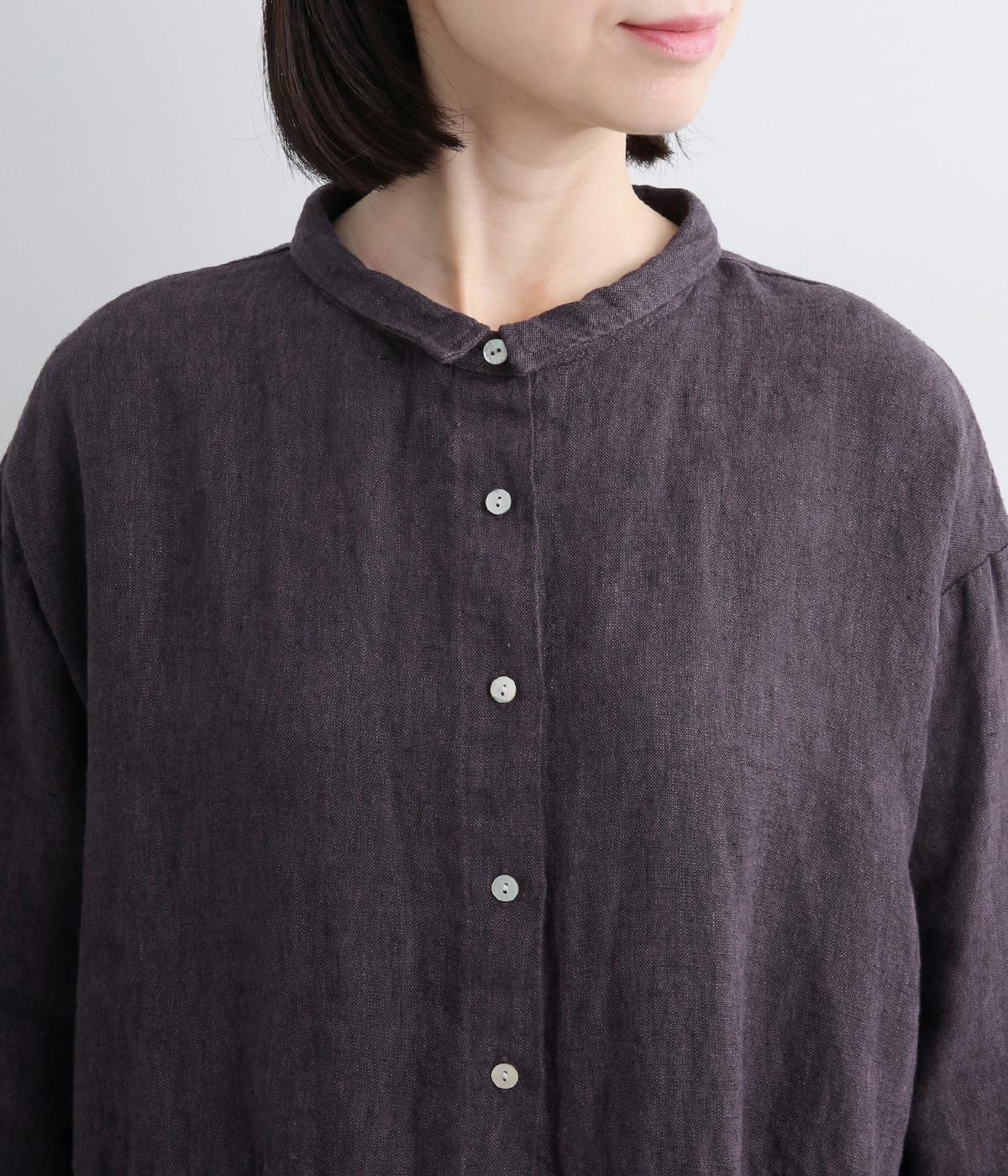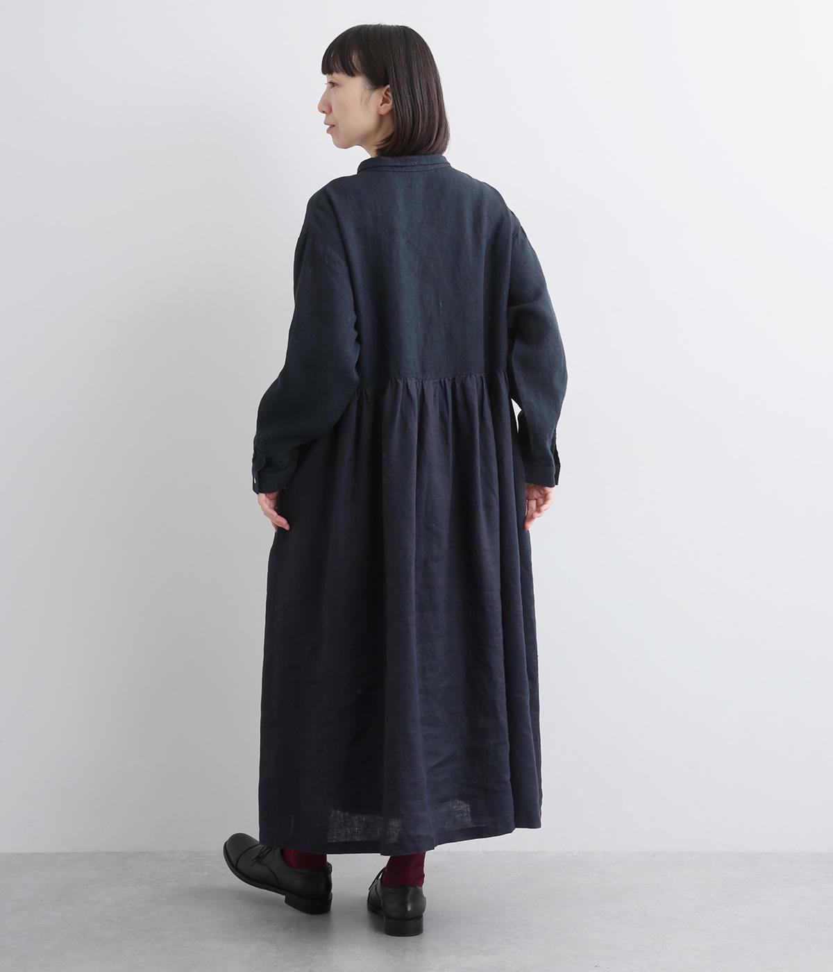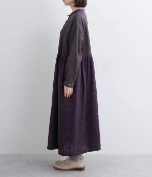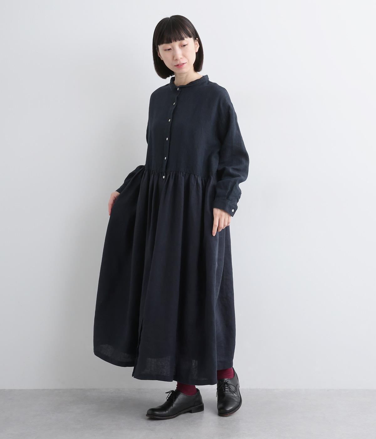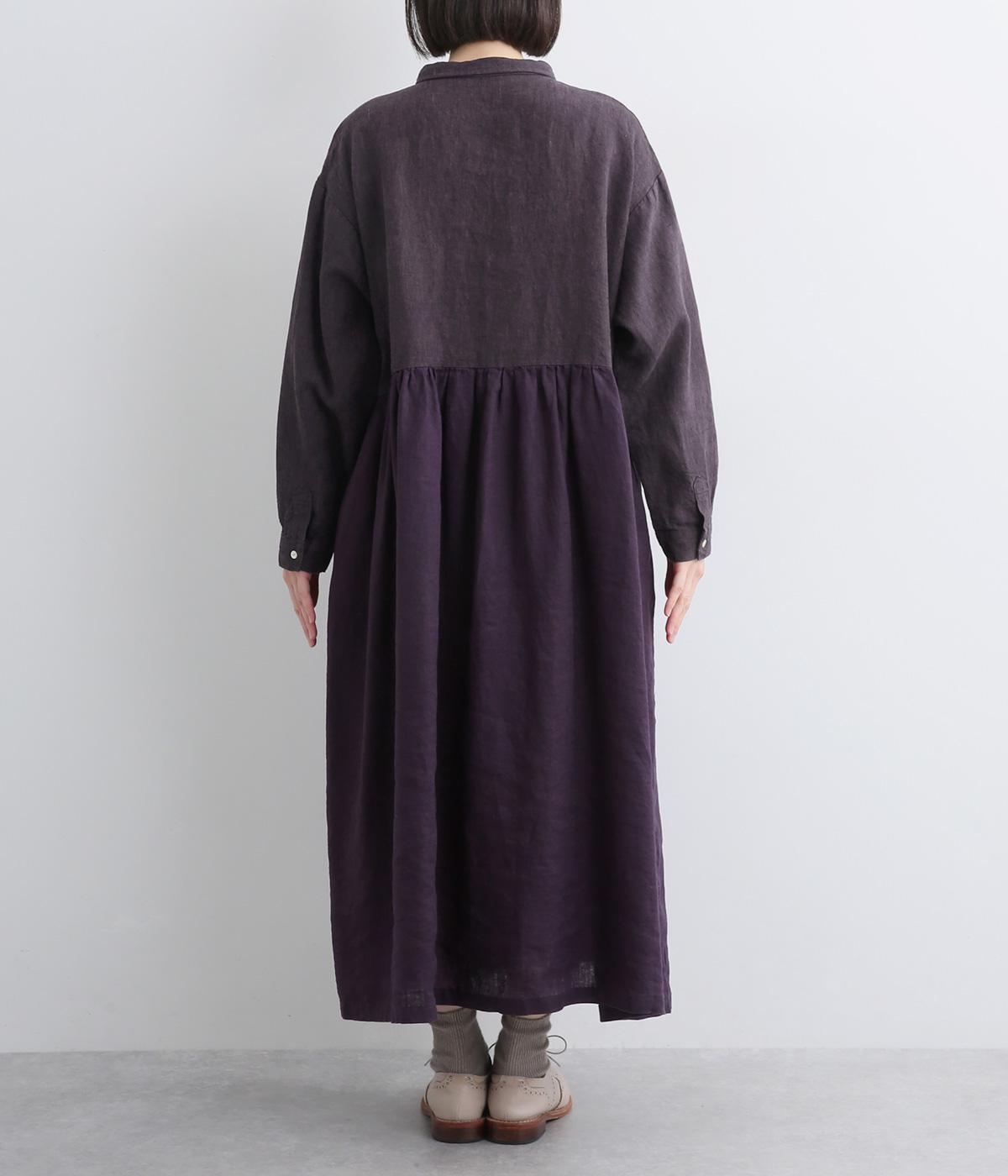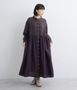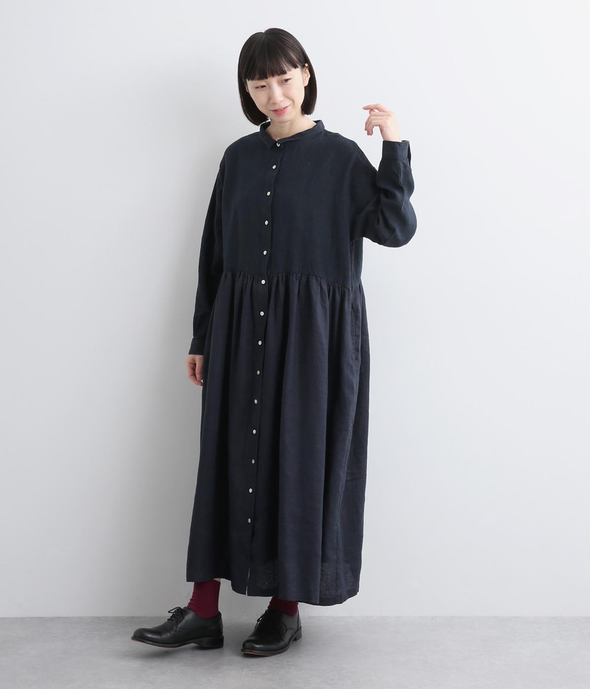糸の太さが異なるリネン生地を使って切り替えた、表情豊かなワンピースです。たっぷりギャザーで動きを出しながらも、素材特有の落ち感が出たリラクシーなシルエット。フロントのシェルボタンが品の良さを高めるアクセントに。
