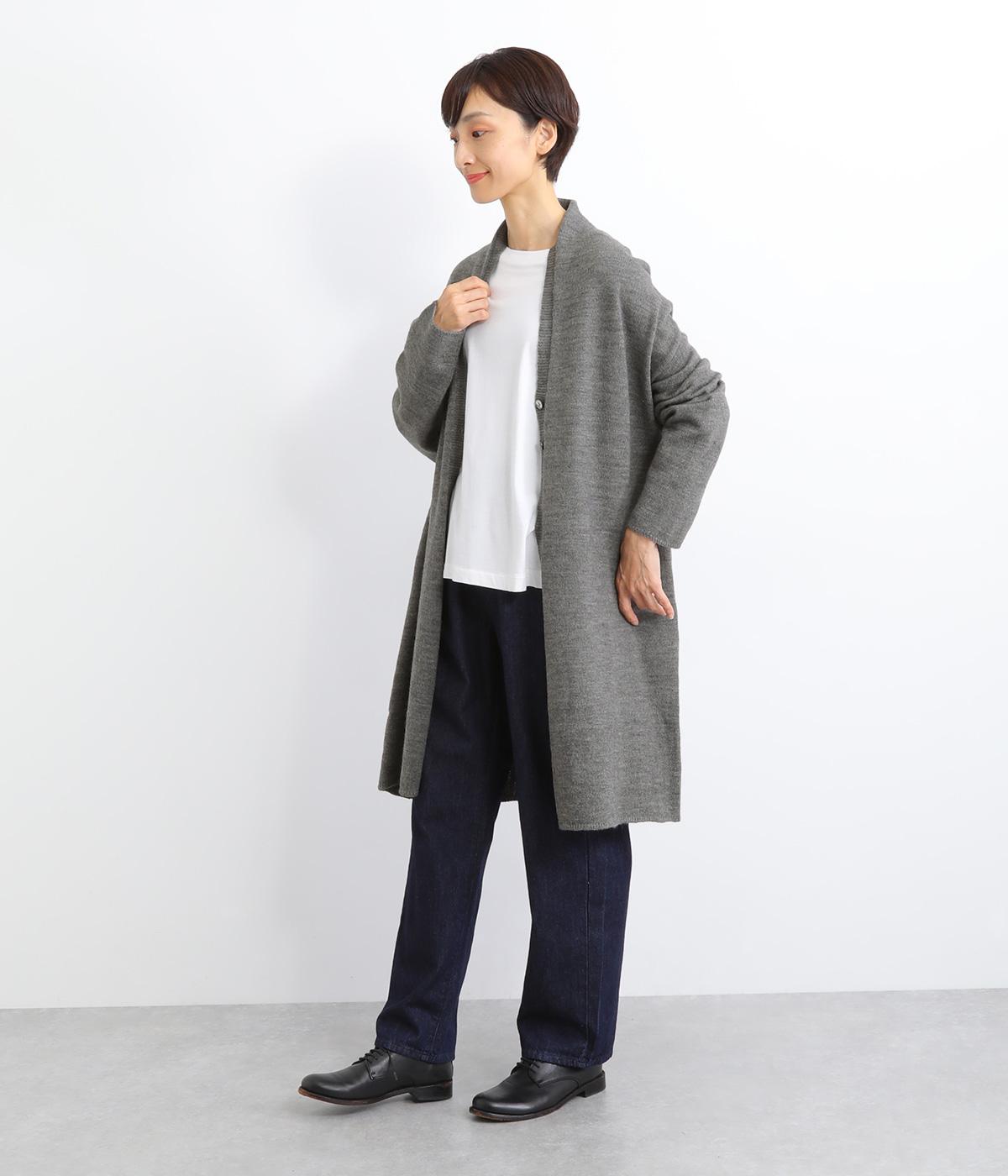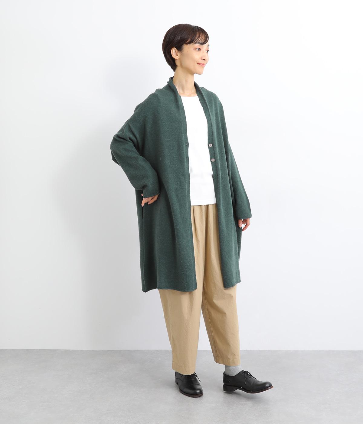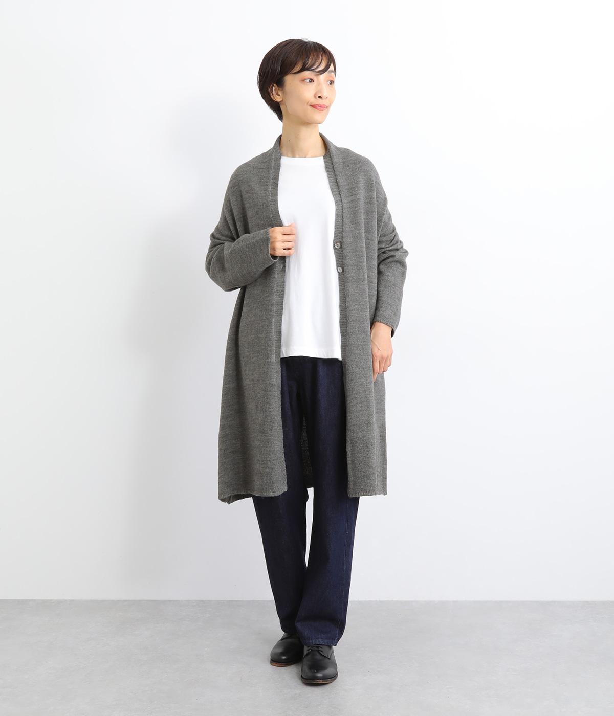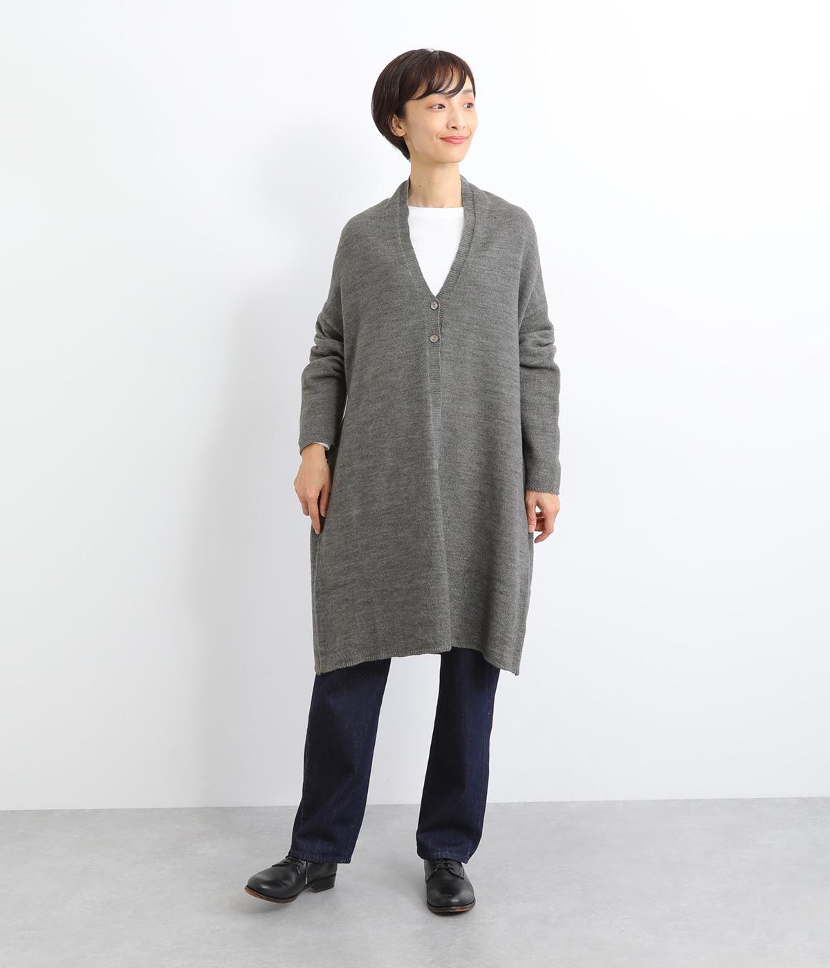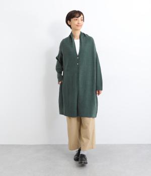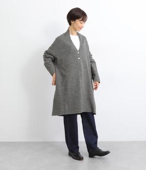 体のラインをカモフラージュしつつ、さまざまな装いに合わせやすいひざ上丈のロングカーディガン。首後ろに高さを出し、首元まであたたかく着用できます。フロントボタンは2つのみつけて、さっと羽織りやすく抜け感のあるデザインに仕上げました。