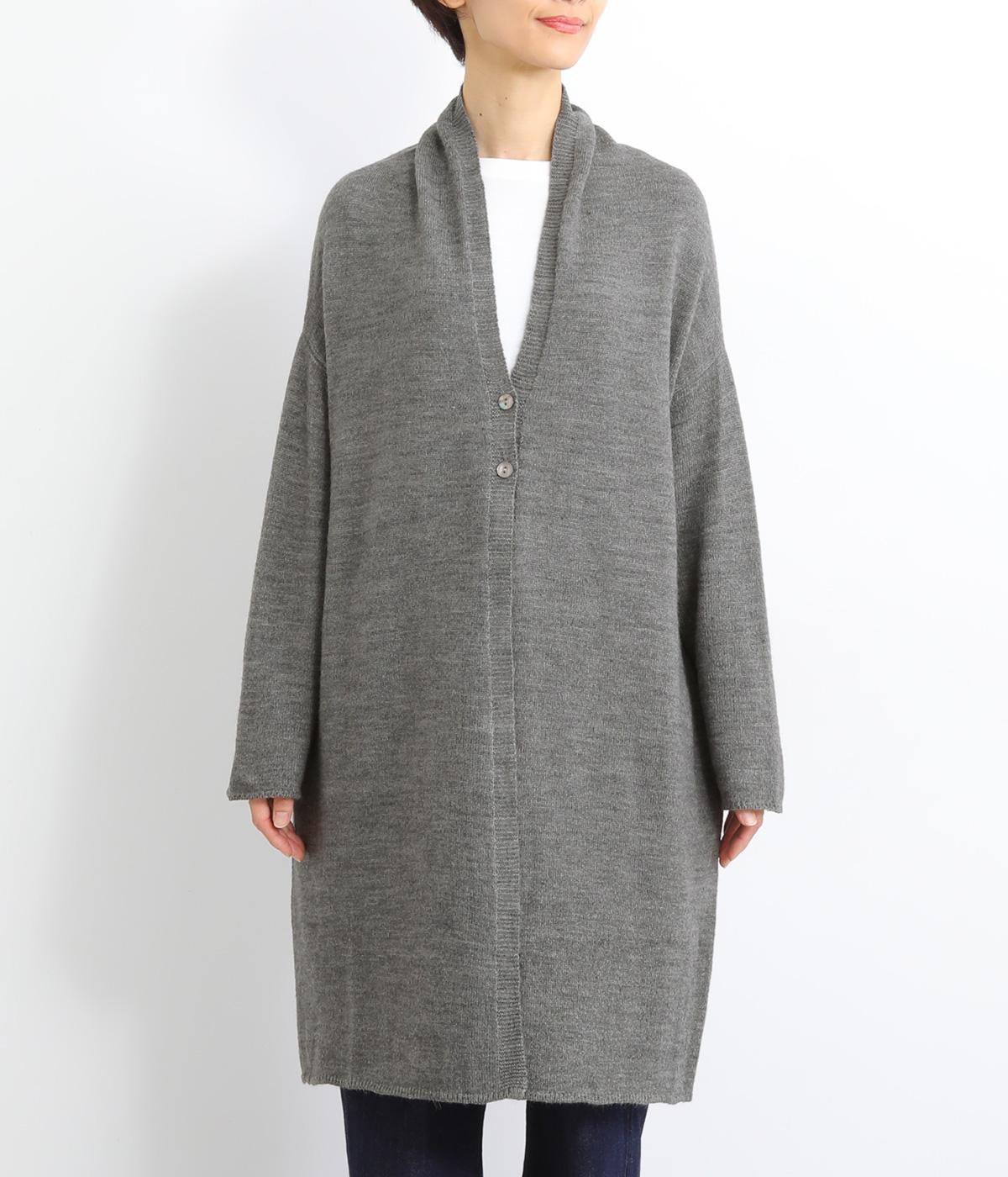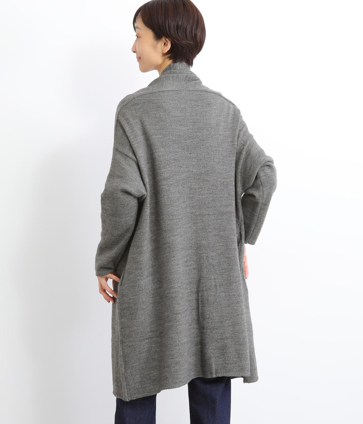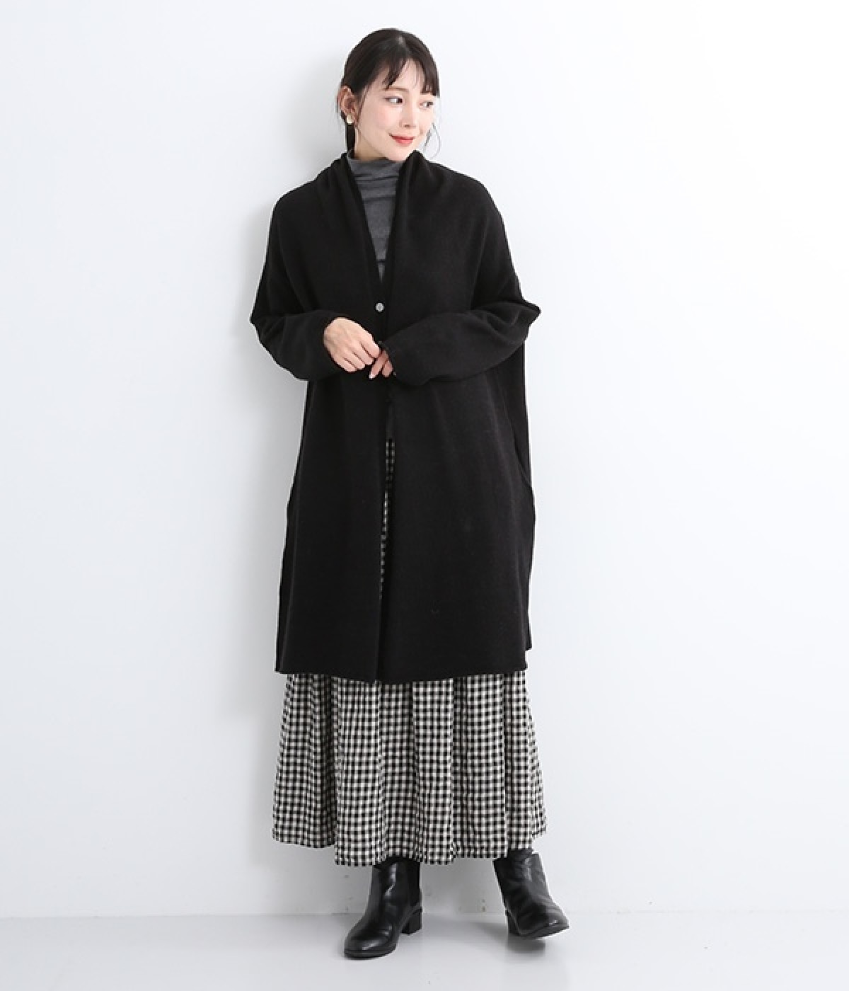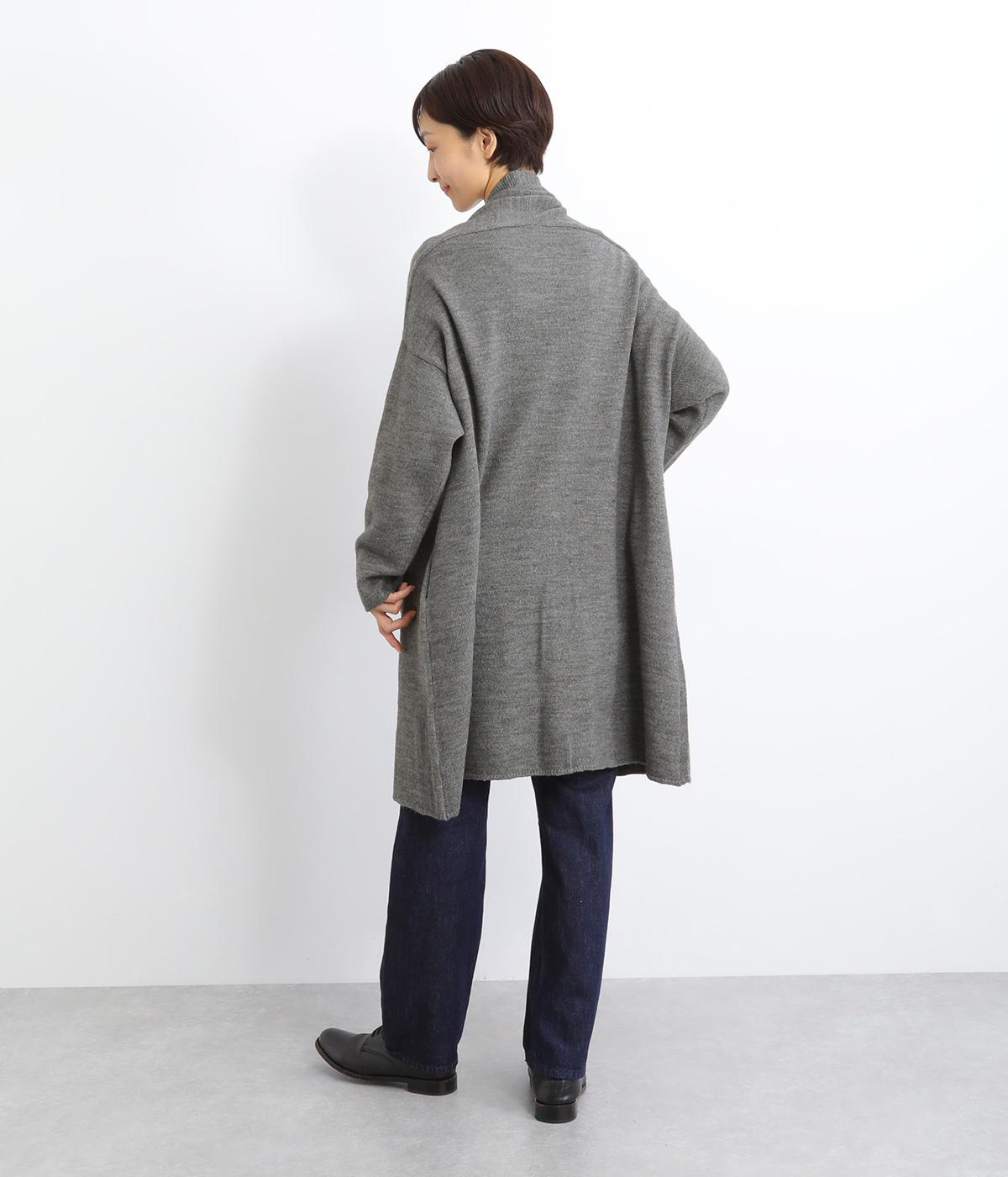 体のラインをカモフラージュしつつ、さまざまな装いに合わせやすいひざ上丈のロングカーディガン。首後ろに高さを出し、首元まであたたかく着用できます。フロントボタンは2つのみつけて、さっと羽織りやすく抜け感のあるデザインに仕上げました。