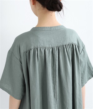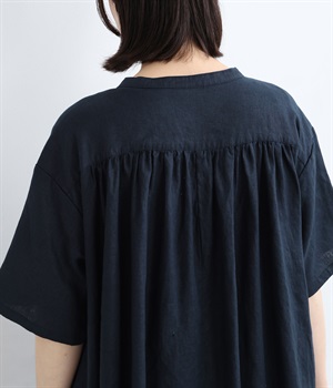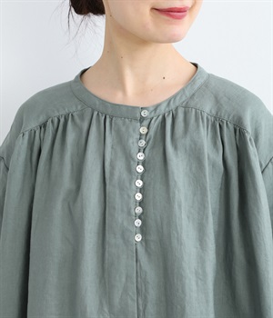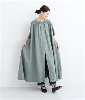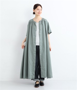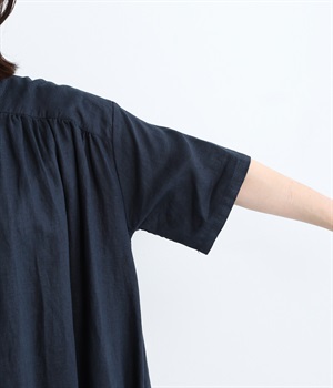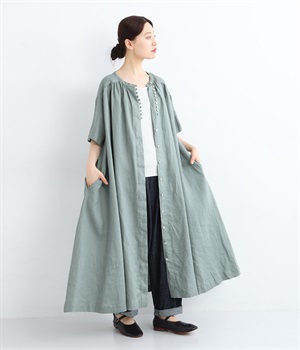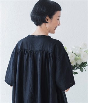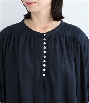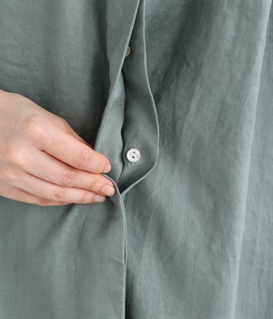 胸元から下は比翼仕立てでボタンが隠れているため、縦のラインがすっきりと整い、洗練された印象を与えてくれます。飽きの来ないデザインと上質なリネンを味方に、この夏のおしゃれをぜひお楽しみくださいね♪