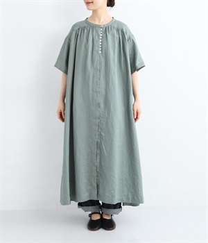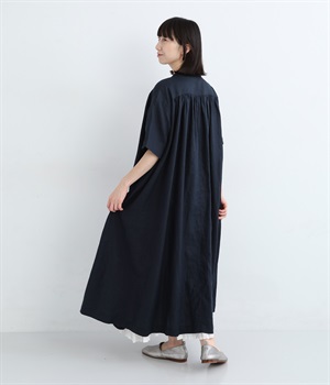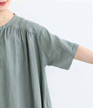 ゆったりとしたシルエットに、ネックラインから入った細やかなギャザーがやさしい表情を添えるワンピース。華美すぎず、シンプルすぎない絶妙なバランスで、日々の装いにそっと寄り添ってくれます。