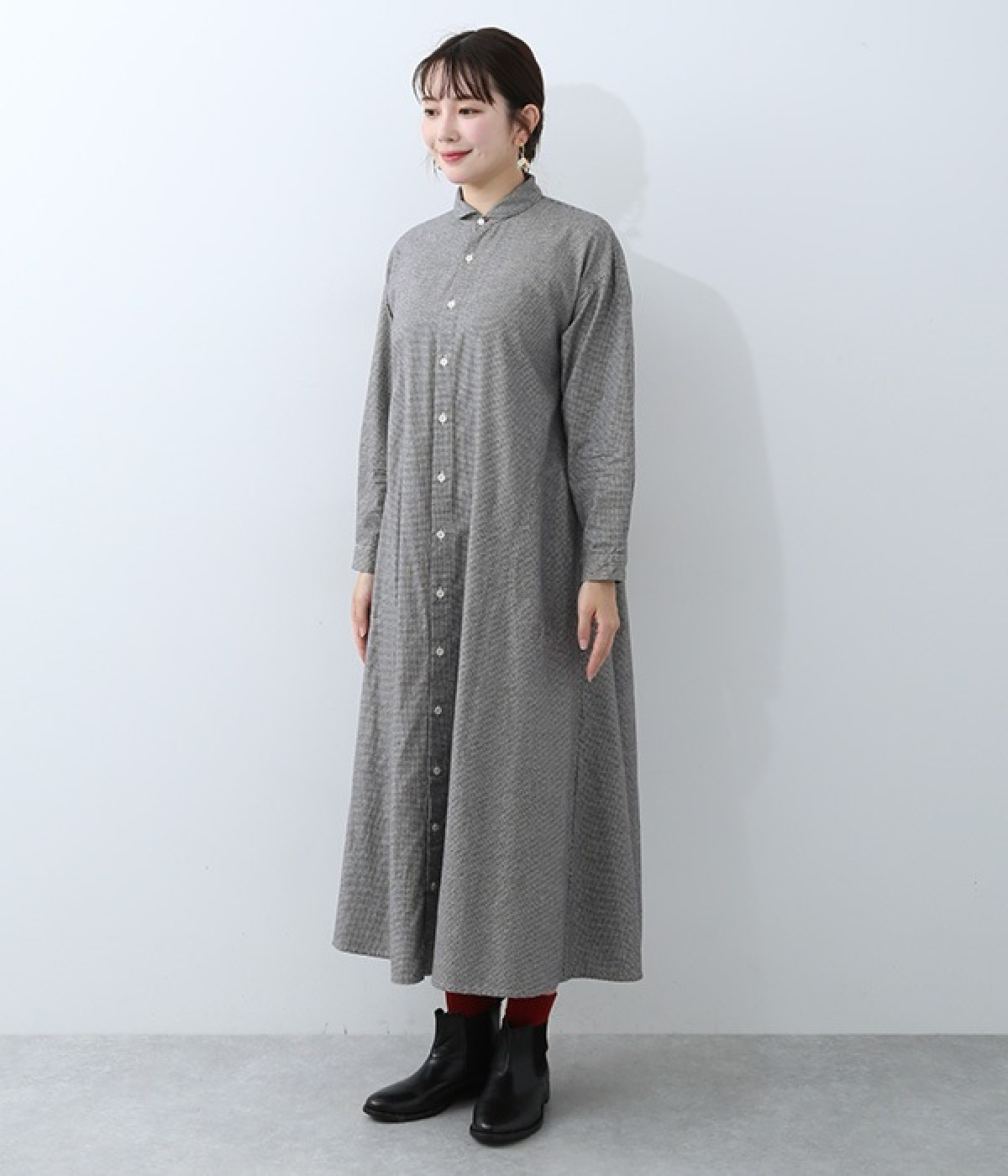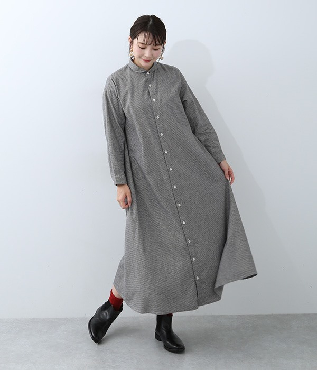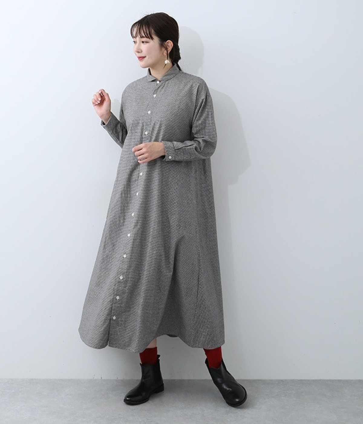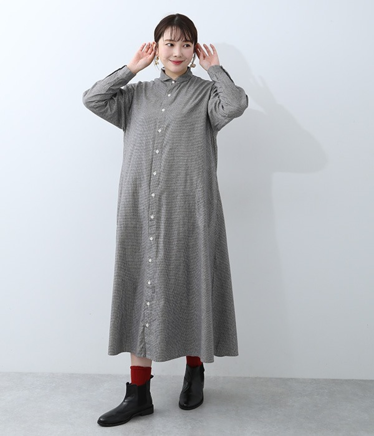 コットン起毛生地を使用した、柔らかく肌触りが良いシャツワンピースです。切り替えによってフレアに広がる、ほどよいボリューム感の美しいシルエットを表現。一枚でもしっかりとコーディネートが決まり、パンツやスカートとのレイヤードスタイルも相性抜群です。前を開けてロング丈の羽織りとして、季節の変わり目のスタイリングに取り入れるのもおすすめ。