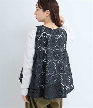 華やかな印象のレース模様が素敵なベストです。裾にむかってゆるやかに広がるフレアシルエットが上品な仕上がり。首もとと肩まわりはコンパクトな作りで、すっきりと大人っぽく着られます。透け感があるので、インナー次第で装いに変化が出せるのもポイント。タートルニット、半袖カットソー、ノースリーブトップスなどさまざまなレイヤードが楽しめる一枚です。