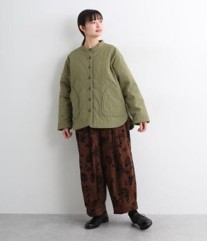 ボタンやラウンドカットの裾、バンドカラーなど随所にシャツディティールを取り入れたジャケット。大きめのひょうたんキルト地でカジュアルに仕上げました。裾に前後差をもたせることで、丸みを帯びた女性らしいシルエットにしています。