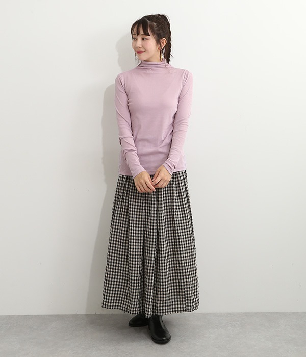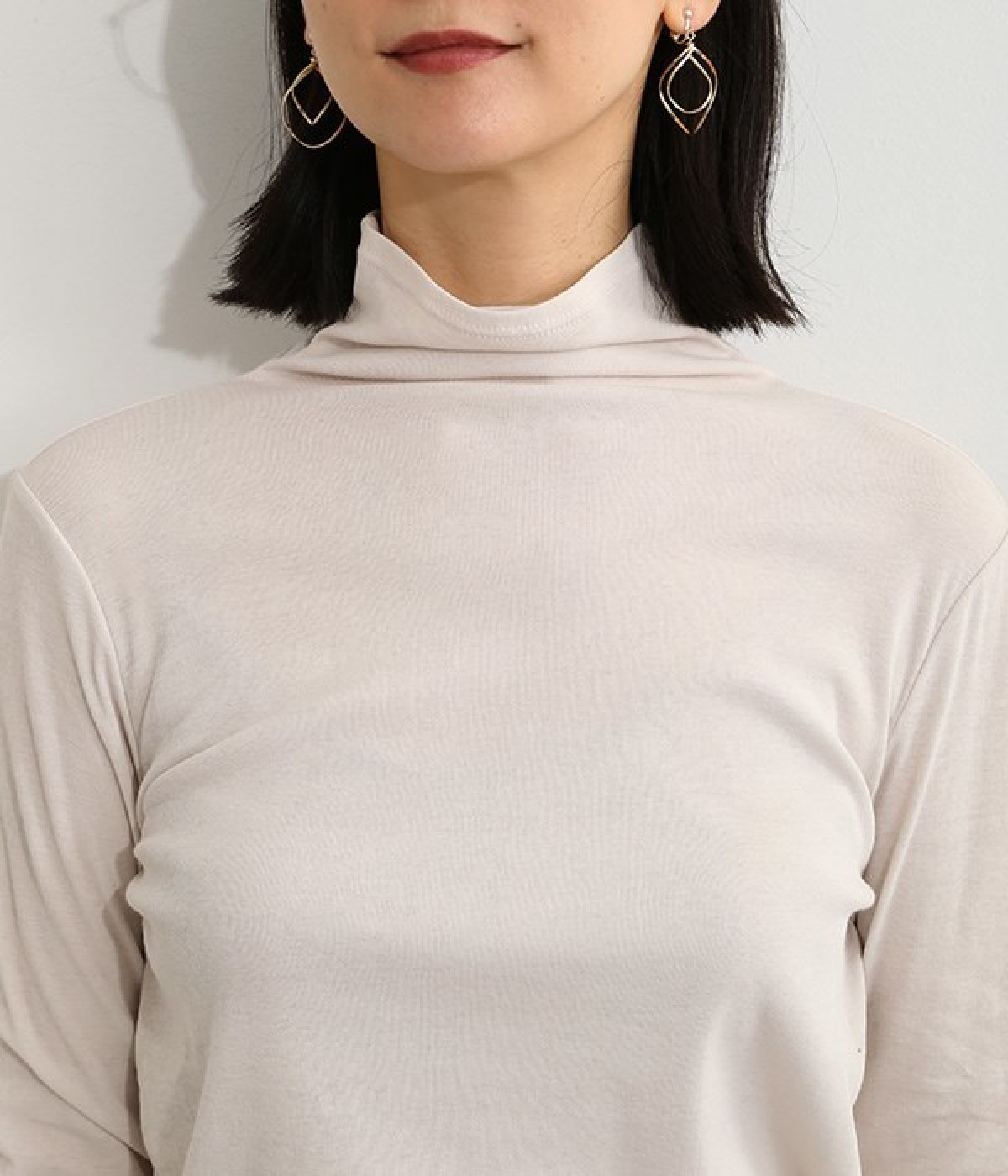 ハイネックで首元をカバーしながらも、くしゅっとしたやわらかなデザインで締めつけが少ないプルオーバーです。強撚糸をガス焼きすることで、ドライタッチな風合いに仕上げたコットンのガーゼフライスを使用。品の良い透け感がある薄手の素材なので、ニットやワンピースのインナーとしても重宝します。袖口を見せて配色を楽しめるように、袖丈は少し長めに設定しました。