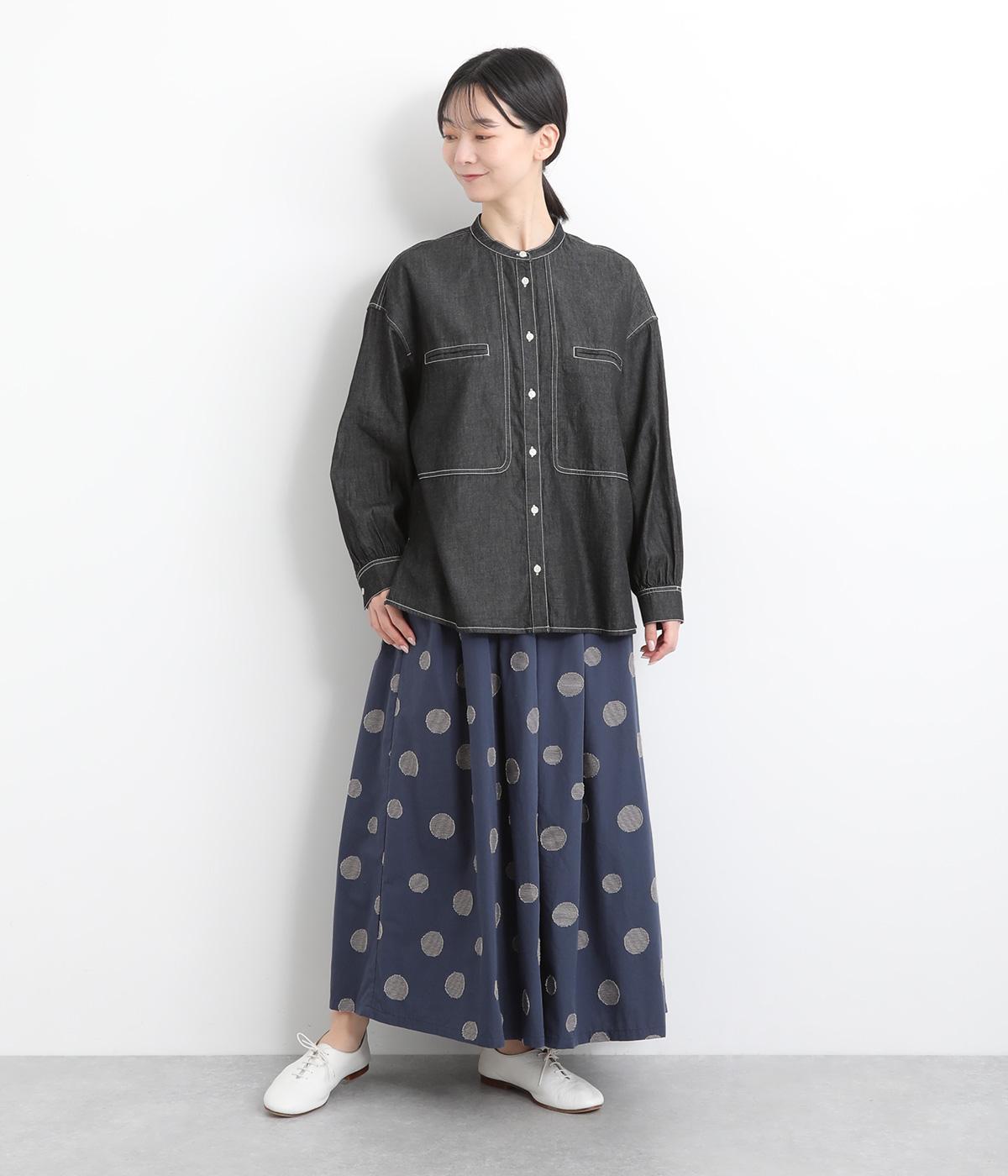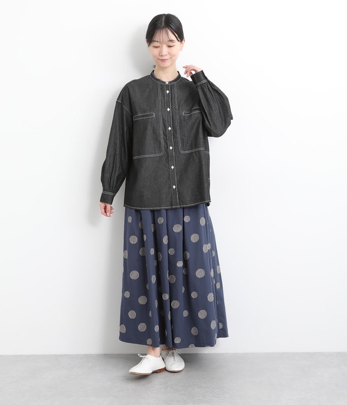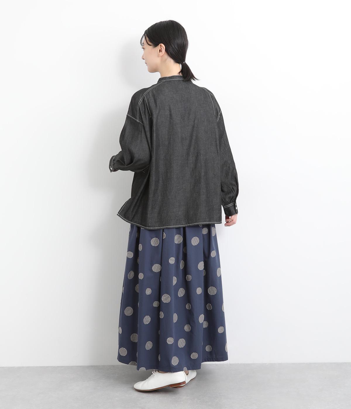 大小のドット柄をランダムに織り上げたジャカード生地を使用しました。ややハリがあり、さらりとしたしなやかな肌ざわりが特徴です。