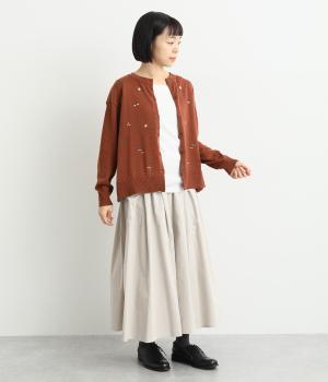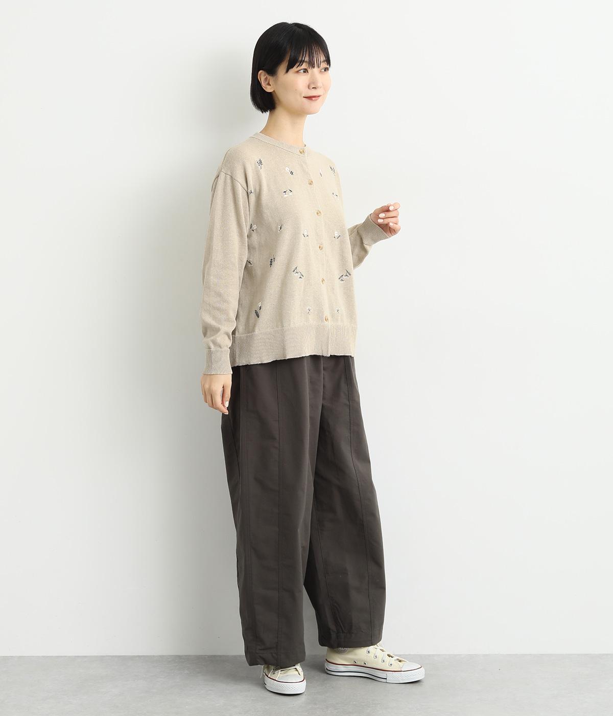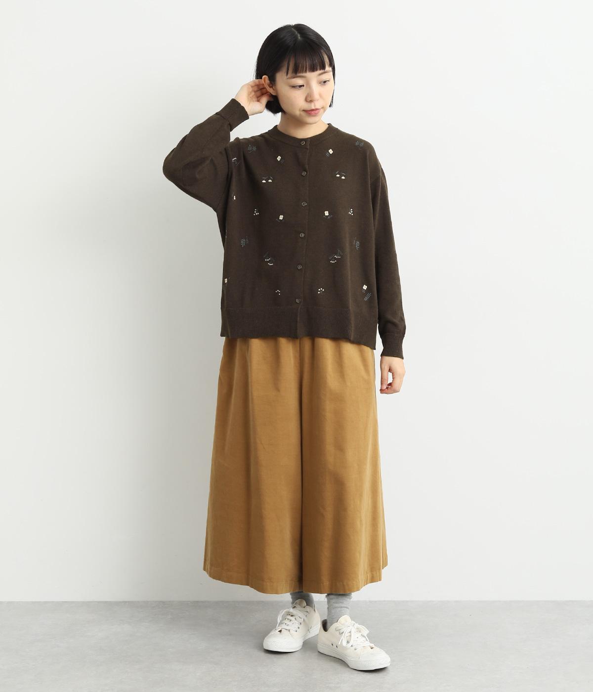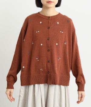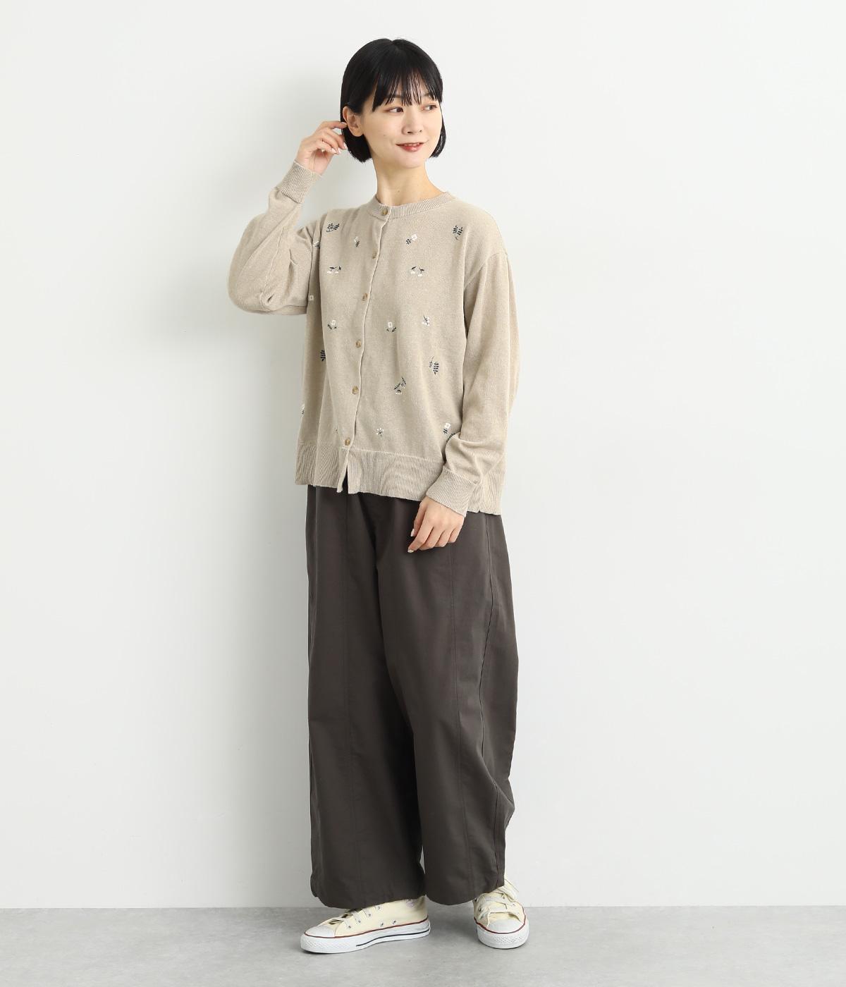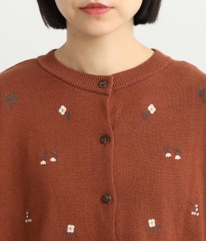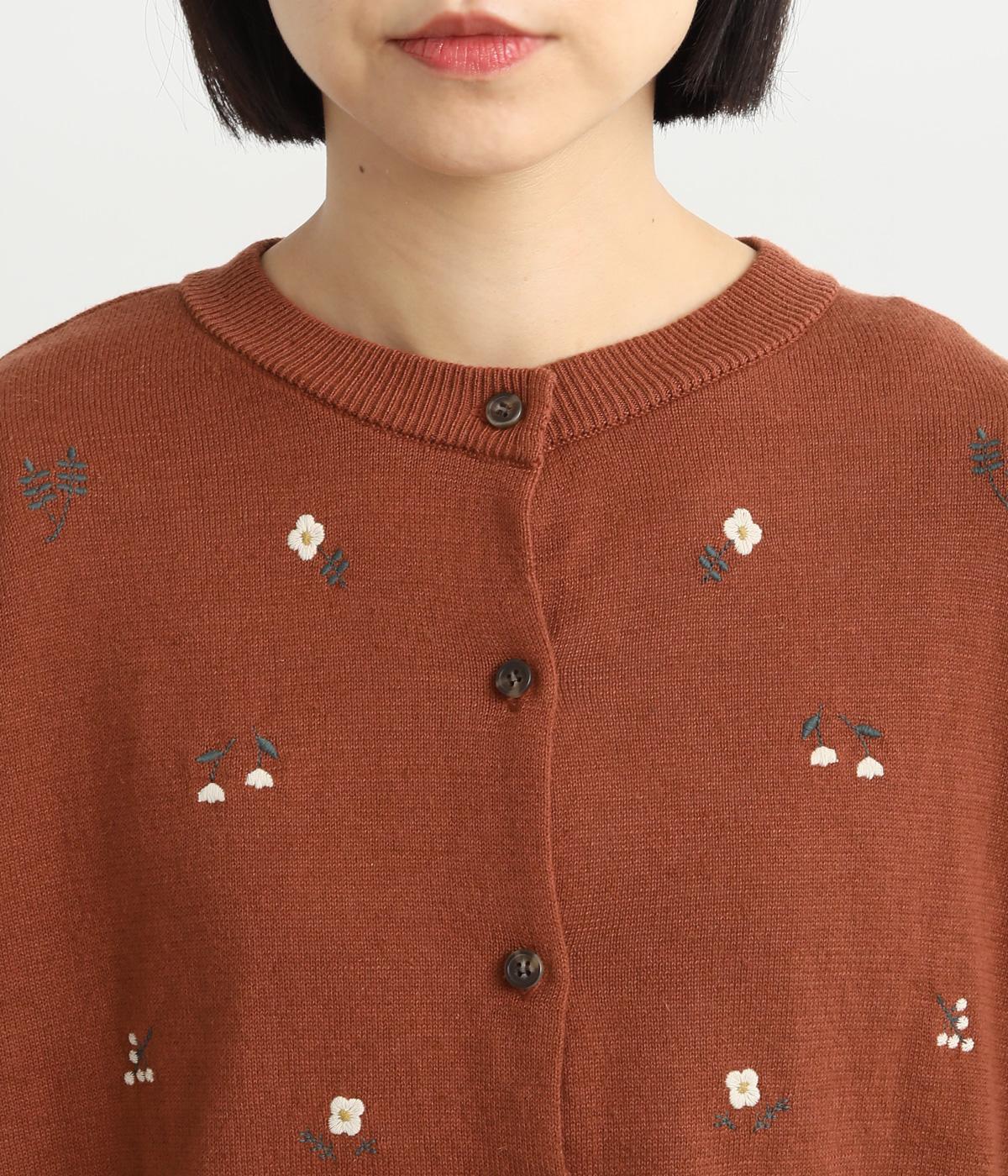 ドロップショルダーのリラックス感なるカーディガンは、前身頃に花柄刺しゅうをほどこしてガーリーテイストに仕上げました。品のいいラウンドネックで、ボタンを留めてトップス感覚でスタイリングするのも◎。