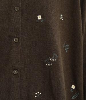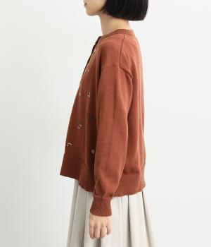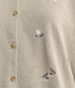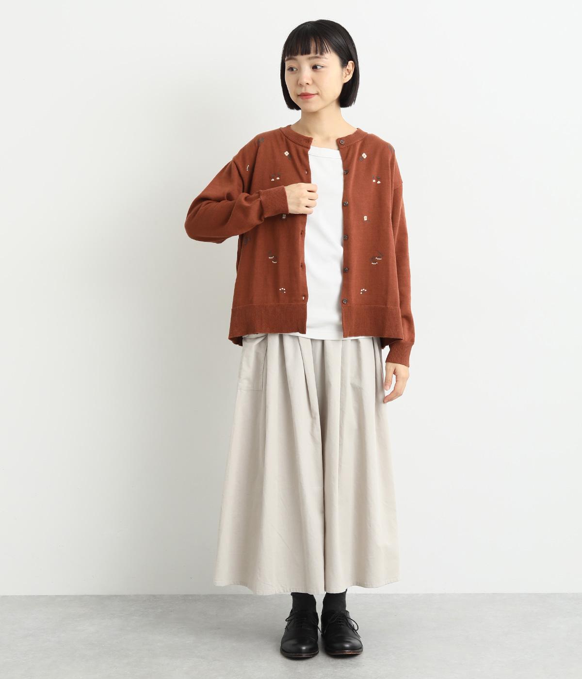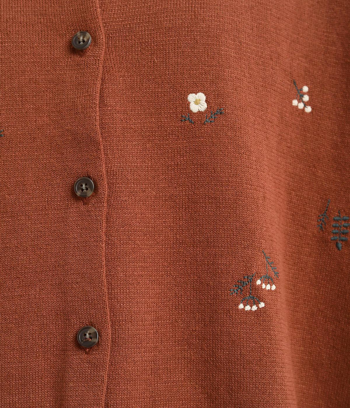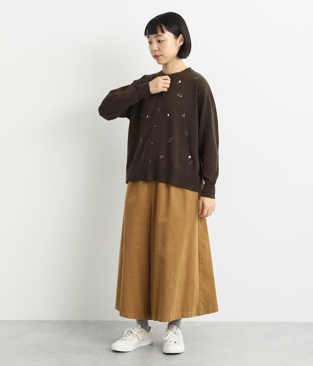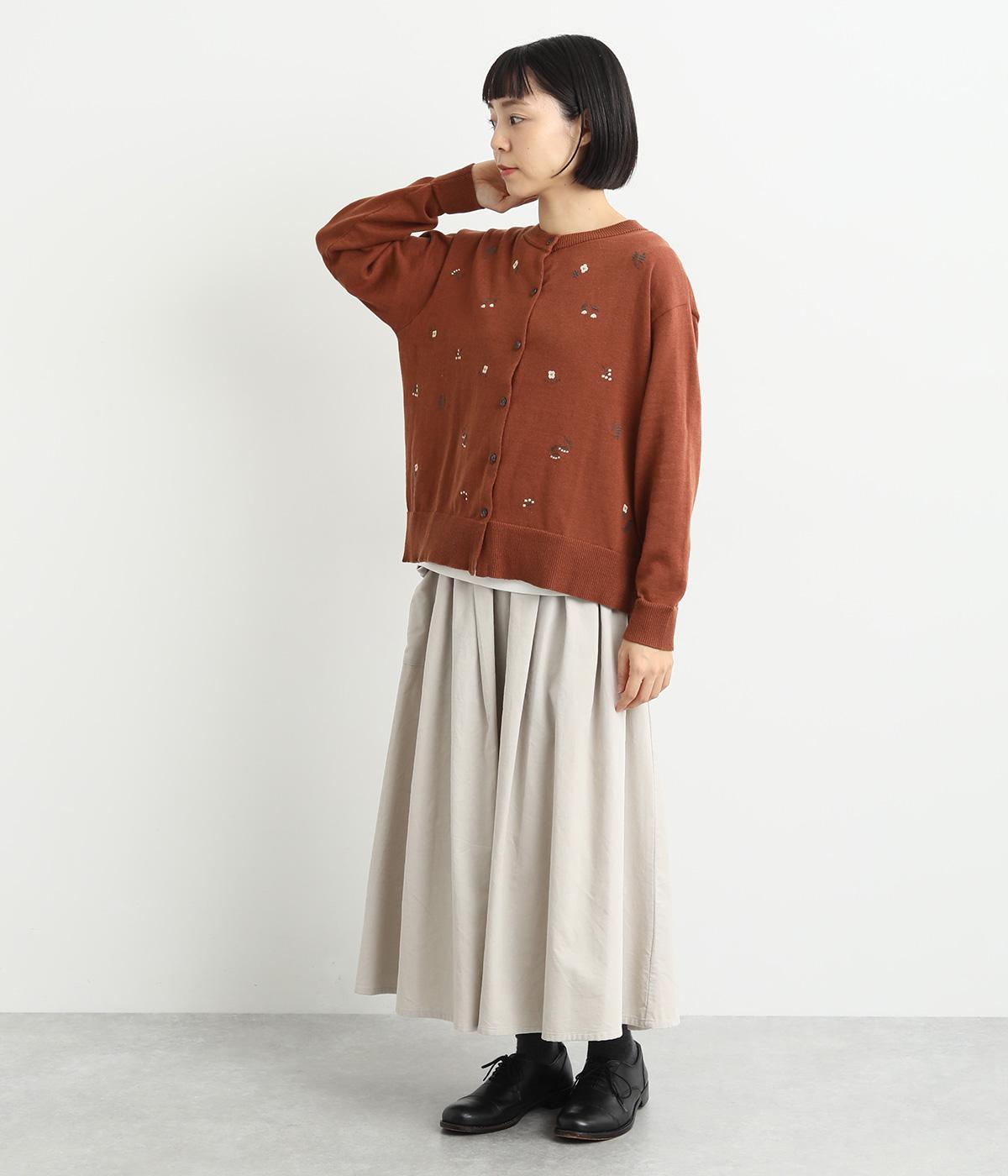 ドロップショルダーのリラックス感なるカーディガンは、前身頃に花柄刺しゅうをほどこしてガーリーテイストに仕上げました。品のいいラウンドネックで、ボタンを留めてトップス感覚でスタイリングするのも◎。