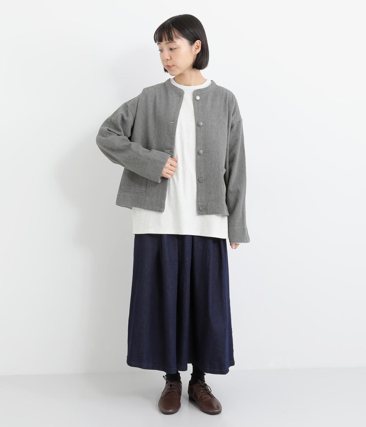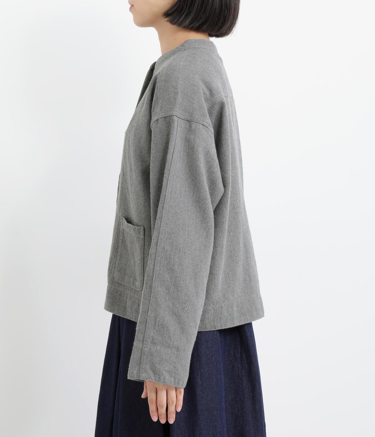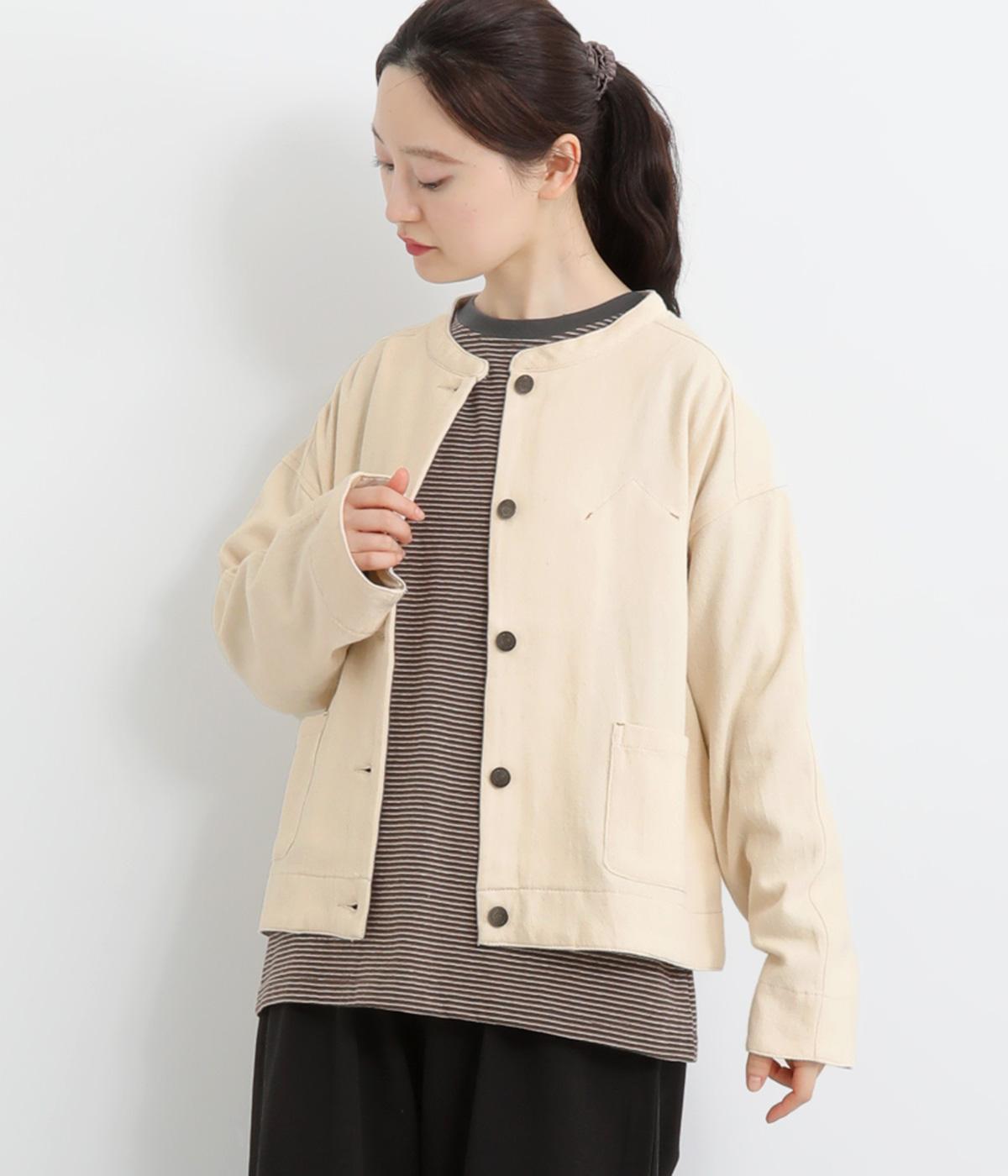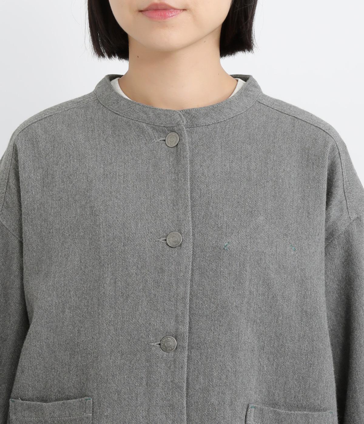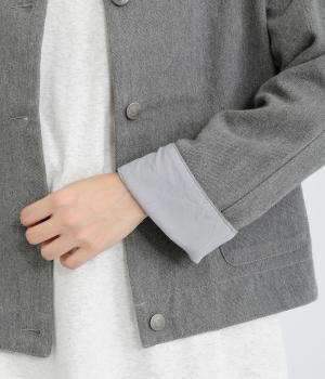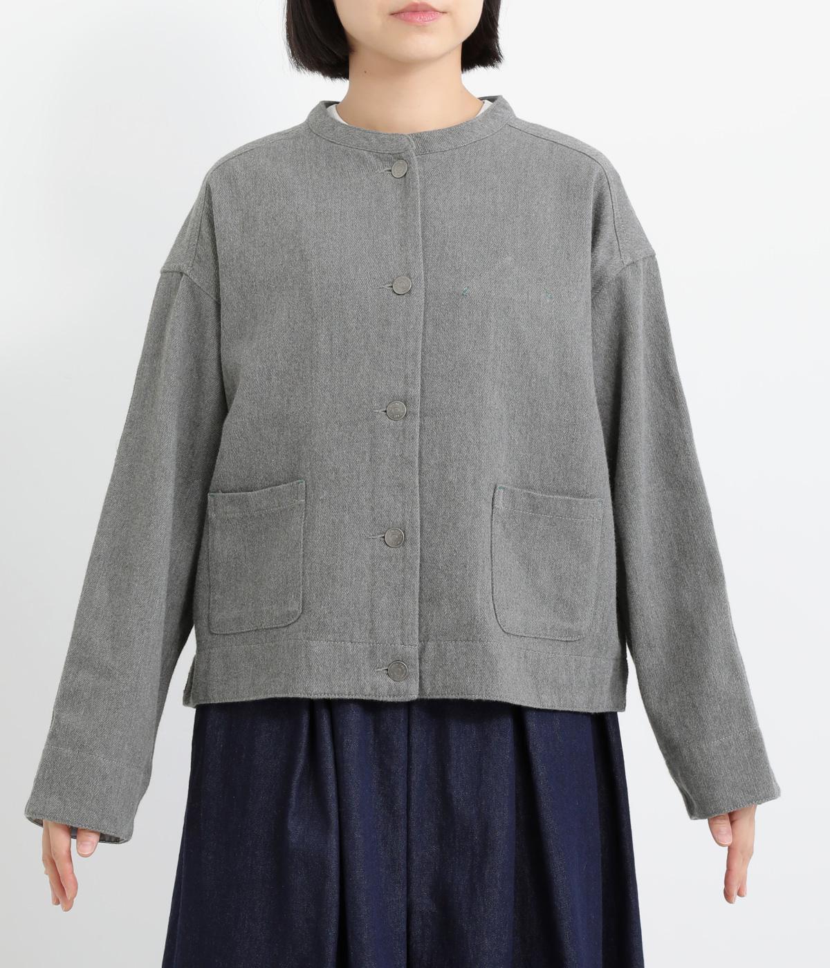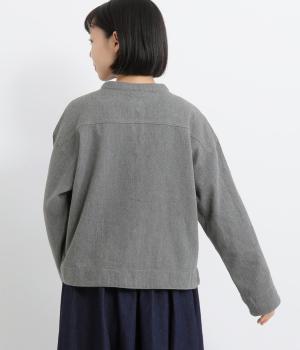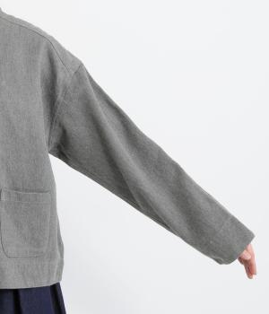 シンプルでゆとりのあるフォルムのジャケットです。ドロップショルダーとやや大きく広がる首元がやわらかさを印象付けます。スナップボタンをしっかり閉めてフォーマルに、いくつか開けてカジュアルにも着こなせます。胸元には小さな内ポケット付き。