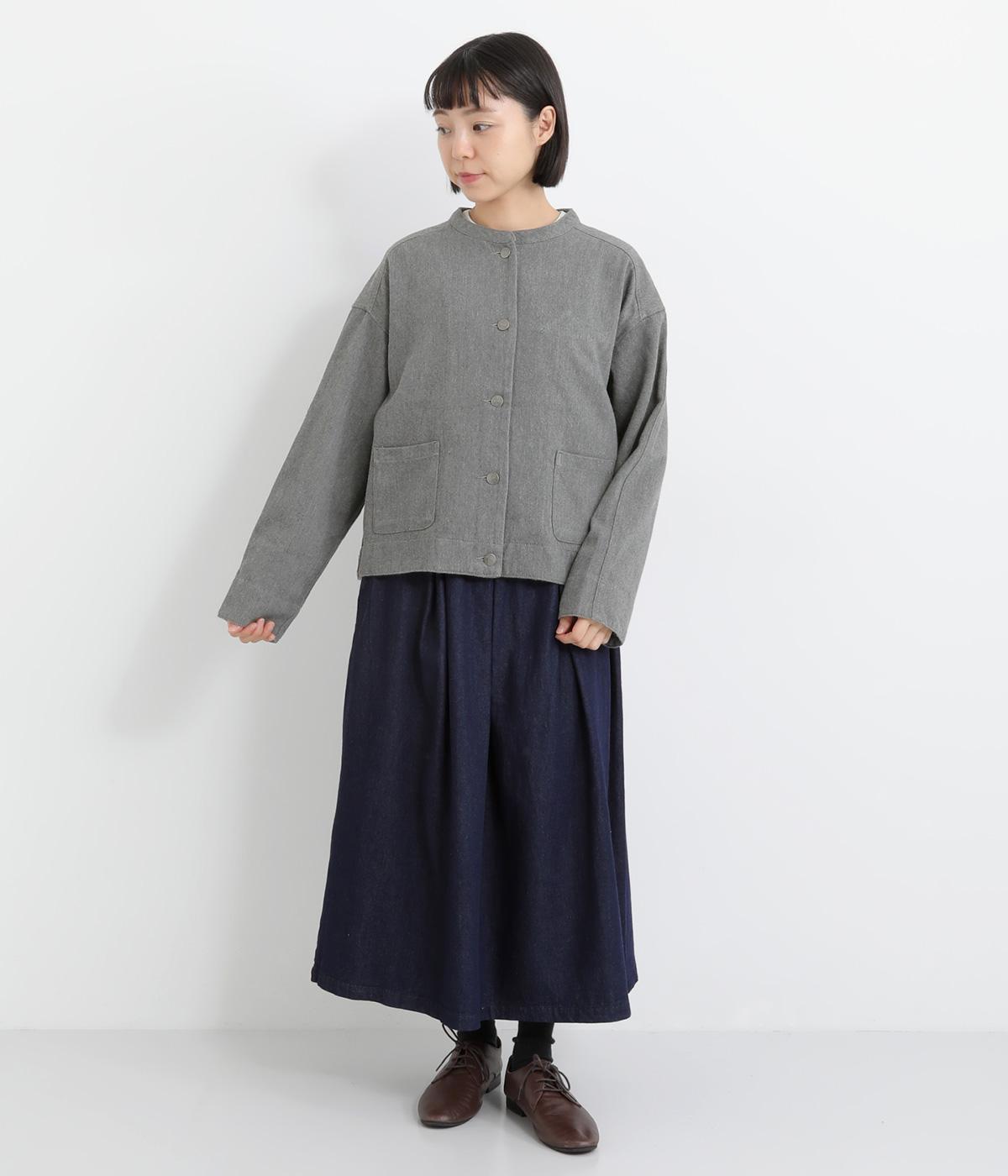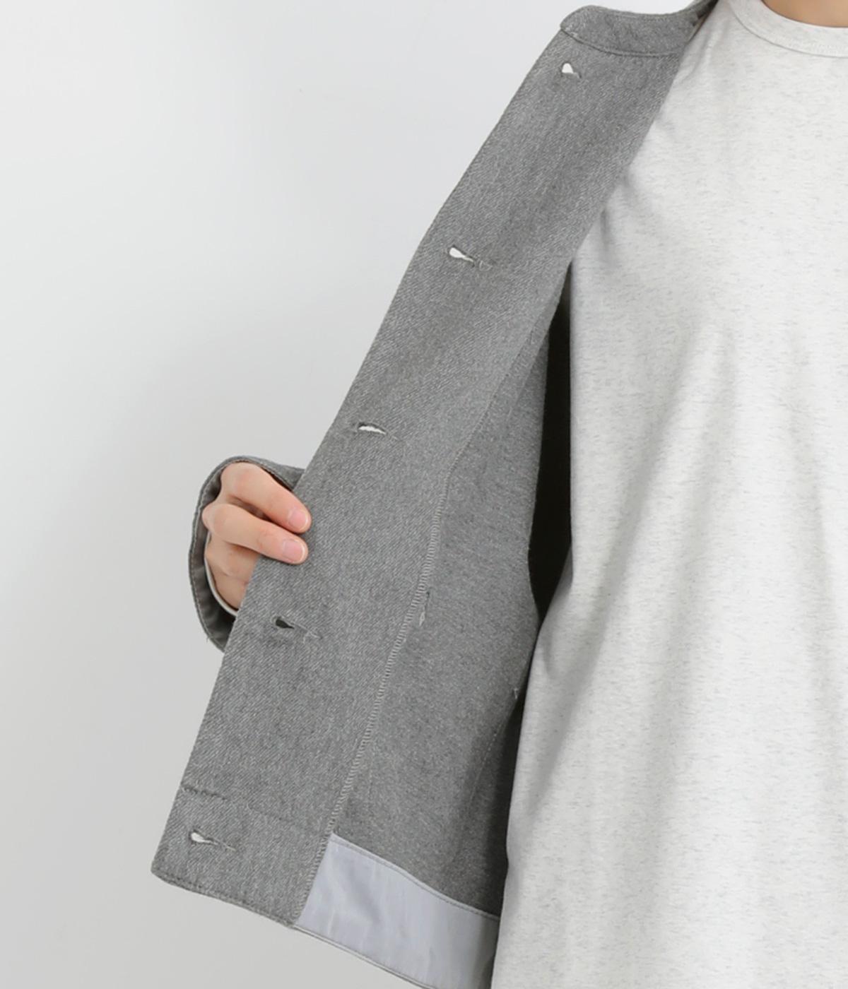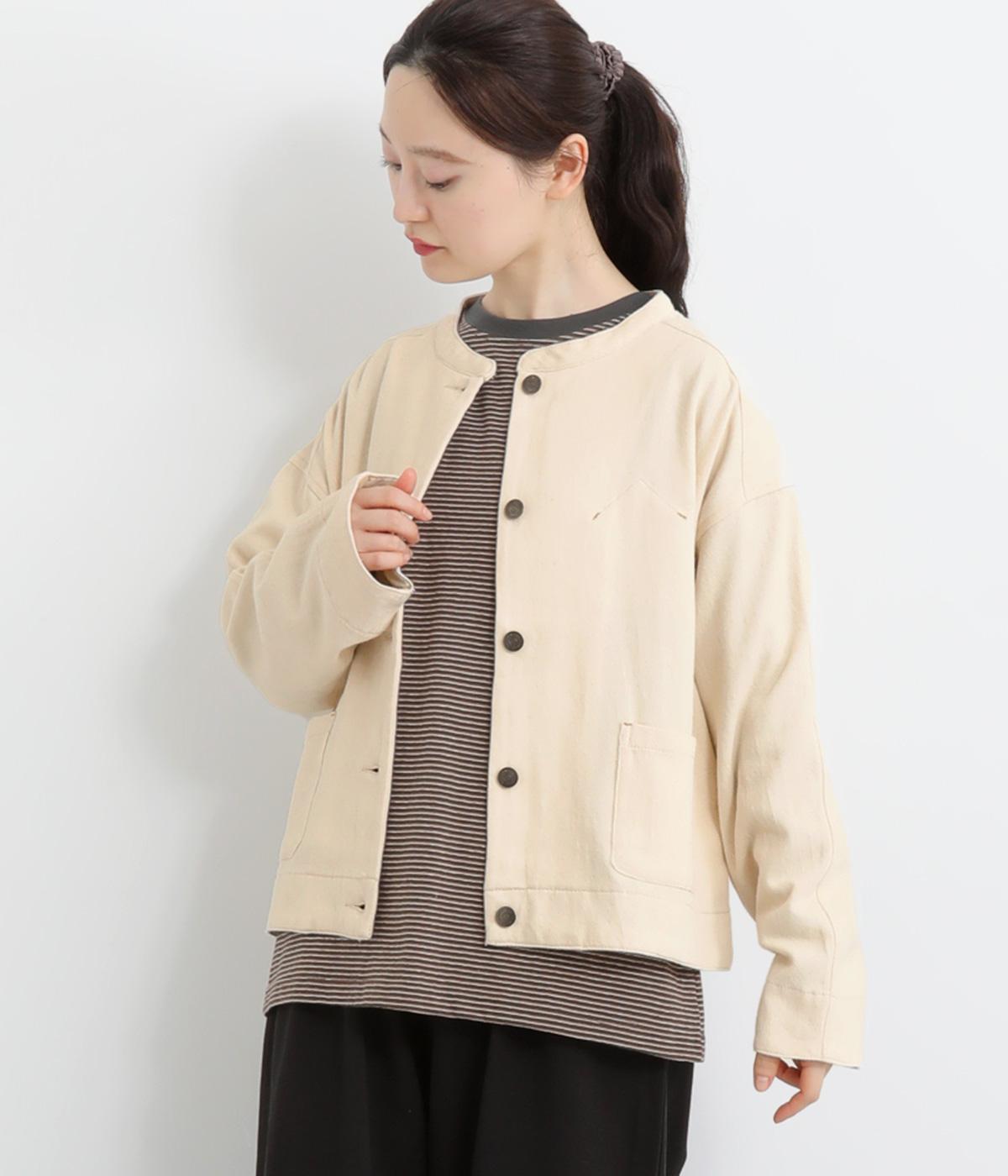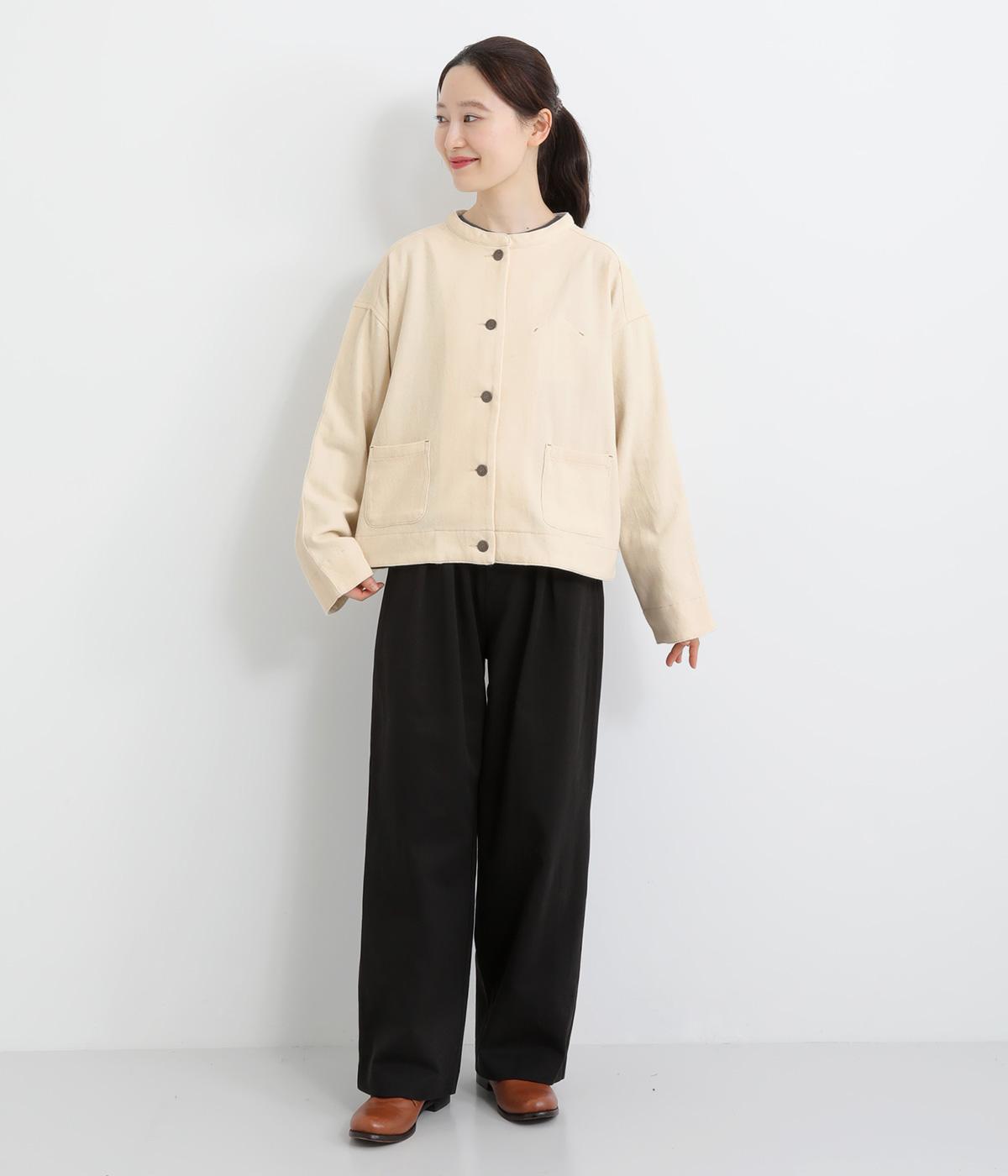 シンプルでゆとりのあるフォルムのジャケットです。ドロップショルダーとやや大きく広がる首元がやわらかさを印象付けます。スナップボタンをしっかり閉めてフォーマルに、いくつか開けてカジュアルにも着こなせます。胸元には小さな内ポケット付き。