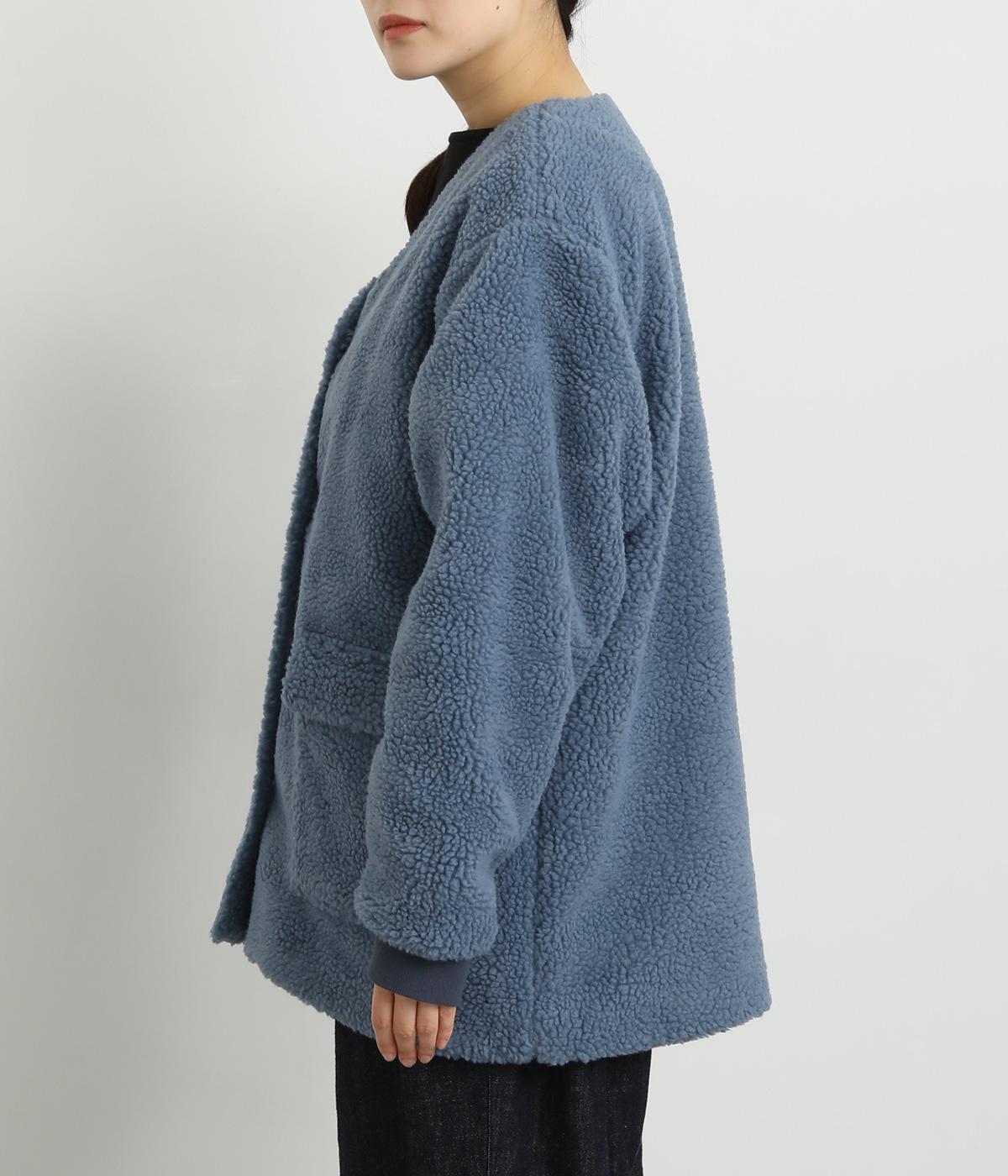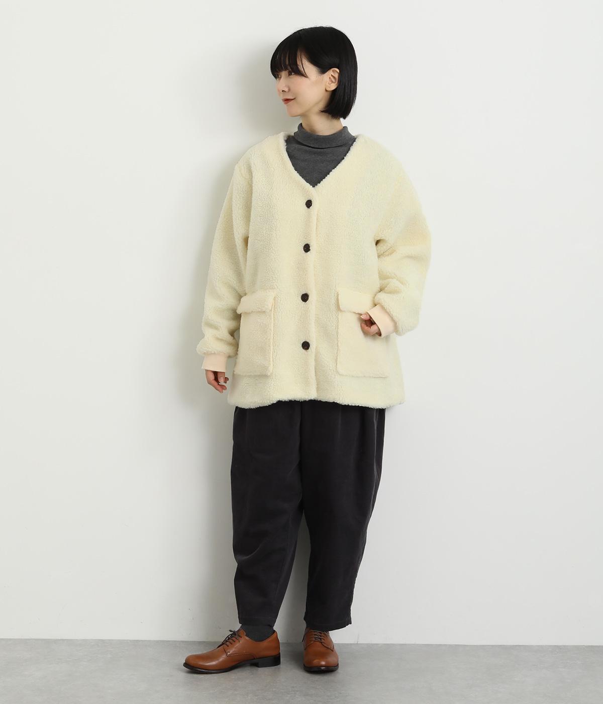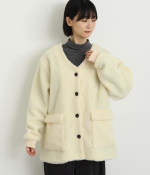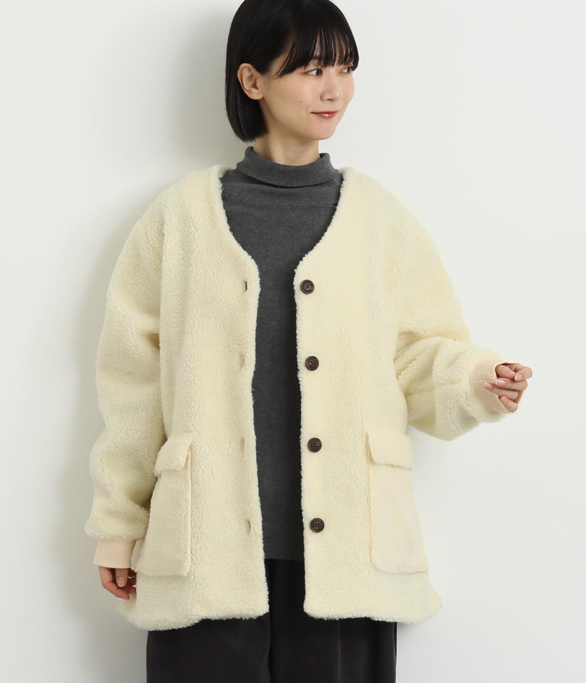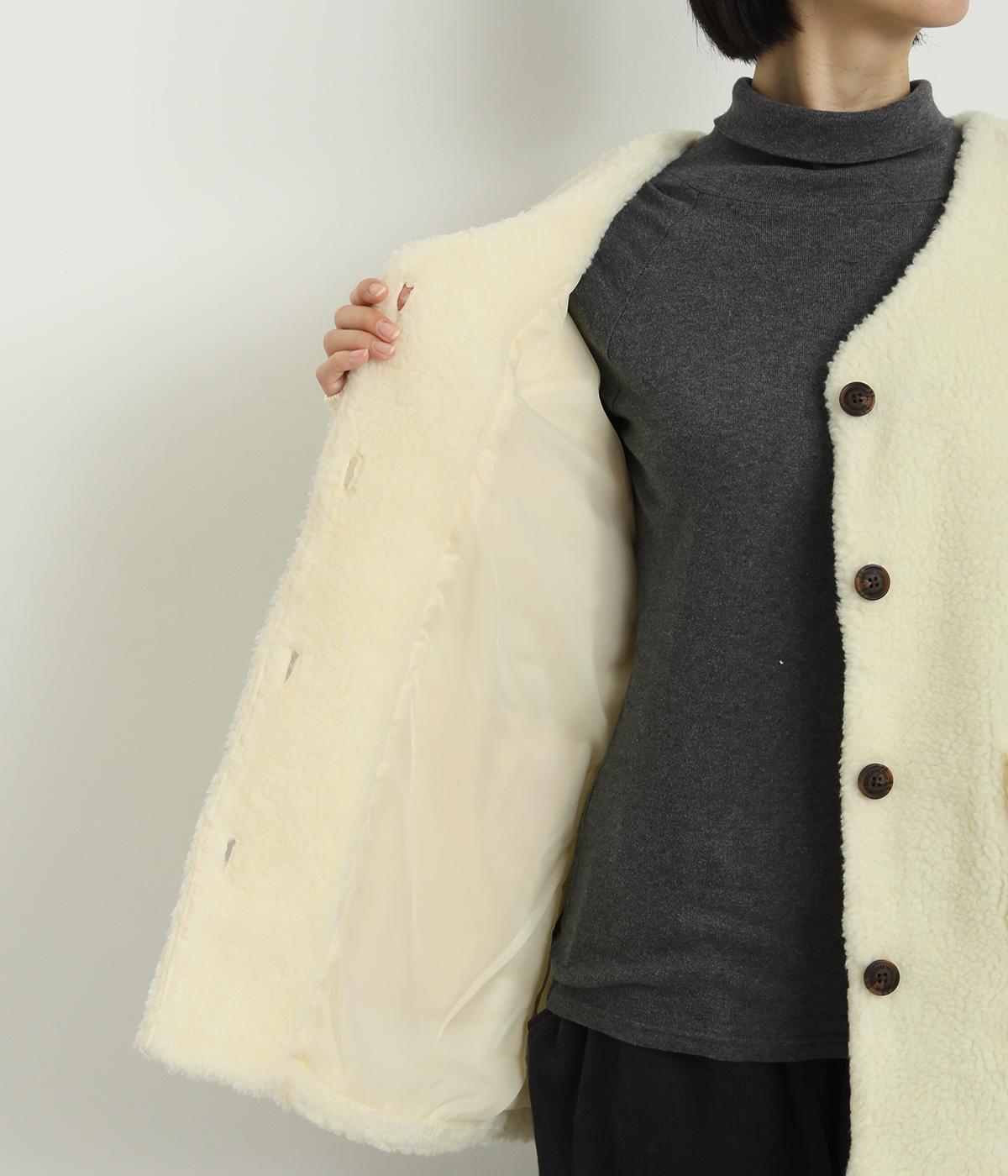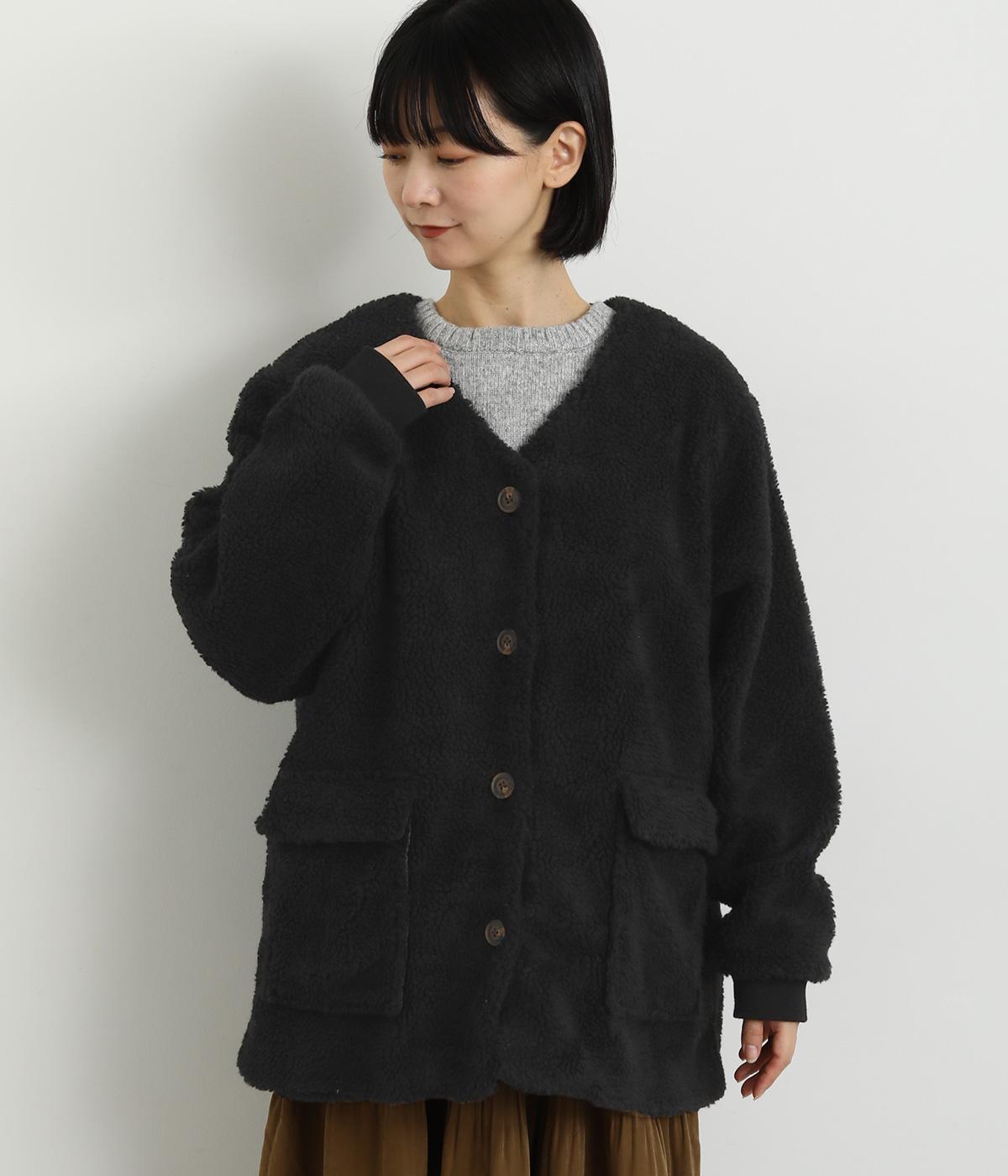 もこもことした表面感が可愛らしい印象を与える、やわらかくふっくらとしたボアフリース素材を使用しています。すべりのいい裏地つきで袖の通りもスムーズです。