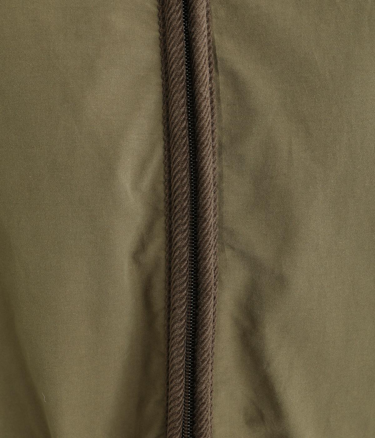タフなコットンナイロンを表地に、裏面にはボアを配してあたたかに仕上げました。適度に肉感があり、寒い季節に重宝する一着。パイピングには畝のある別生地をセレクト。