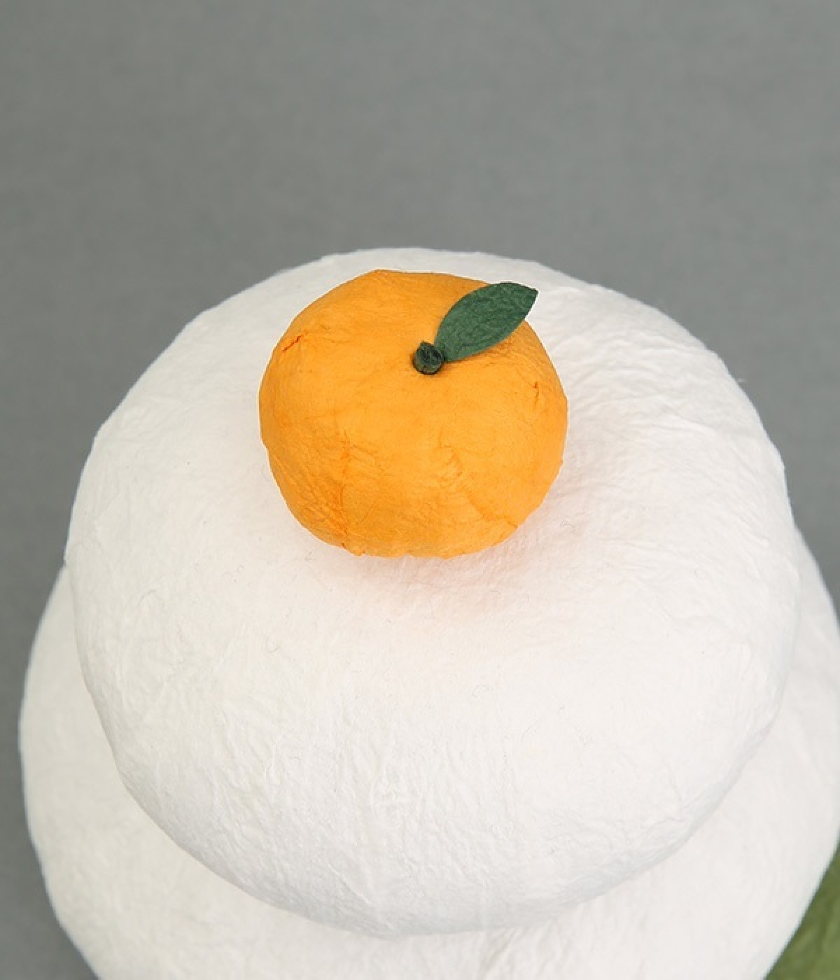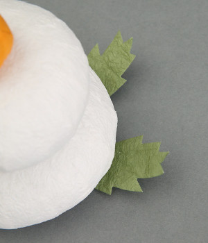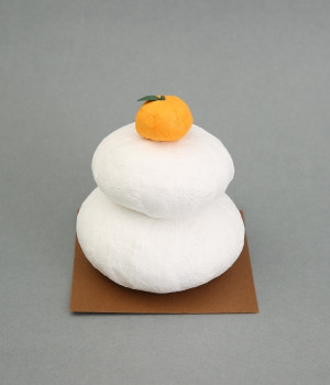 和紙でできたお正月飾りです。新しい一年の福を持ってくる歳神さまは、供えられたお餅に腰掛け、宿るといわれています。お餅のまんまるは円満をあらわし、お餅を二つ重ねるのは「福が重なる」「めでたく年をとる」という意味が込められています。和紙製なので軽量で、棚の上などにも安全に飾ることができます。和紙のでこぼことした表情が、まるで本物のお餅のよう。ミカンの質感や葉っぱまで、丁寧に表現されています。毎年繰り返して使えるのもうれしいポイント。