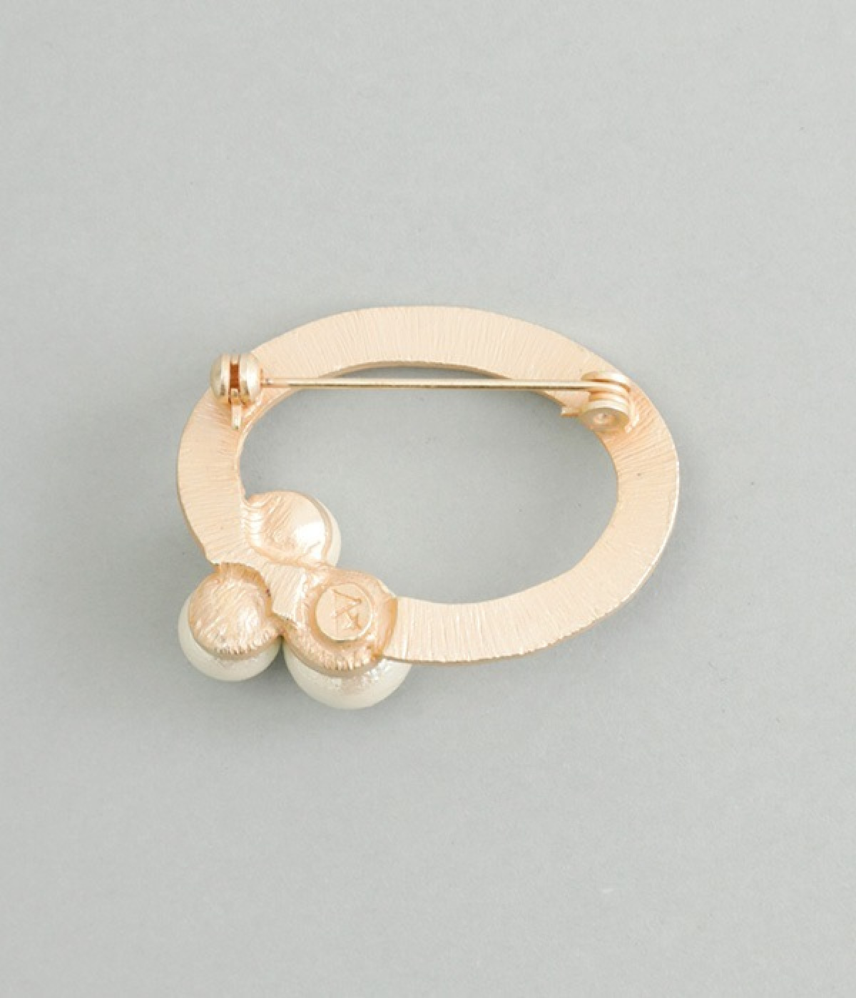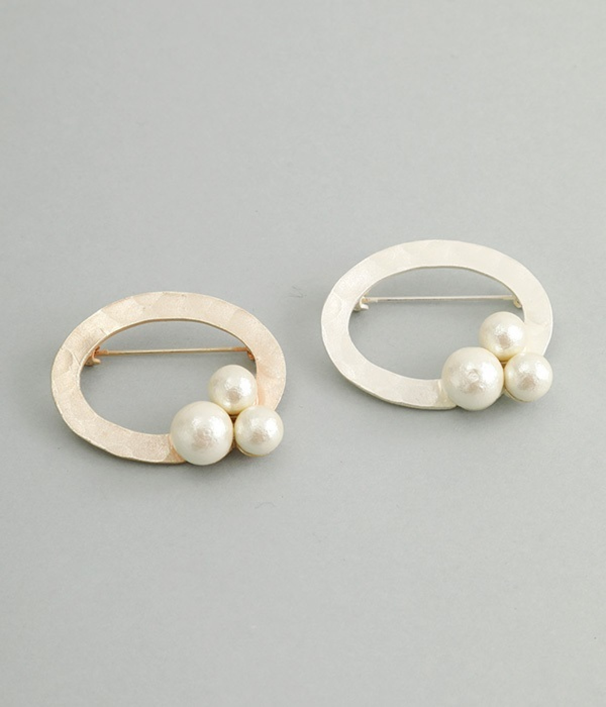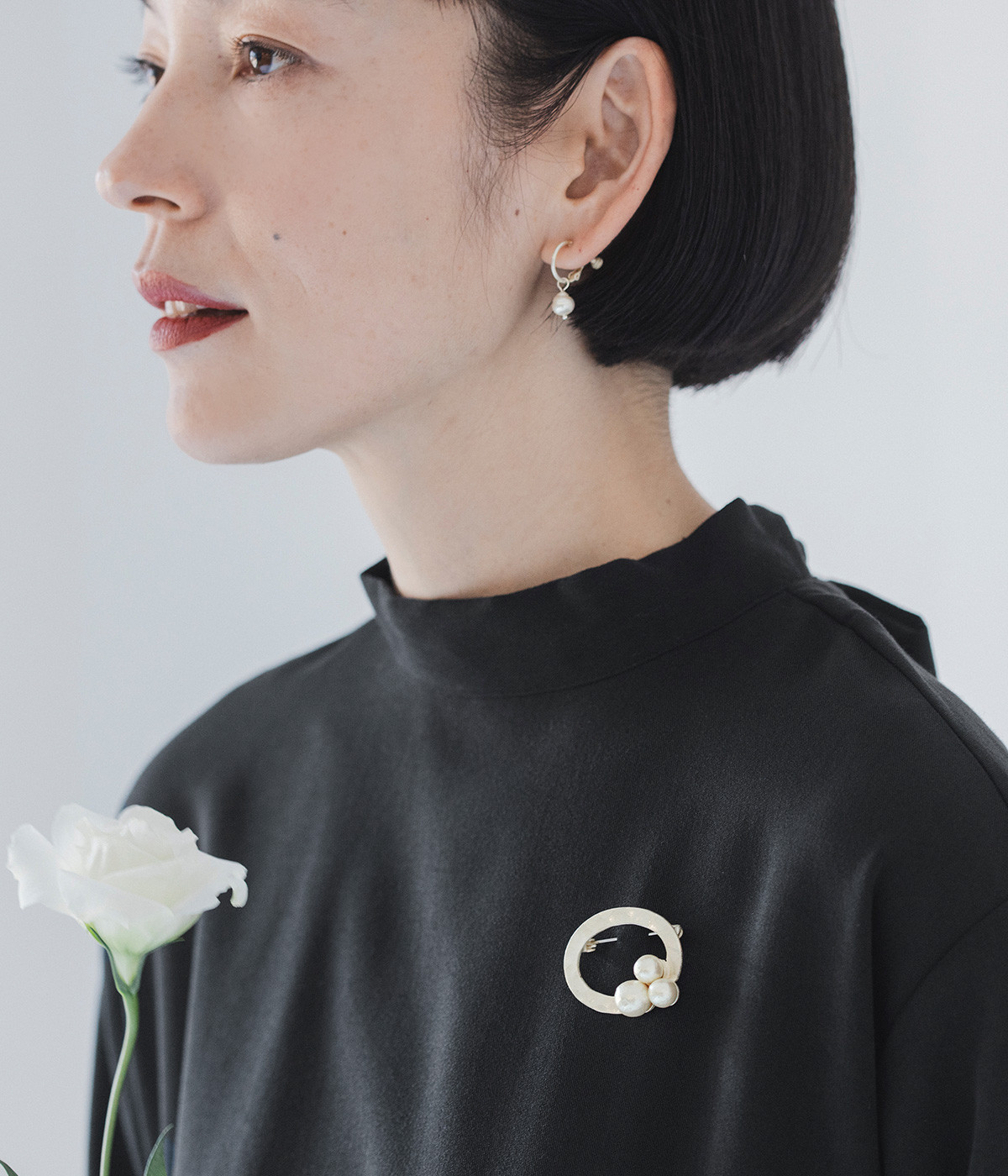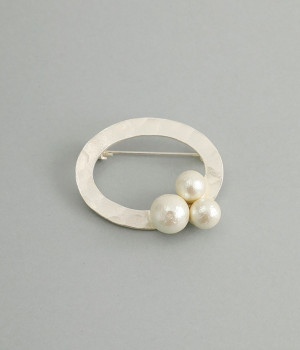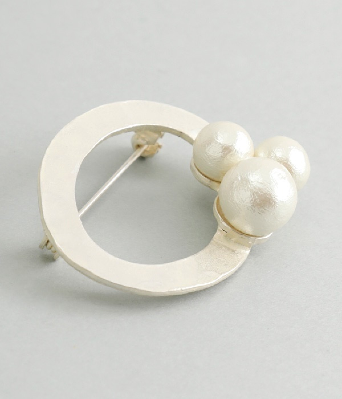 ツチメを施したオーバルプレートに、大小異なるコットンパールをワンポイントにしたブローチです。アンティーク調の土台に輝きを控えめにしたパールが品のよい印象で、華美になりすぎずカジュアルな着こなしにもなじみます。特別な日の装いにもぴったり。手持ちのバッグやストール、帽子などにつけても素敵です。