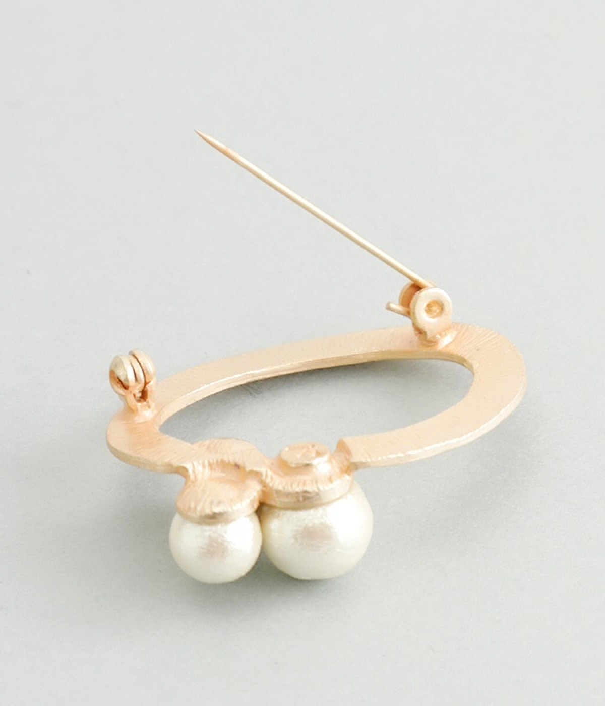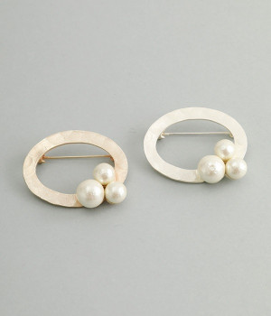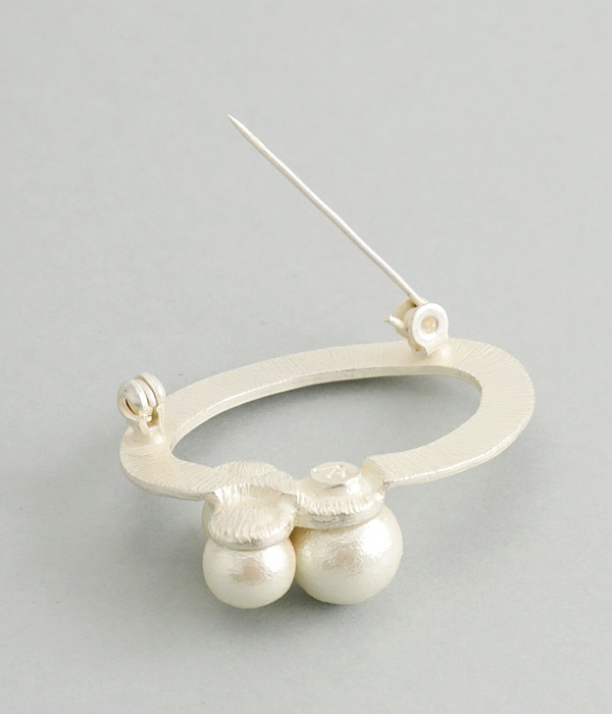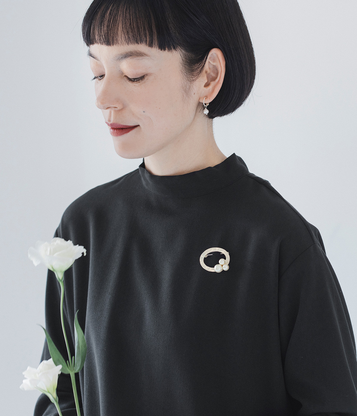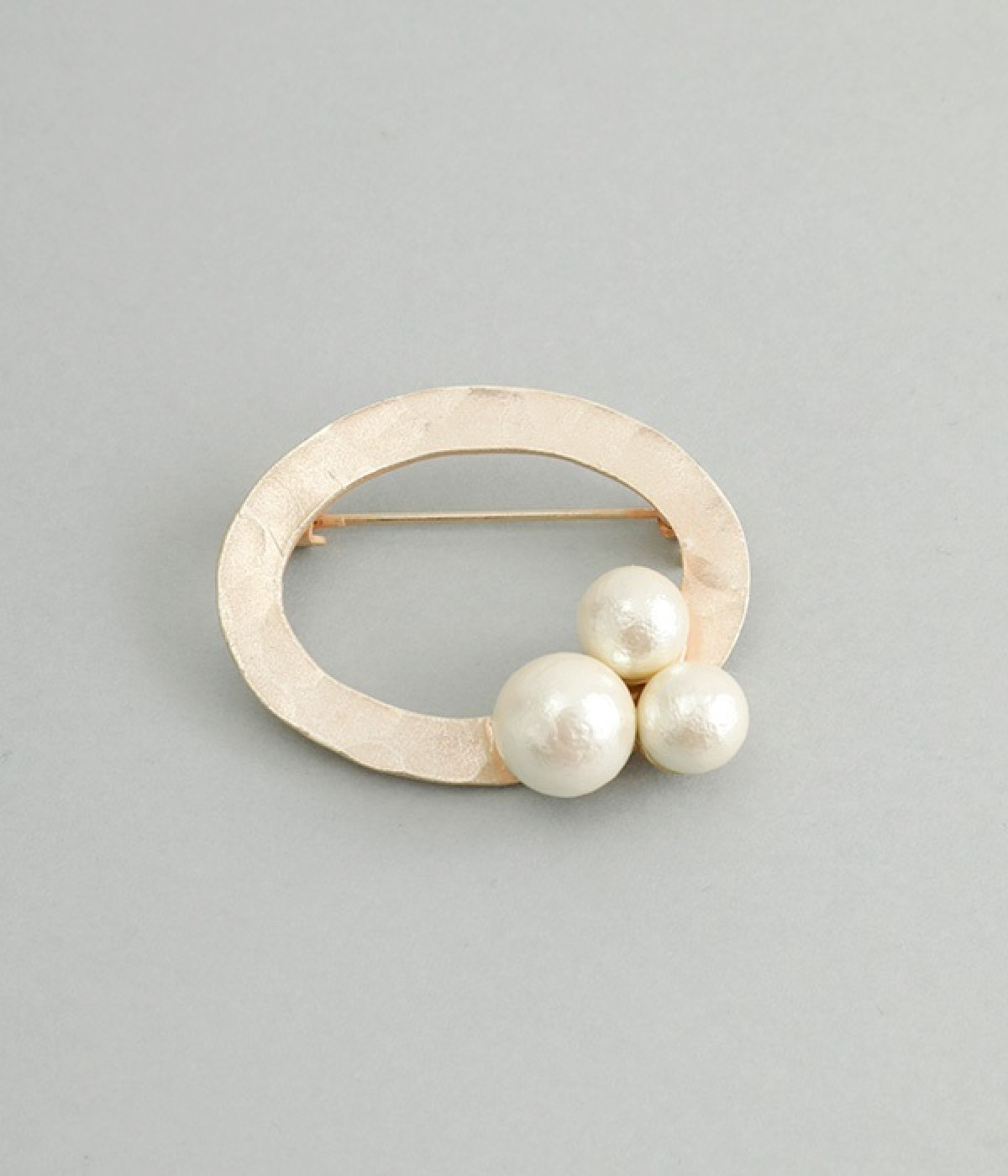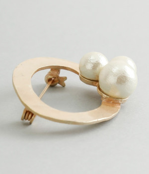 ツチメを施したオーバルプレートに、大小異なるコットンパールをワンポイントにしたブローチです。アンティーク調の土台に輝きを控えめにしたパールが品のよい印象で、華美になりすぎずカジュアルな着こなしにもなじみます。特別な日の装いにもぴったり。手持ちのバッグやストール、帽子などにつけても素敵です。