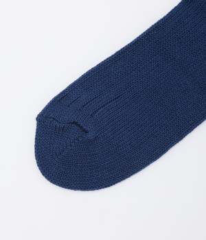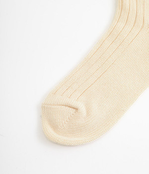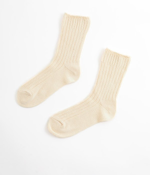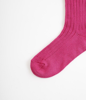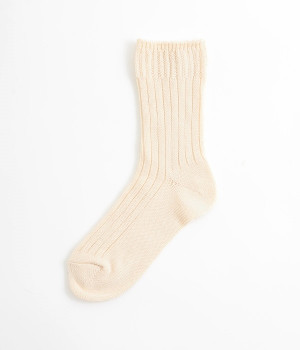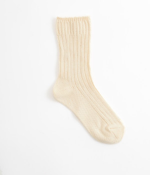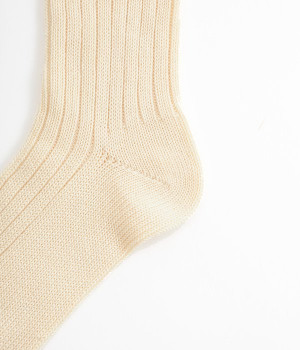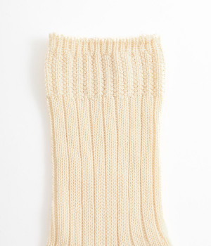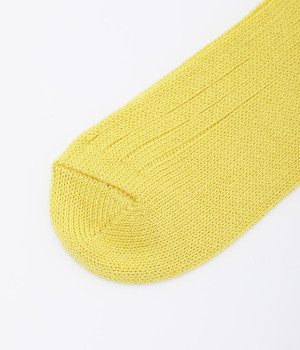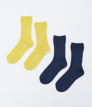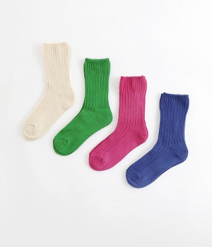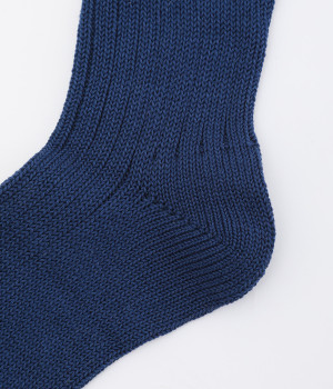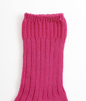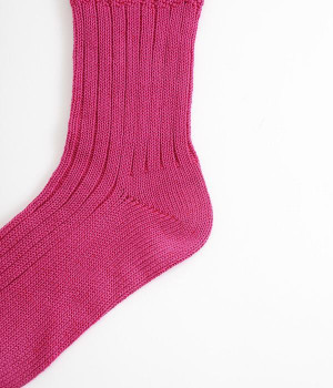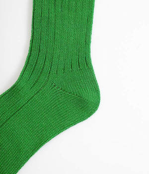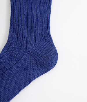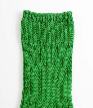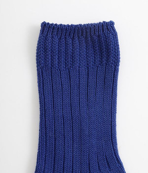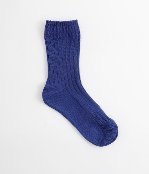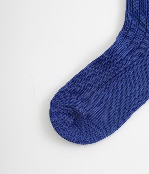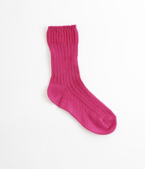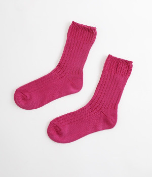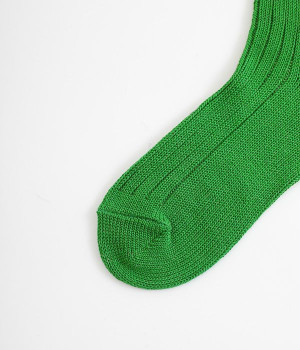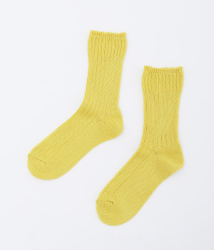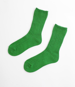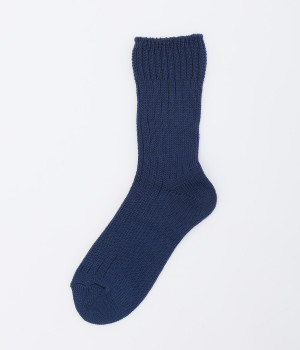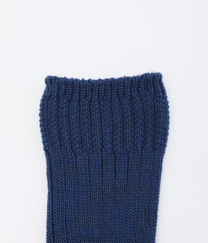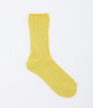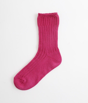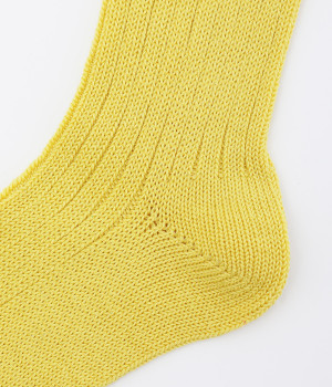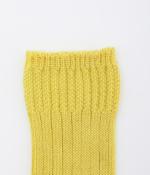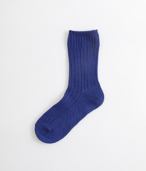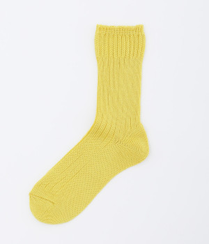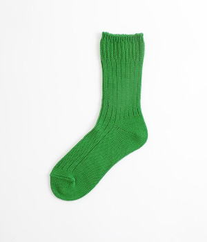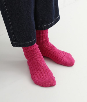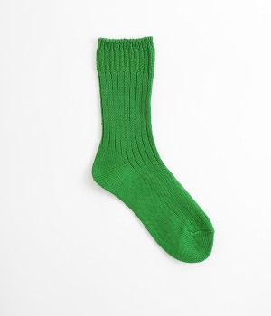 ざっくりとした風合いと、発色の美しさが魅力的。はき口の編み方に変化をつけた、使いやすいリブ編みソックスです。シルケット加工を施した、毛羽が少なく光沢のある綿糸を使用し、ほどよい厚みに編み立てました。さらりとした肌触りが心地よく、ロングシーズン快適に着用可能。ボトムを選ばない長さで、カジュアルスタイルの差し色にもおすすめです。