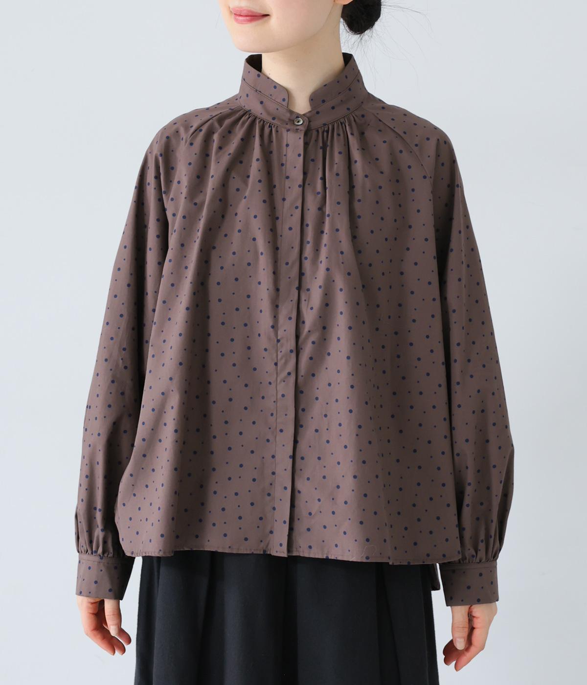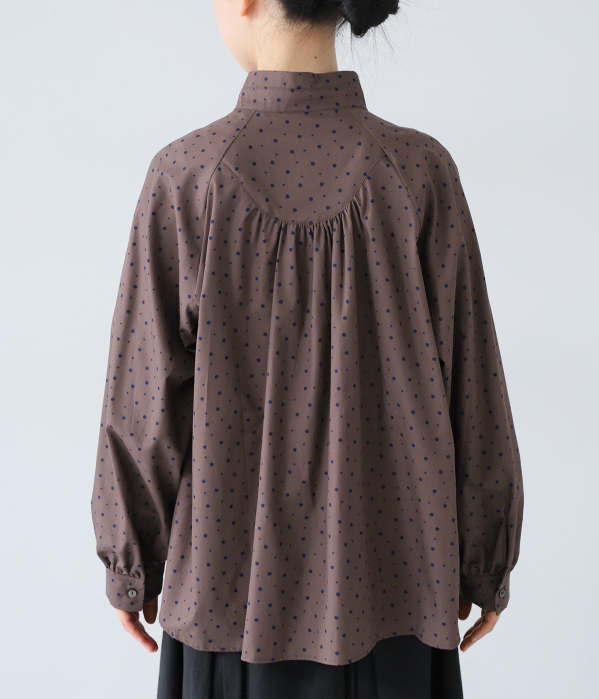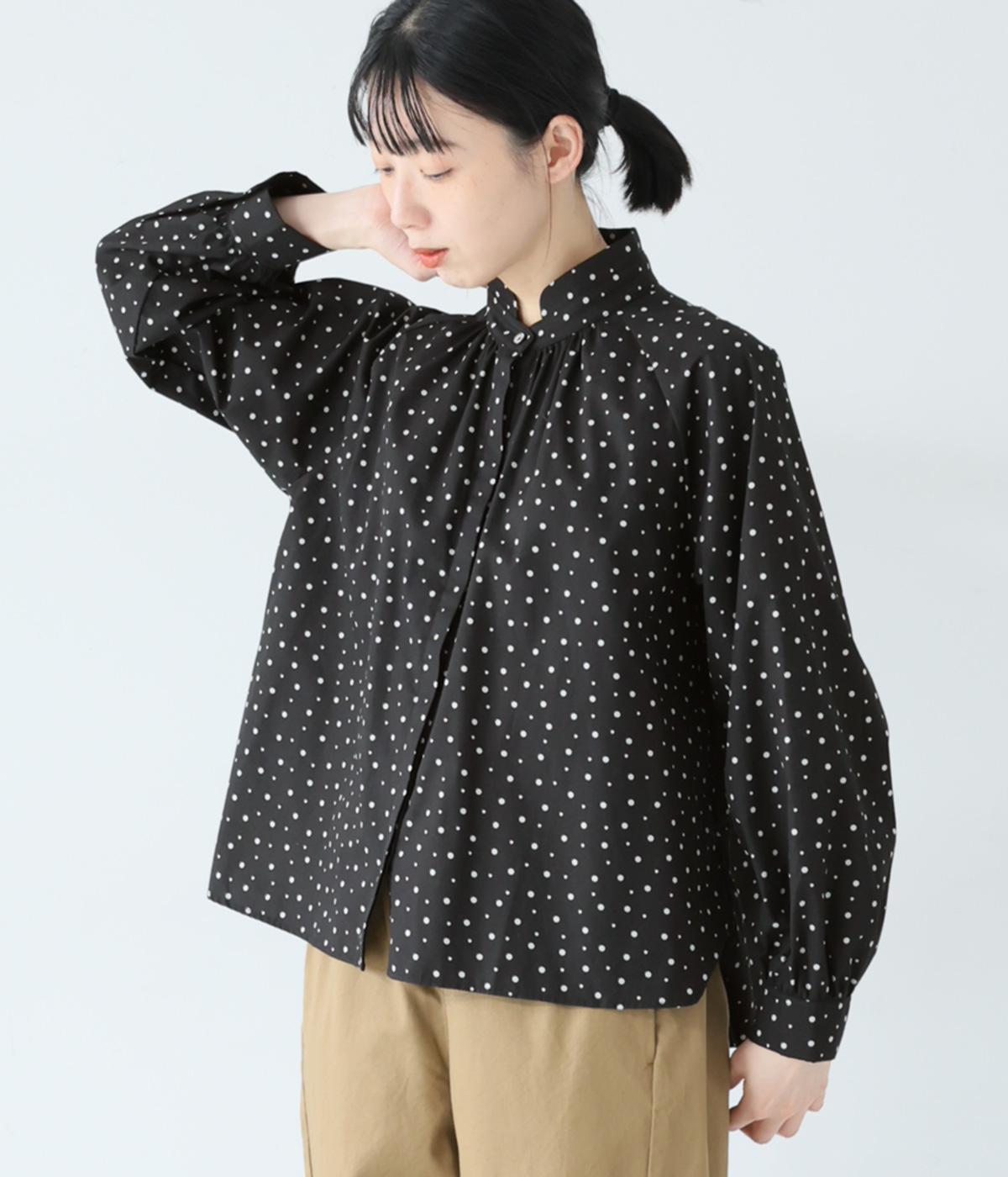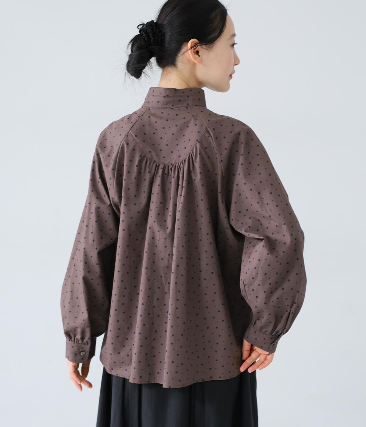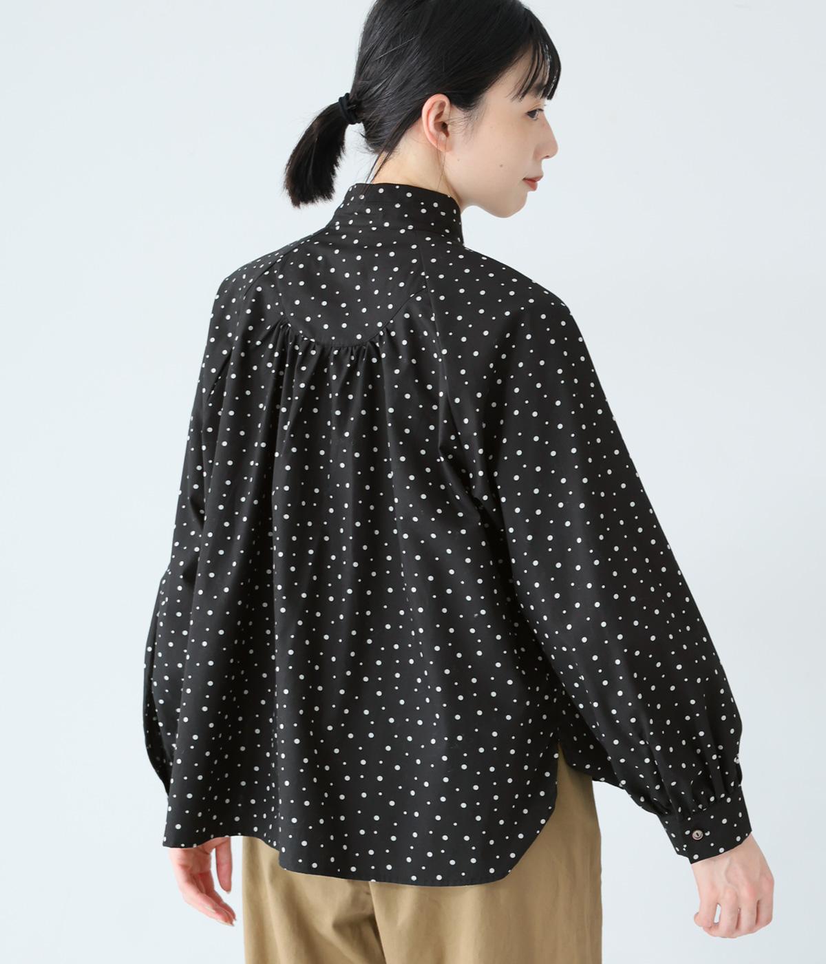 大きさの異なるドットをちりばめた大人フェミニンなブラウス。前後の身頃と袖にたっぷりとギャザーを入れて、どこから見ても華やかに仕上げました。クラシカルなスタンドカラーとシックな色合いで甘さを中和。前後差をつけたラウンドヘムもポイントです。